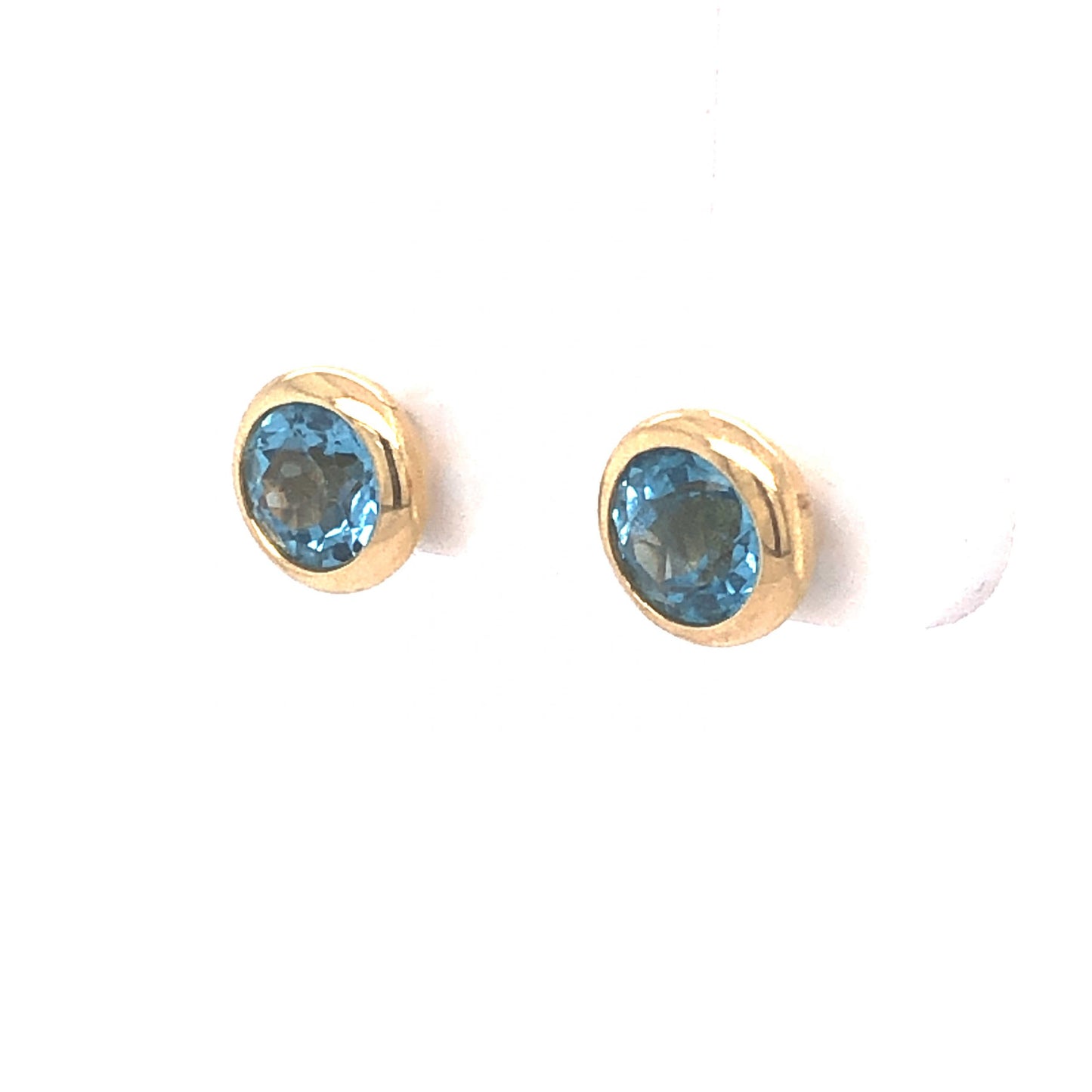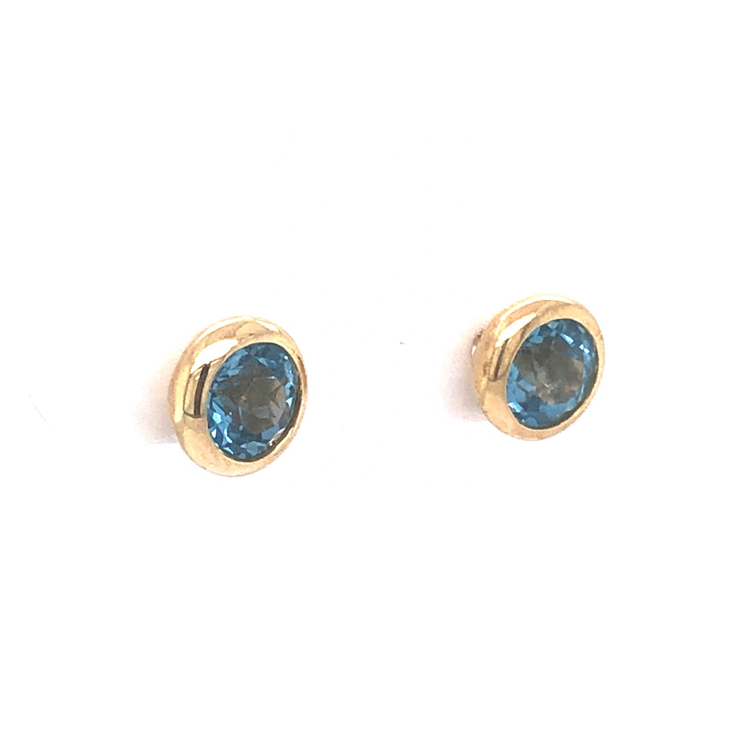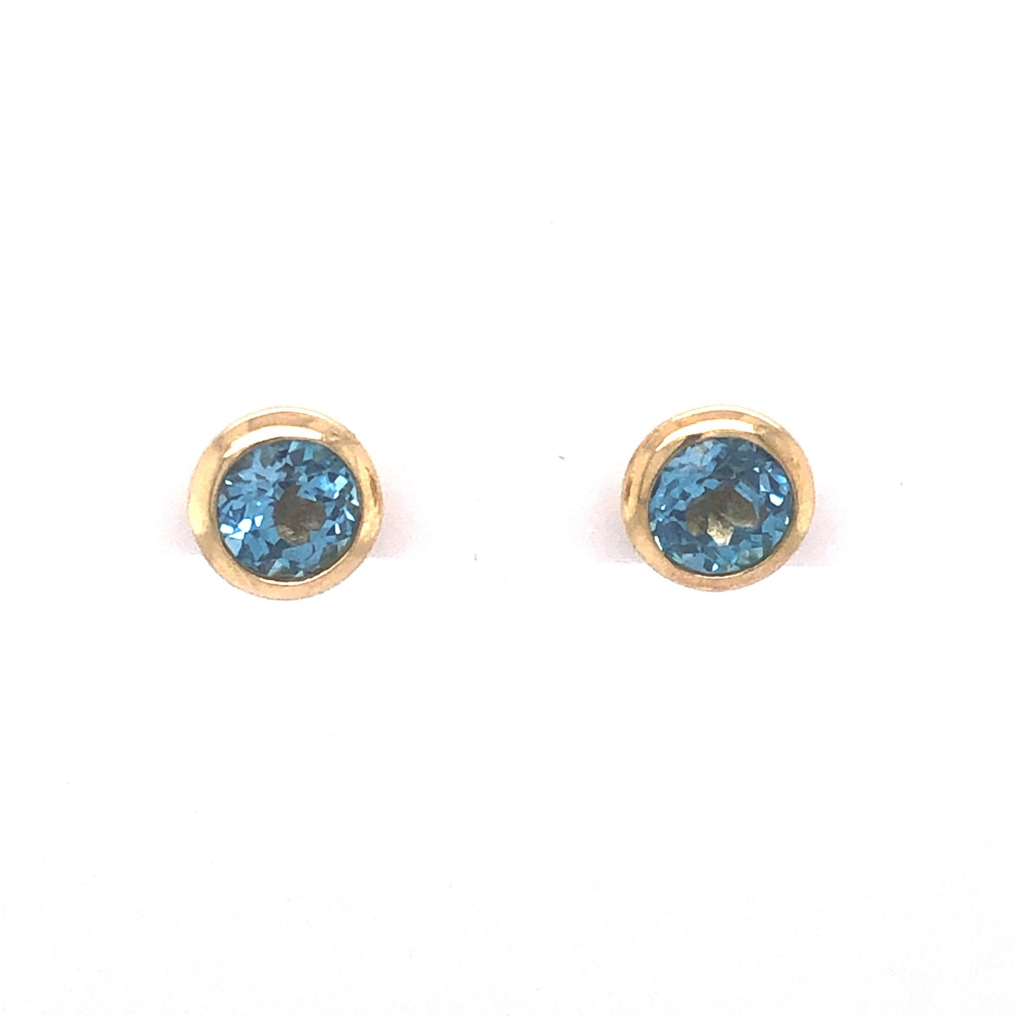 Bezel Set Blue Topaz Stud Earrings in 14k Yellow Gold. These blue topaz stud earrings in 14 karat yellow gold will take your breath away! Two (2) 1.30 carat blue topazes are securely set in yellow gold bezels. The stones have a vibrant, sky blue hue. A perfect gift for any occasion, these studs will leave a lasting impression with their unique and beautiful blue color!