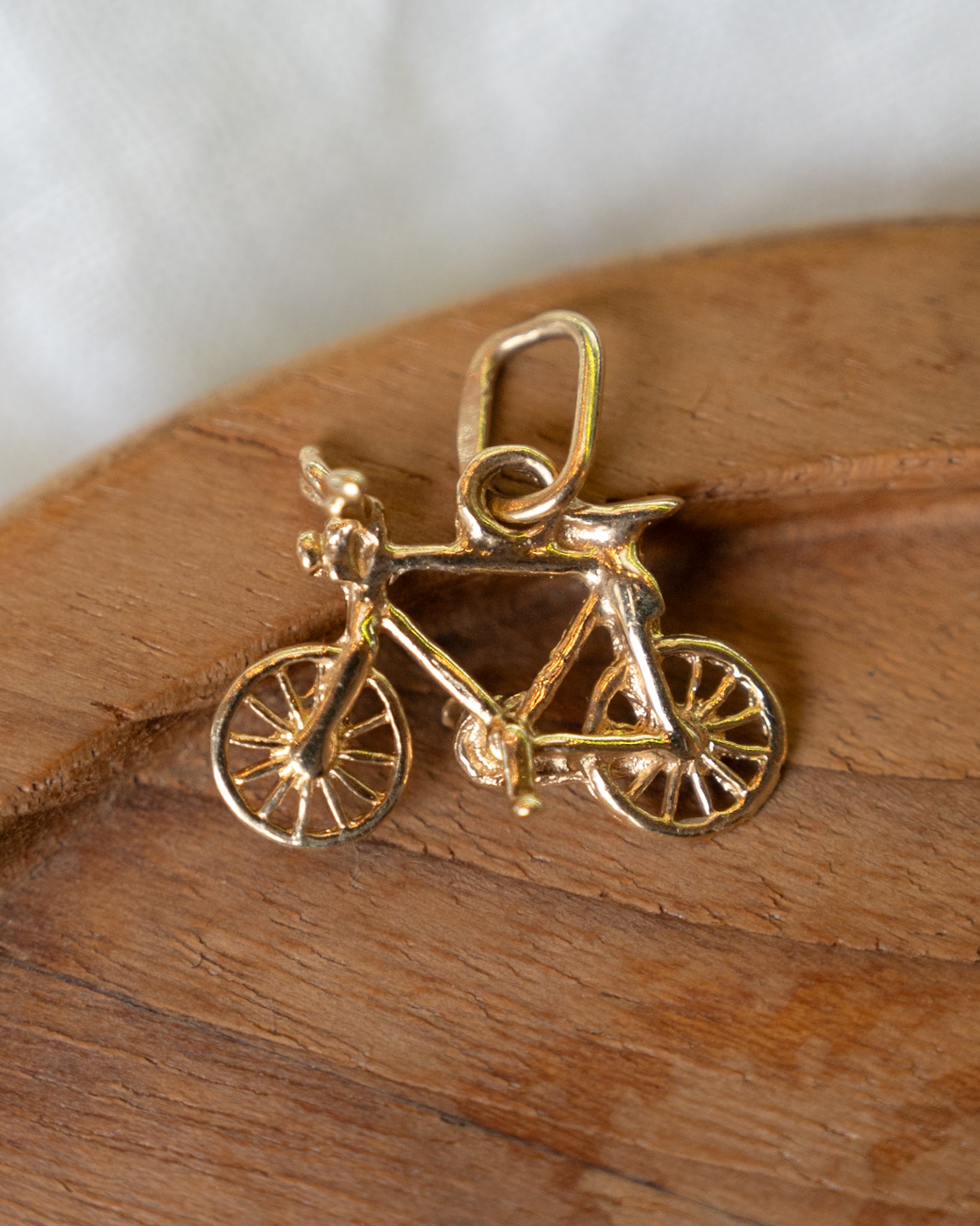 This bicycle charm is made from 14-karat yellow gold and features detailed metalwork that captures the recognizable form of a bicycle including wheels, frame, and handlebars. The charm can be attached to necklaces as a pendant or added to charm bracelets.