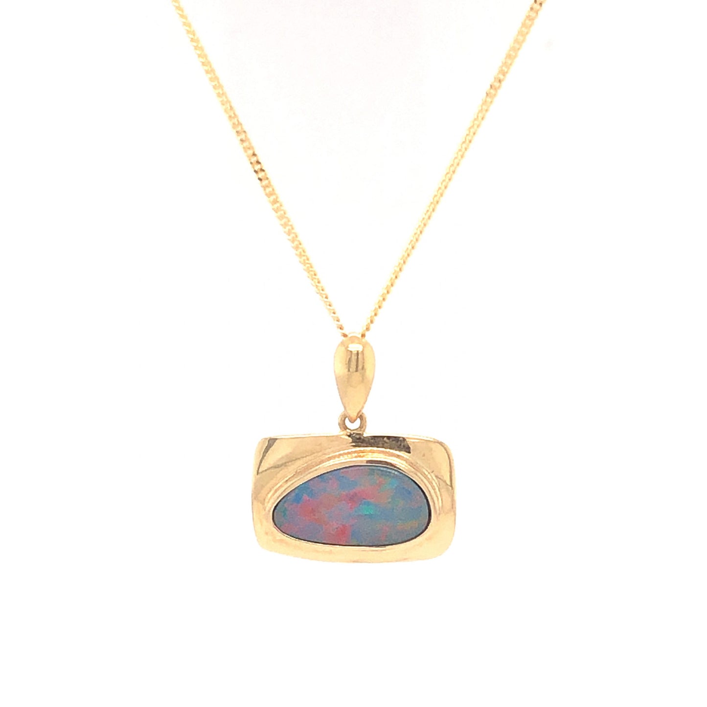 This breathtaking pendant necklace features a black boulder opal in 18 karat yellow gold. The center opal features a dark spectrum of iridescent colors. The gemstone is fitted in a geometric pendant made of polished 18 karat yellow gold. The pendant comes complete with a classic 14 karat yellow gold chain necklace.