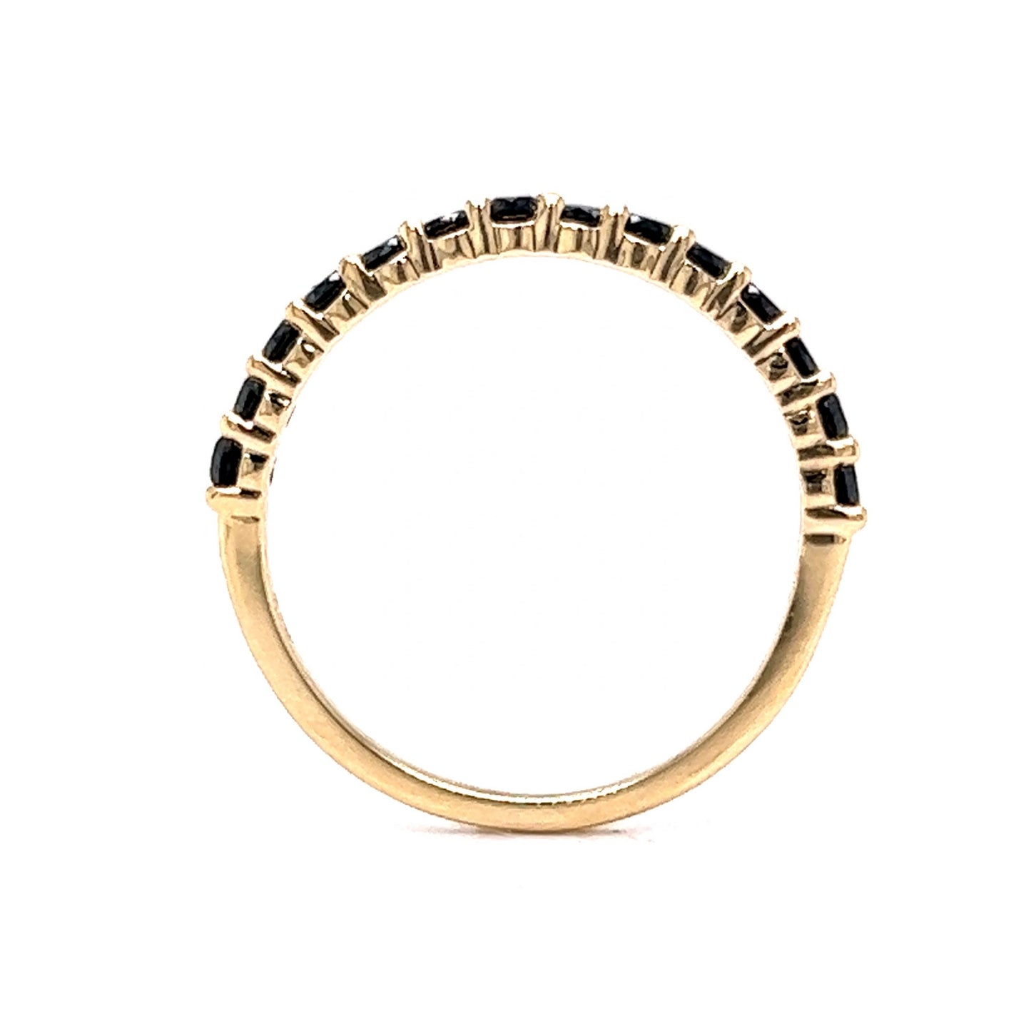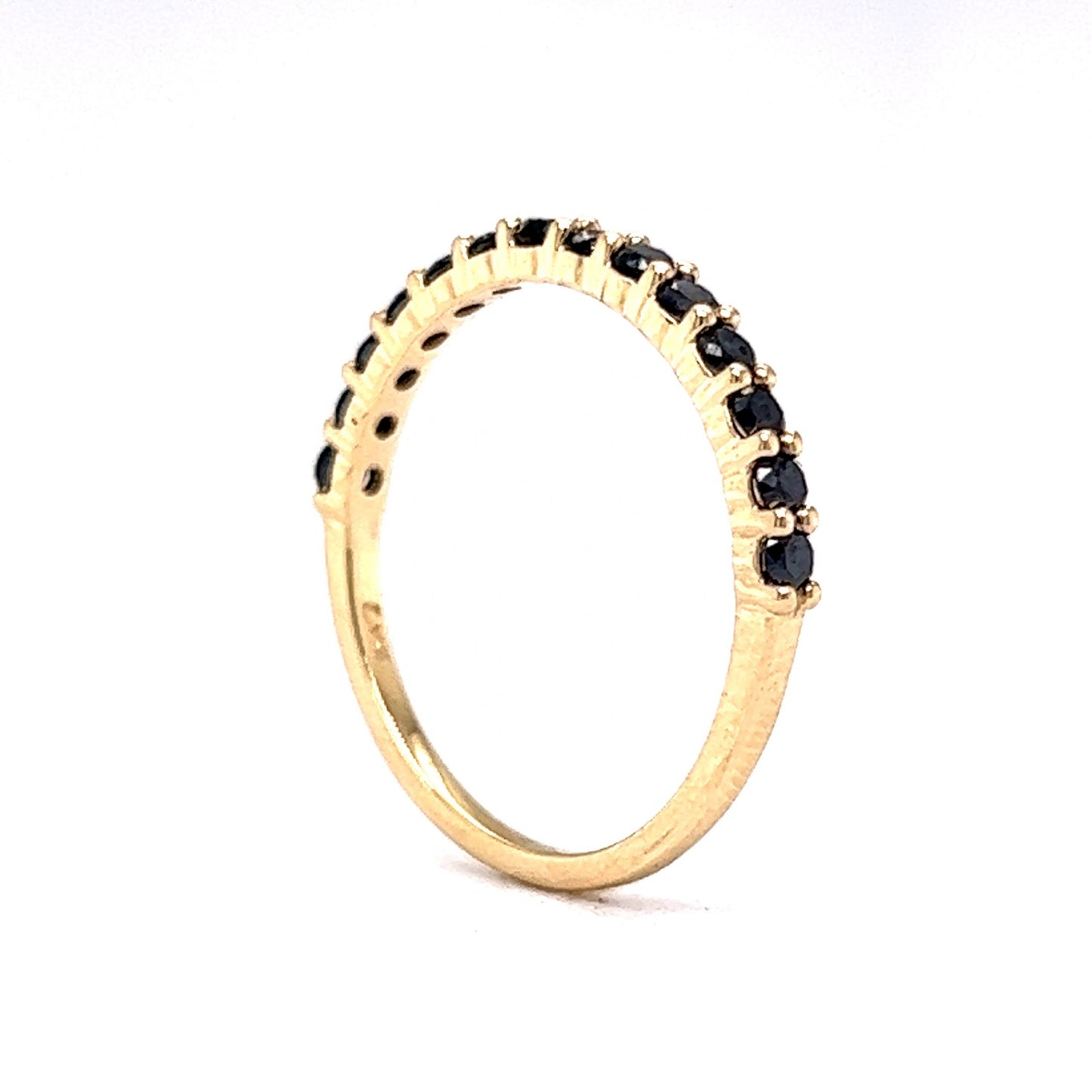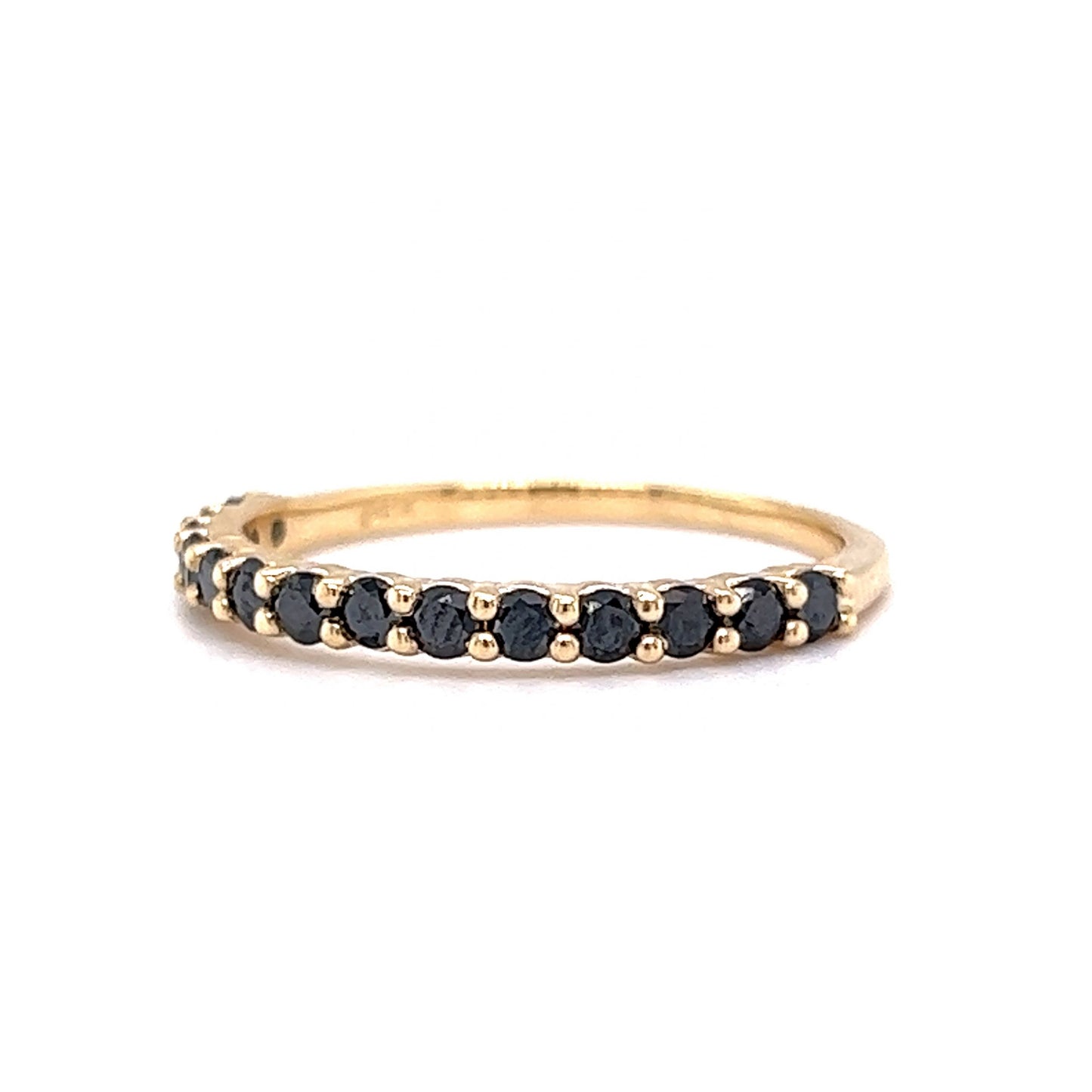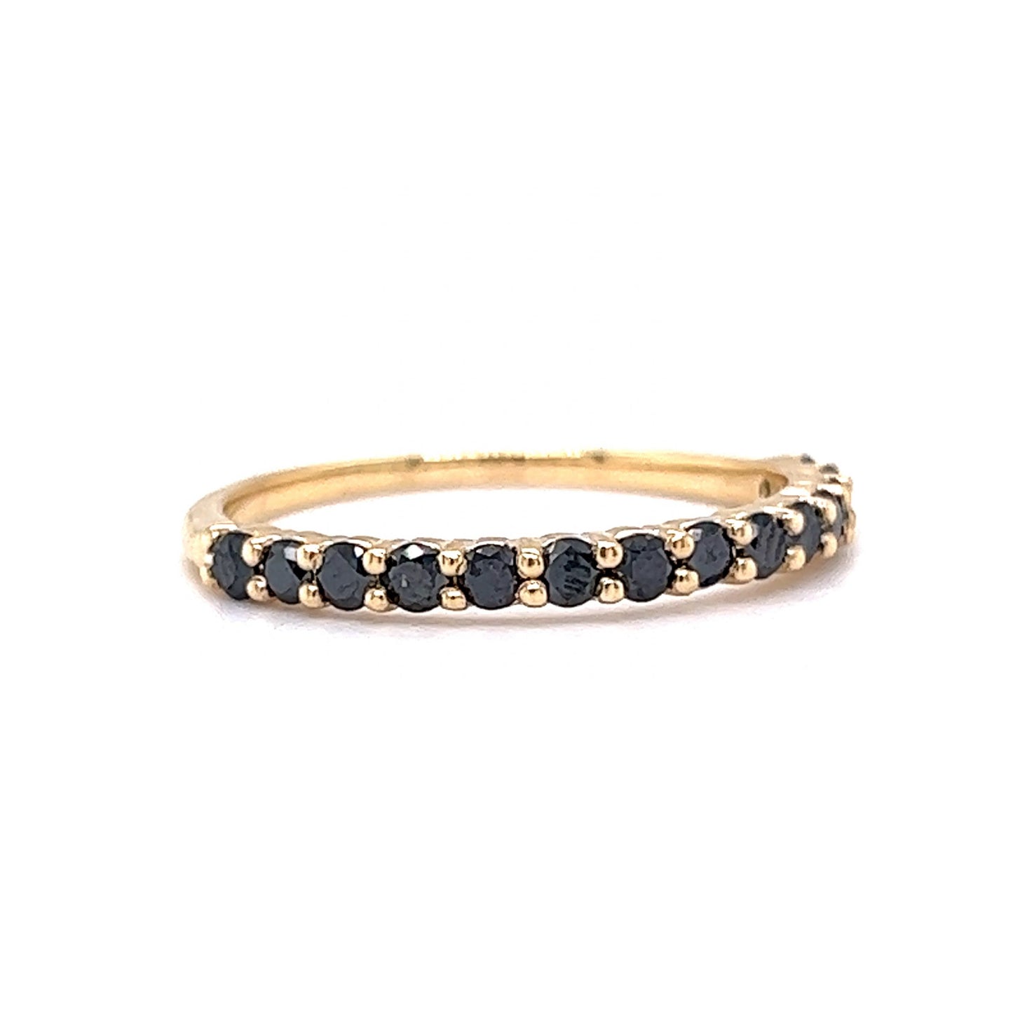 This striking diamond wedding band features black diamonds in 14 karat yellow gold. A half-eternity diamond ring with fashion sense! Fourteen (14) Round Brilliant cut black diamonds decorate the front of the band. Easy to stack with most styles of engagement rings. Modern scintillating.
