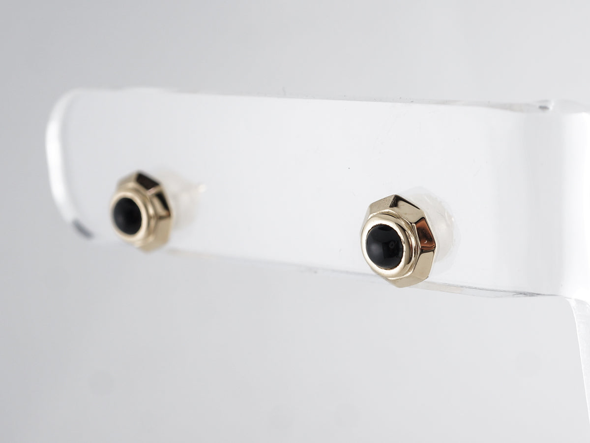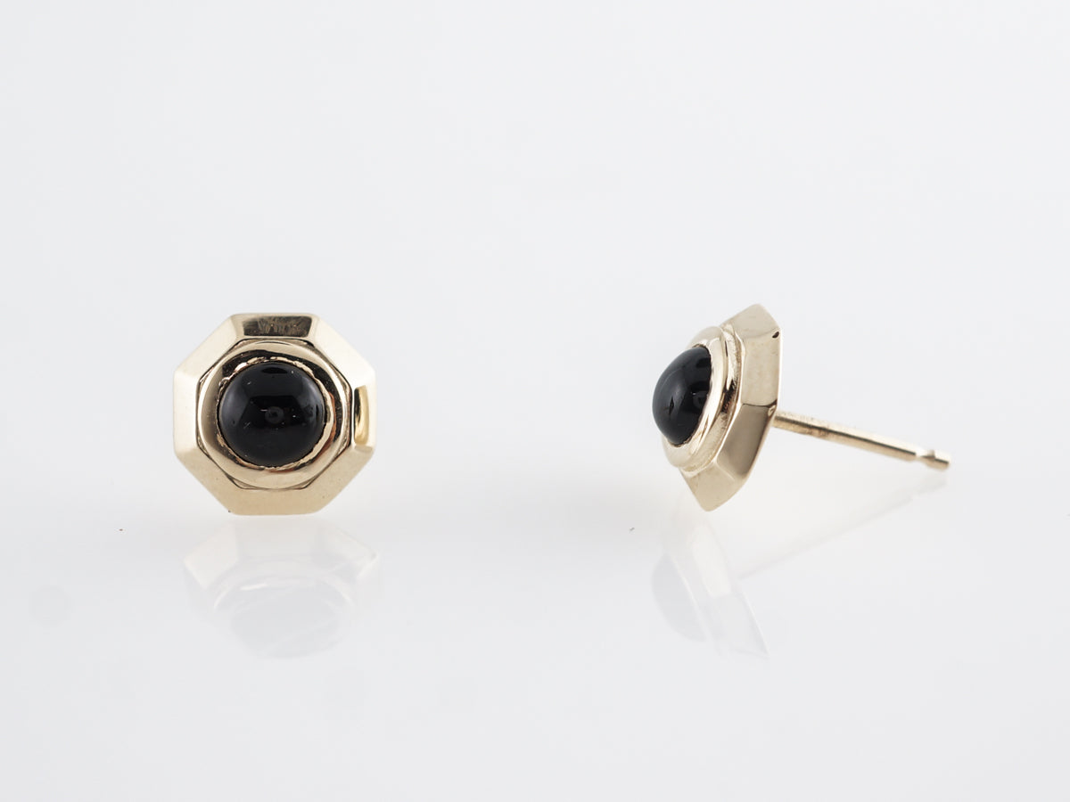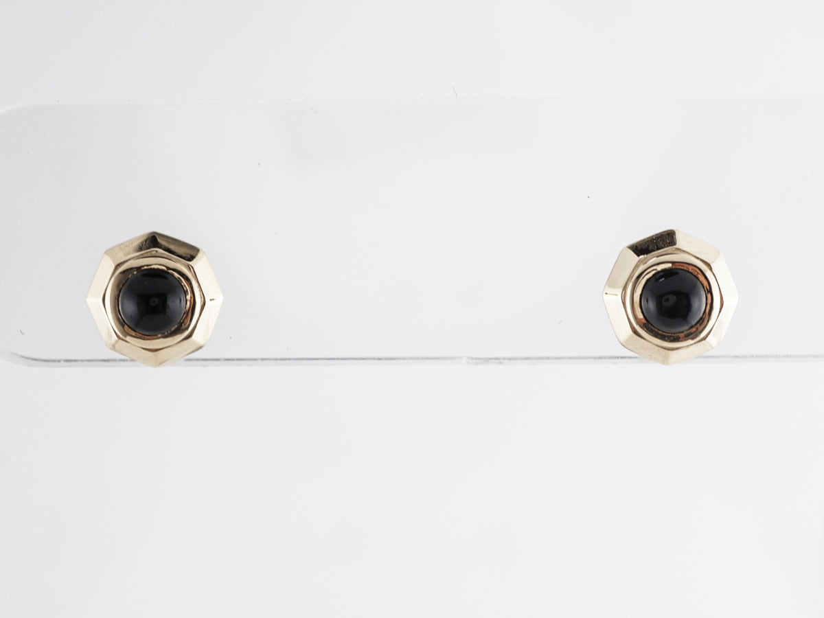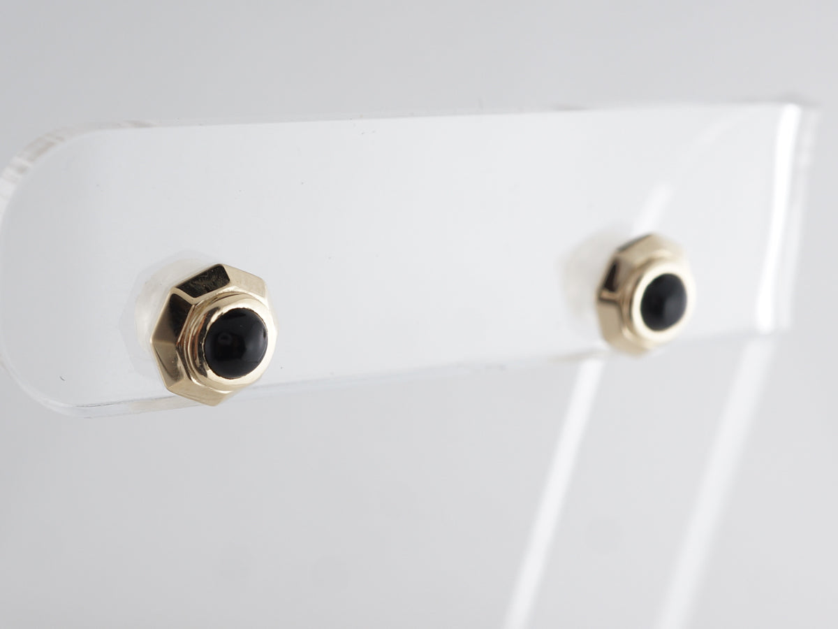 Black Onyx Earring Studs in 14k Yellow Gold. These simple petite black only ear studs are sure to be a staple in your wardrobe. The high polish 14 karat yellow gold octagonal shaped earring are set with onyx cabochon domes. These post earrings measure approximately 1/4 of an inch in diameter.