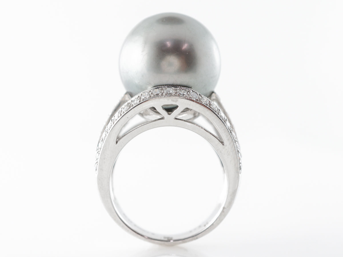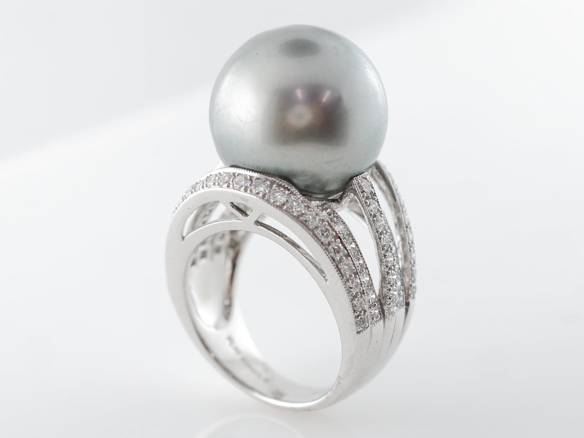 Black Pearl Diamond Cocktail Ring in Platinum. This modern ring features a stunning black pearl set in platinum among 1.26 carats of round brilliant cut diamonds. The shank splits five times and each are adorned with lines of round diamonds leading to the black pearl. This is a fabulous cocktail ring with a color palette that makes it extremely versatile and a ring you will wear often.