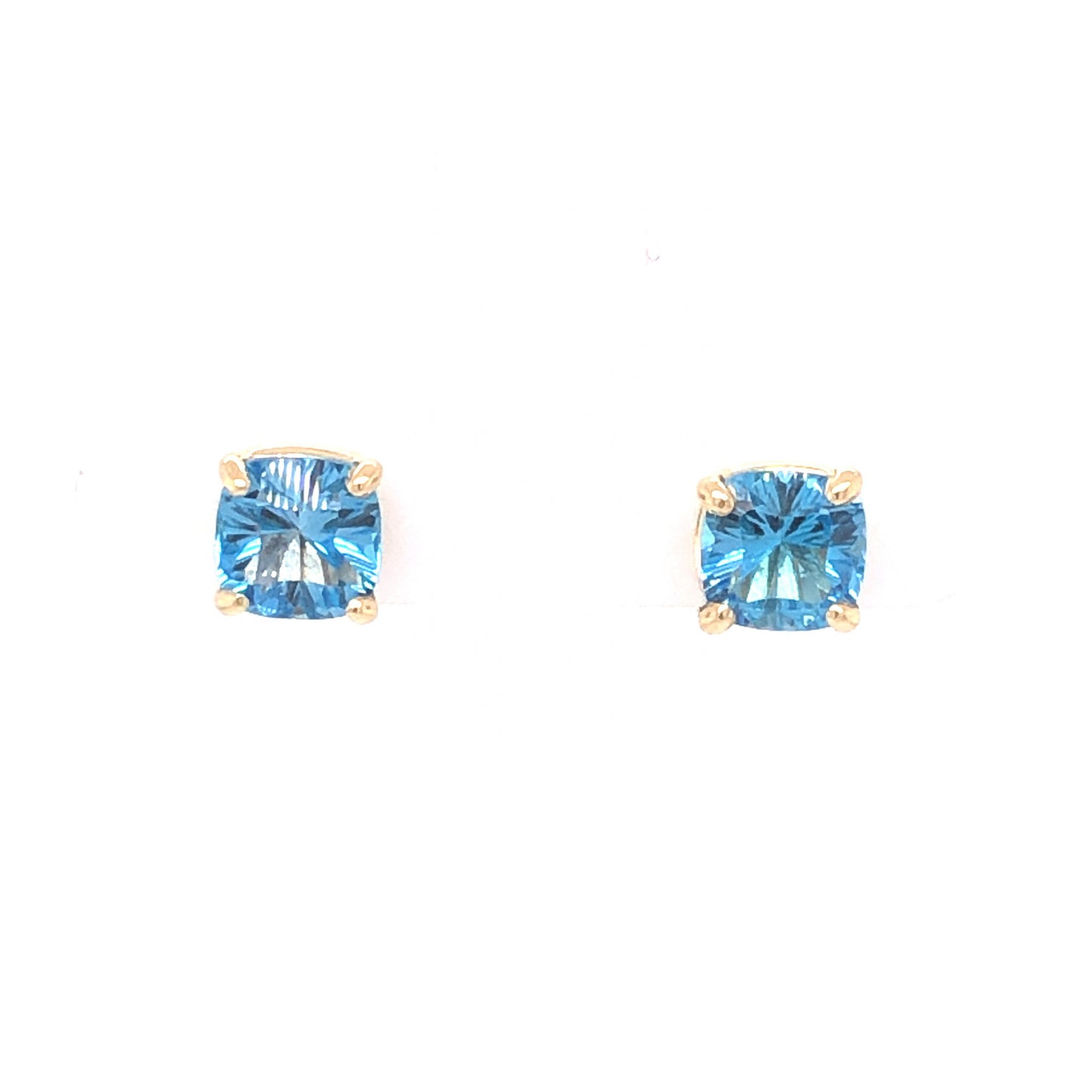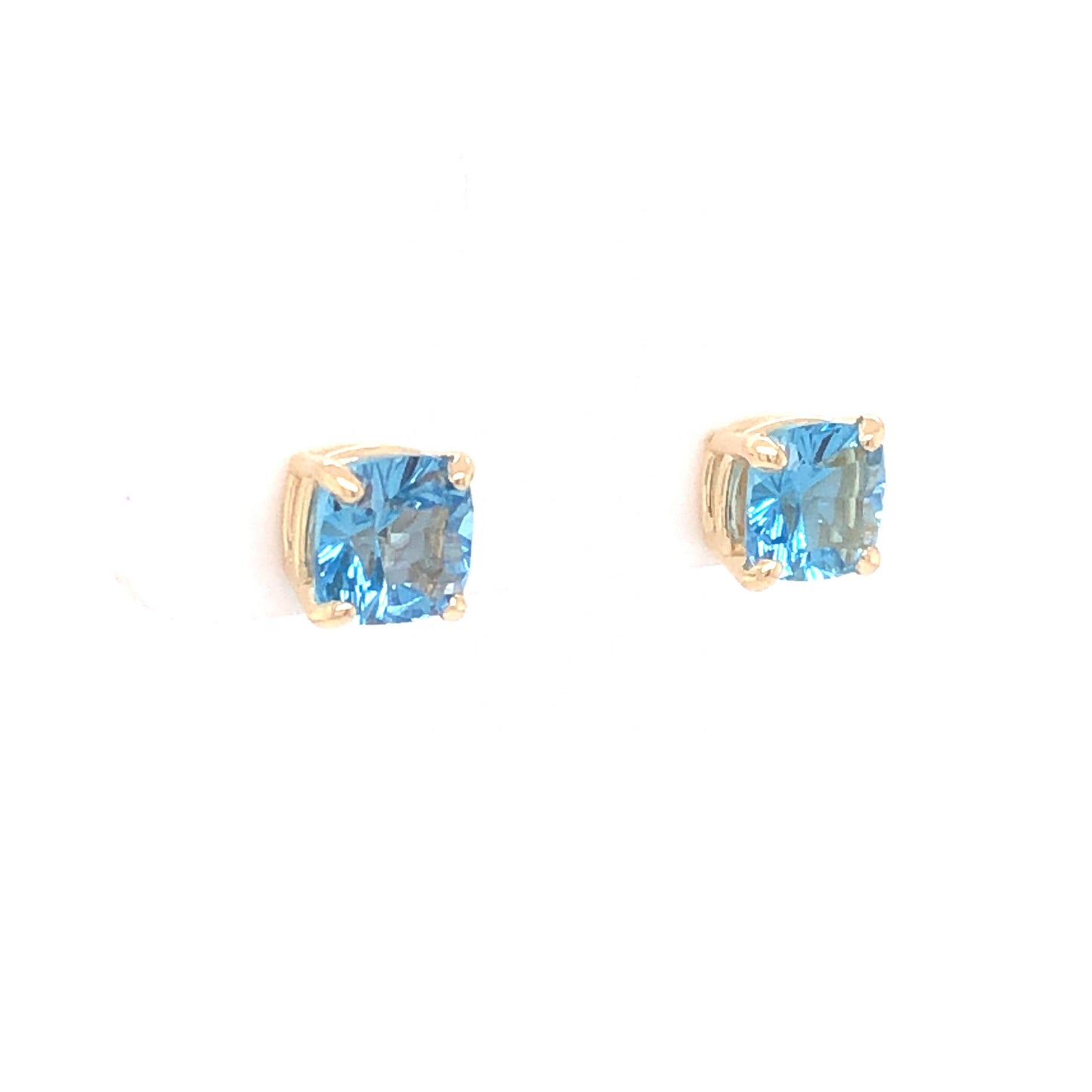 Blue Topaz Stud Earrings in 14k Yellow Gold. For a set of dreamy studs that pair well with any look, these blue topaz earrings will take your breath away. Totaling 2.12 carats in weight, each topaz is set in secure prongs of 14 karat yellow gold. The gems have an electric, icy blue hue and feature facets that scintillate when touched with light. These studs would make a fabulous gift for anyone with a birthday in the month of December!