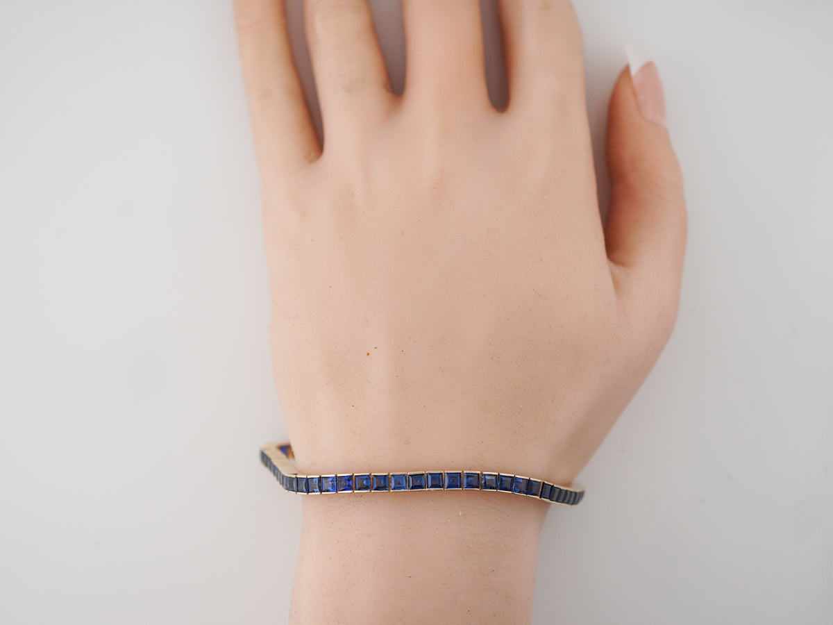 This immaculate modern bracelet features 12.10 carats of step cut sapphires. Fifty-five (55) stones adorn the piece and the blue sapphires are set in 14k yellow gold. The yellow gold provides an alluring contrast of color that lends to the eye-catching appeal of this wondrous modern piece.