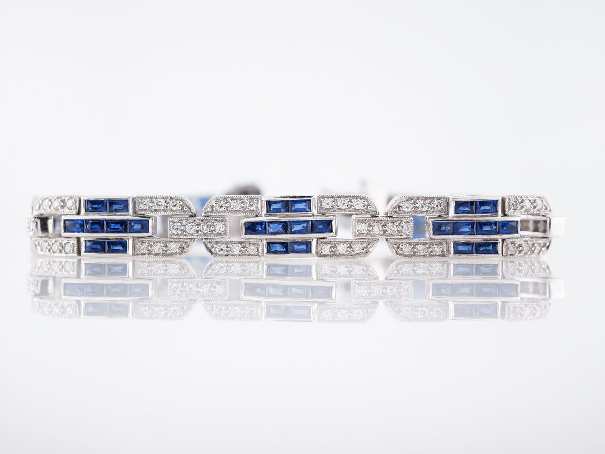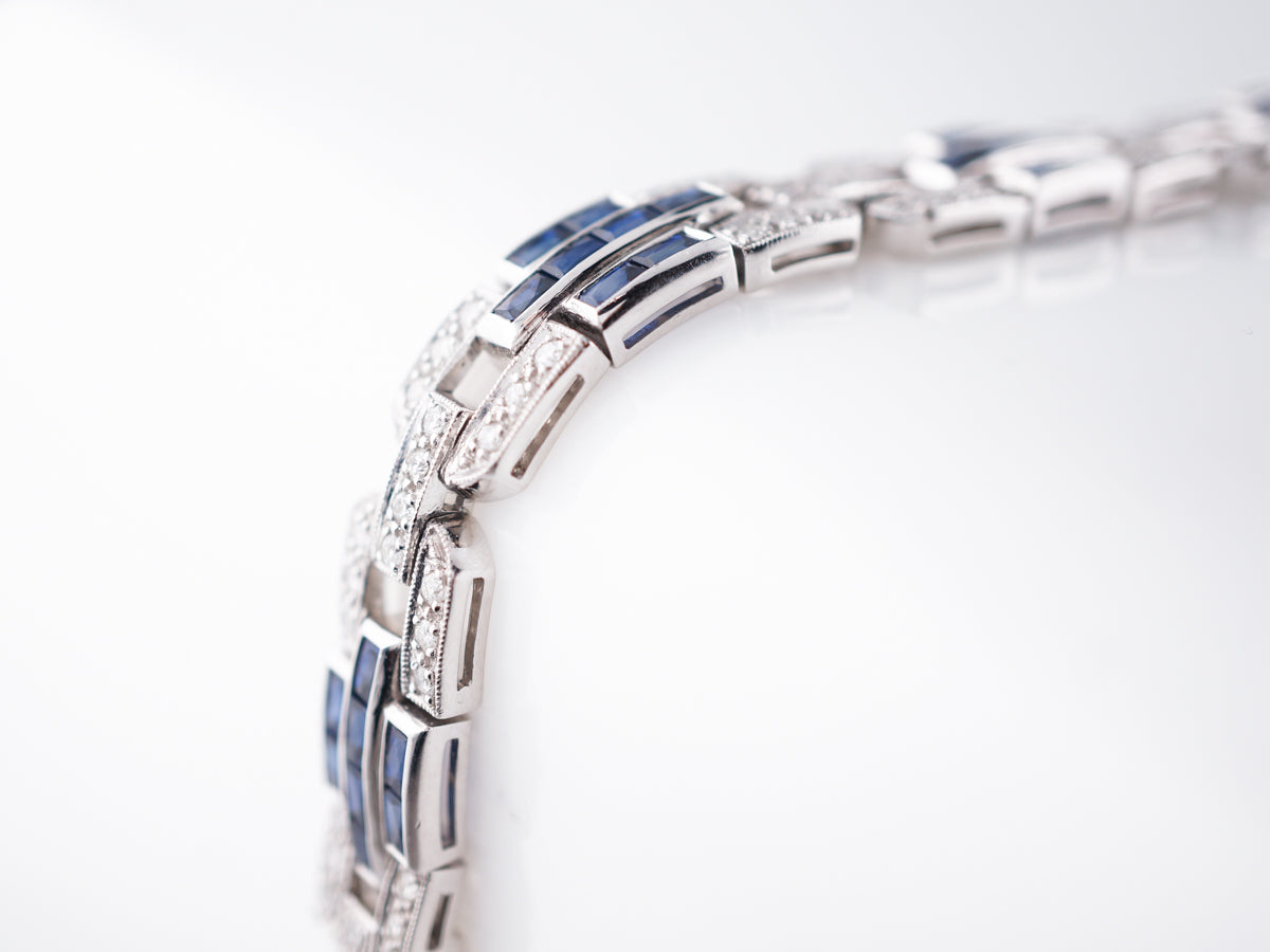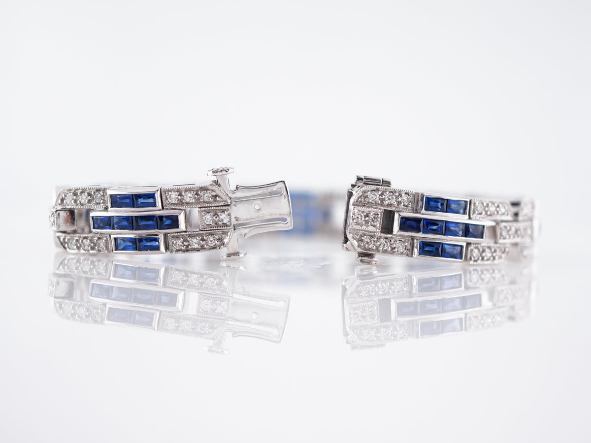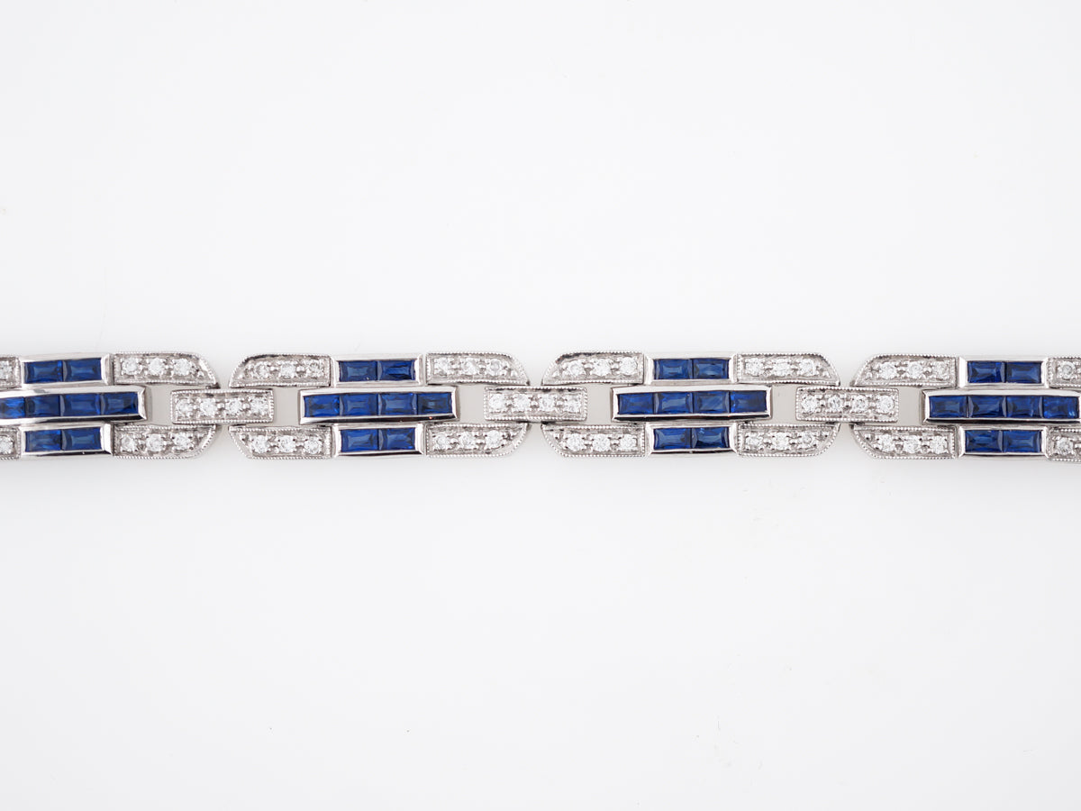This bracelet is Modern but its linear look and combination of diamonds sapphires reminds us of Art Deco designs. Every other link of this stunning bracelet is a combination of round brilliant diamonds and French cut sapphires. Those links are connected to each other by links that are made with all diamonds. This platinum piece has 2.14 carats total in diamonds and 9.50 carats of blue sapphires! The diamonds are bead set and the sapphires are all surrounded by bezels. This is a wonderful Modern piece with excellent quality gems. It also gives a nod to the magnificent designs of the 1920s.
