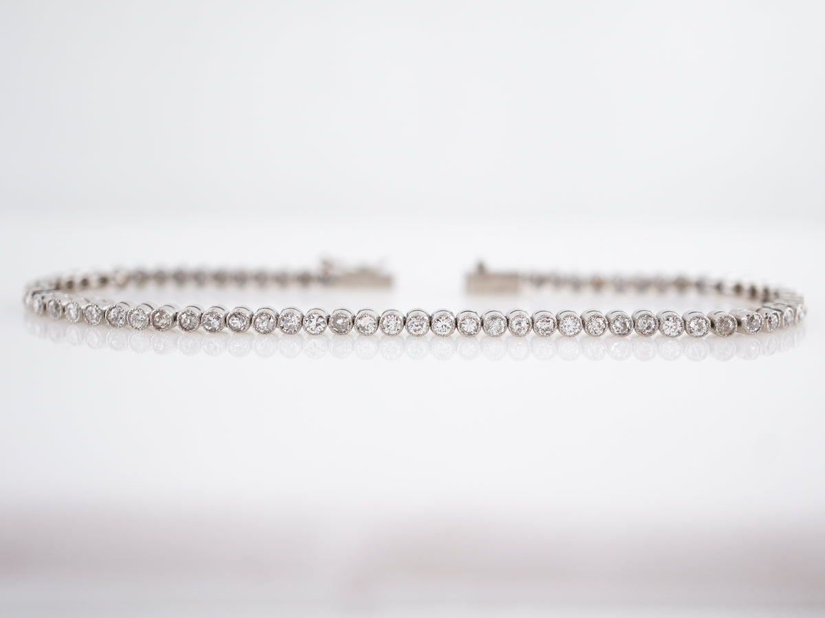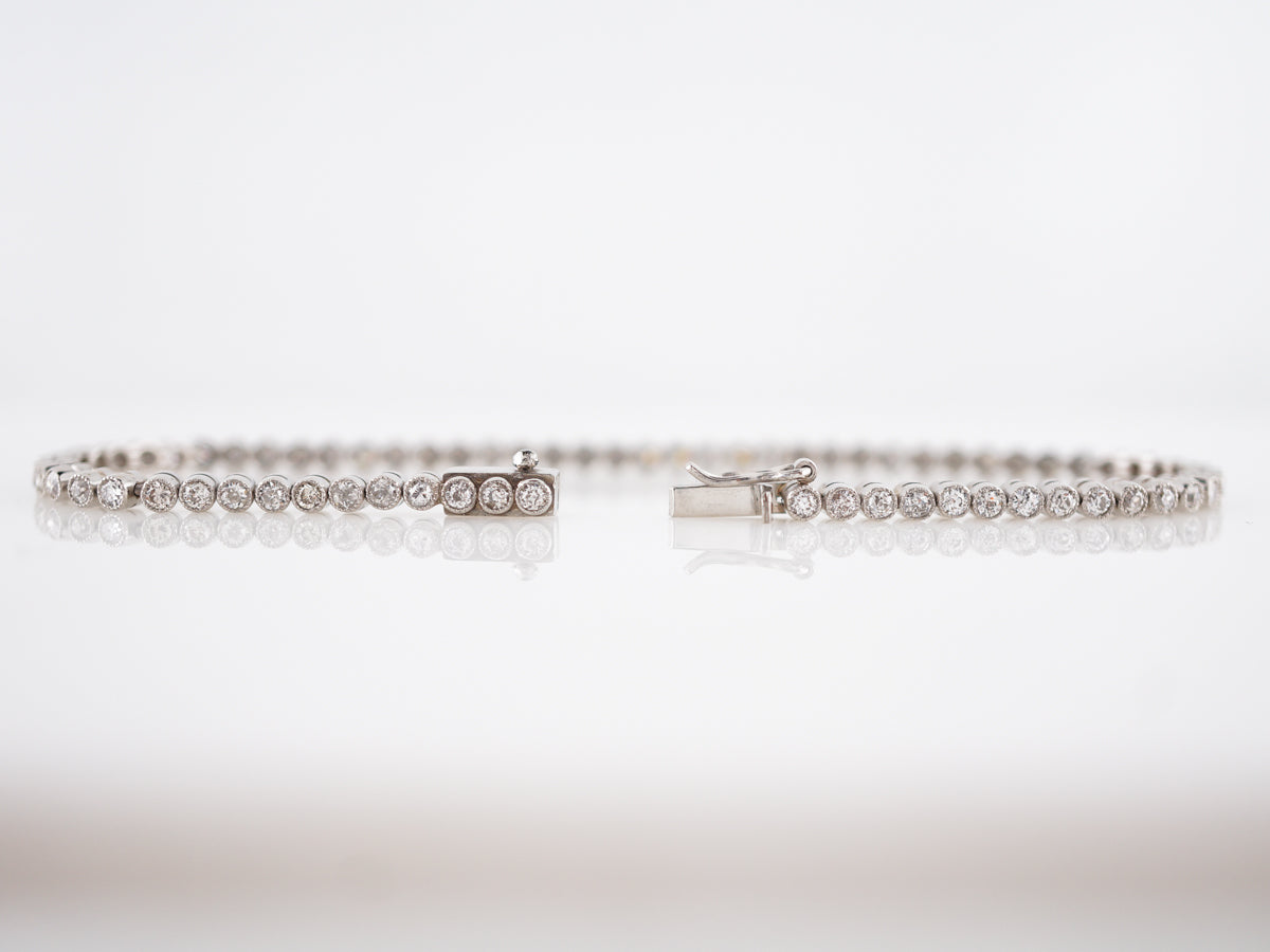 This modern line style platinum bracelet has 2.51 carats of sparkling old European, round brilliant and single cut diamonds. Each diamond is set in an individual bezel that is bordered with milgrain detail. The bracelet is lightweight yet shimmers with every turn of the wrist. This versatile piece can be worn when either dressing up or in a casual setting and is a wonderful addition to any collection.