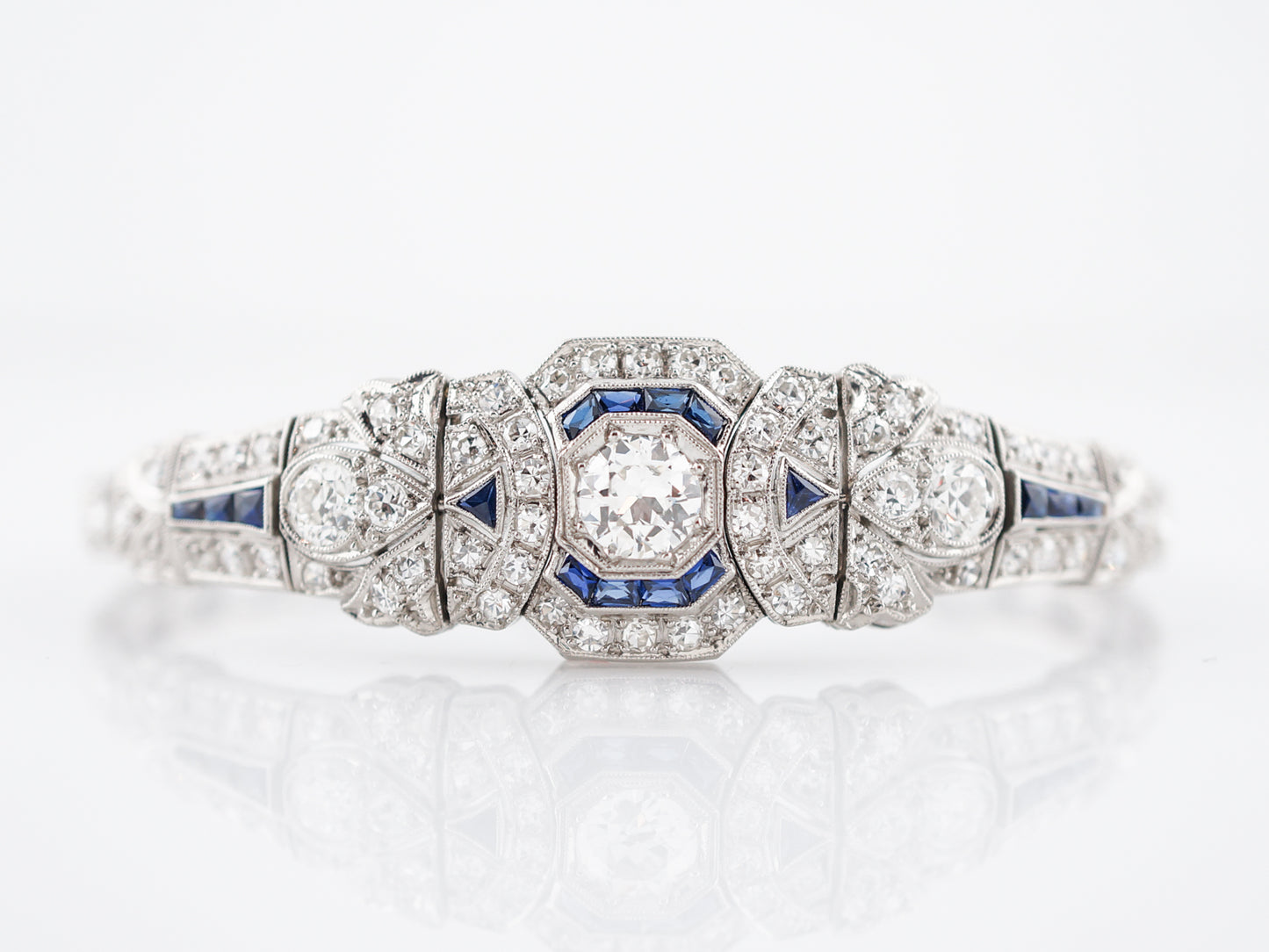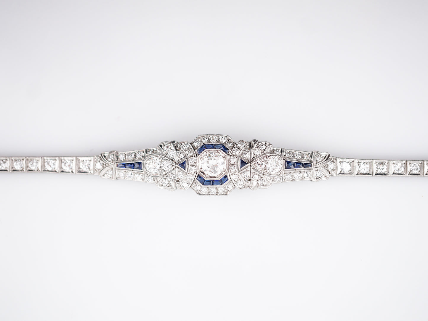 This Modern bracelet is a exquisite take on Art Deco designs. It is made with a combination of dazzling Old European cut diamonds and calibre cut sapphires to set off the bright, white diamonds. The center diamond is set into a decorative octagonal bezel which was common in jewelry from the 1920s and 1930s. The sapphires in this platinum bracelet were cut specifically to fit into this special piece. The layout of the accent sapphires creates a geometric look that is a hallmark of Art Deco era jewelry. Every inch of this amazing bracelet is covered in gemstones so it sparkles from every direction.