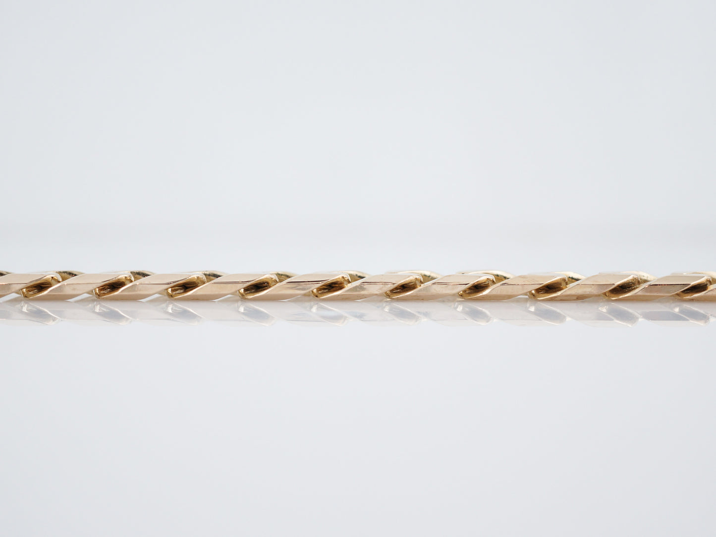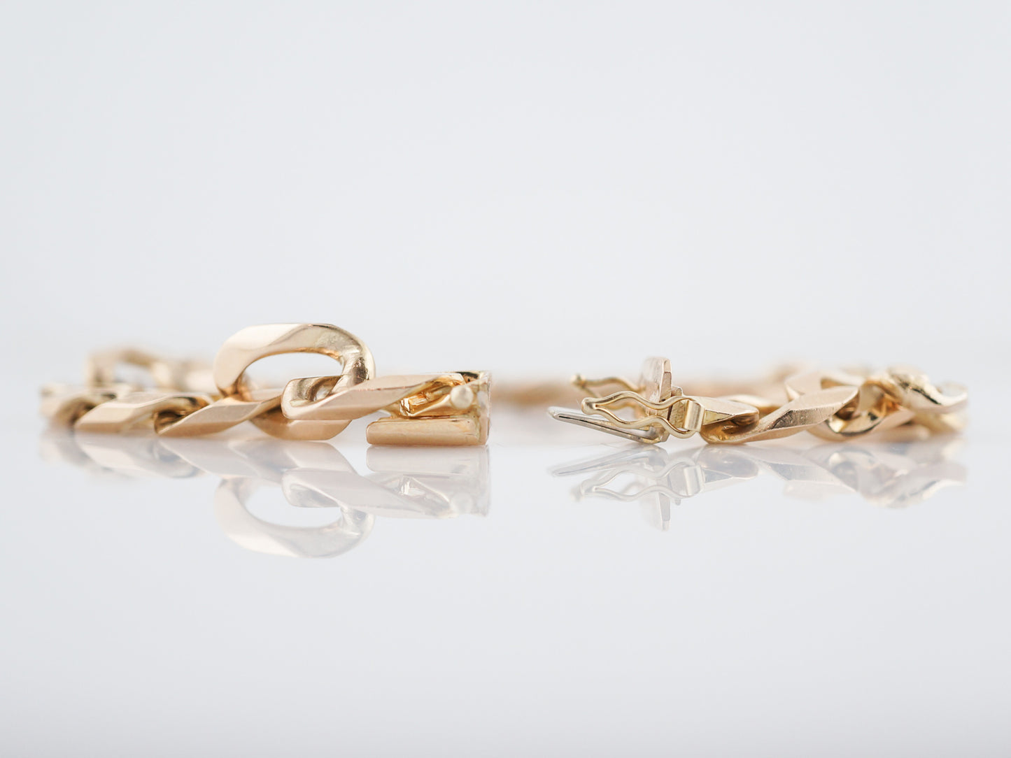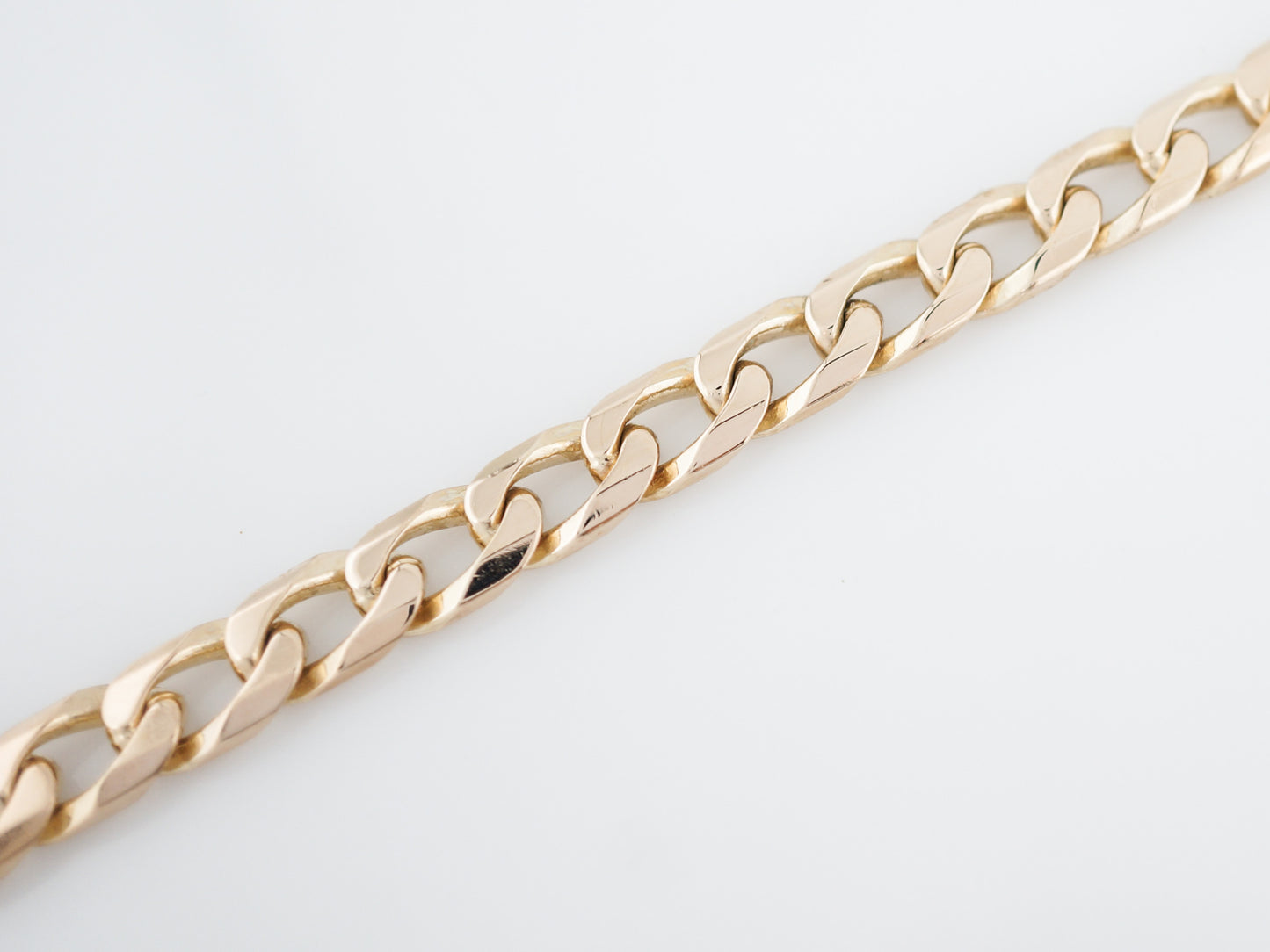 This Mens chain link style bracelet has wide flat curb links and is made in 14 karat yellow gold. Measuring 8.5 inches in length, it has a hidden box style clasp closure. Each link is solid, giving this piece a lovely weight.