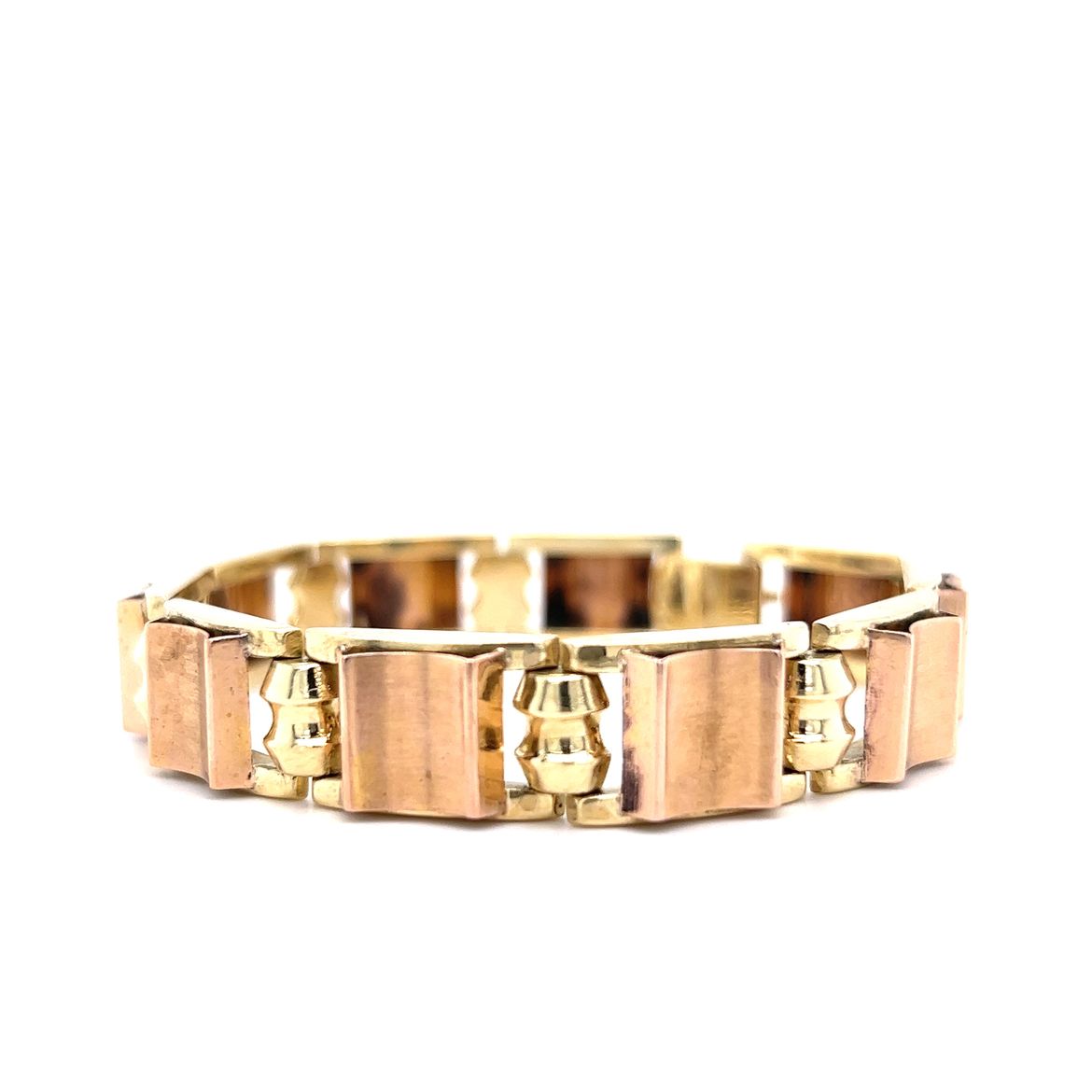 This Vintage, Retro Era bracelet is made of 14 karat rose and 14 karat yellow gold links. Each piece has a high polish yellow gold link, with a satin finish. Measuring 17.2 millimeters wide. Chic perfect for everyday wear. This bracelet makes a great statement piece and would also pair nicely with other bracelets.
