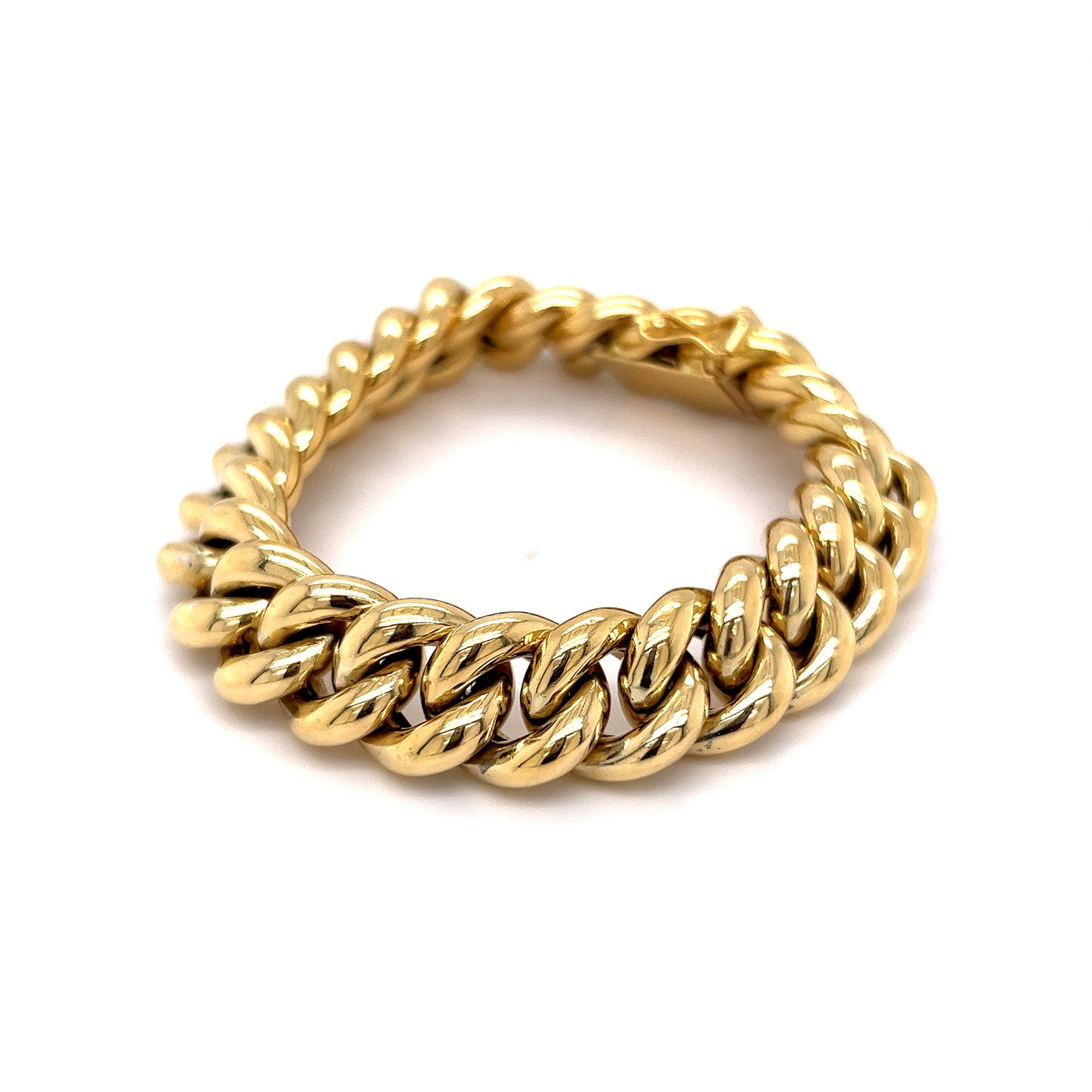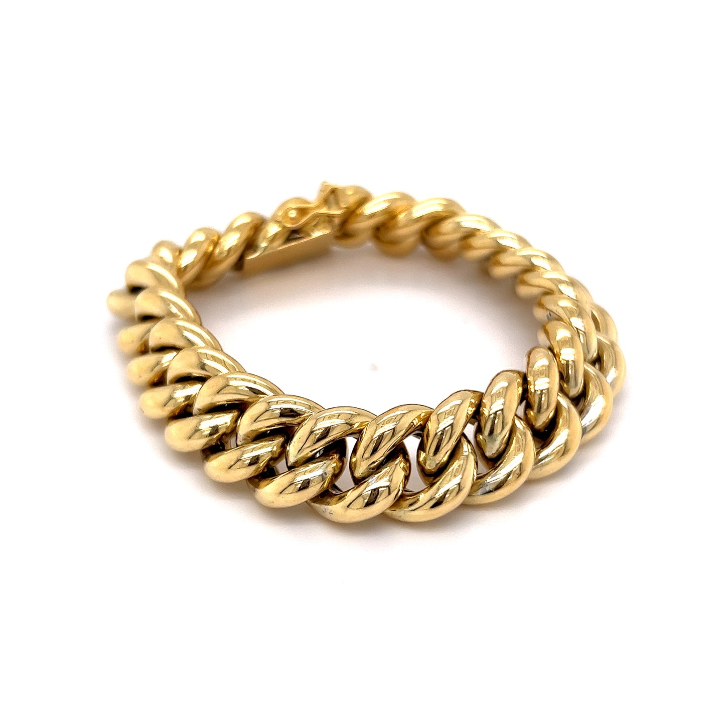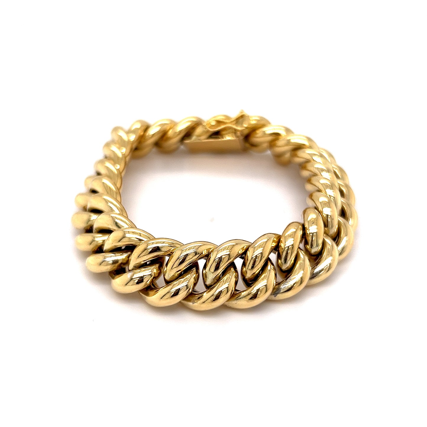 Braided Link Bracelet in 14k Yellow Gold. This lovely 8 inch yellow gold bracelet has a nice girth to it, with the links being a half inch wide. Weighing 46.7 grams of 14 karat yellow gold, this bracelet has an impressive presence and is perfect for everyday wear.