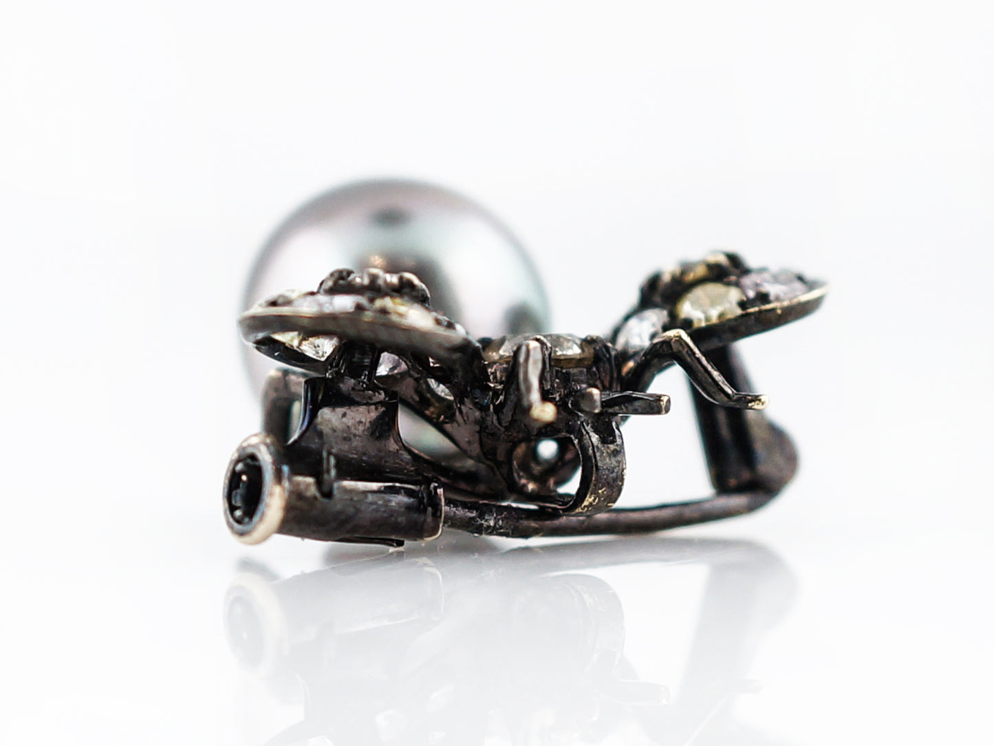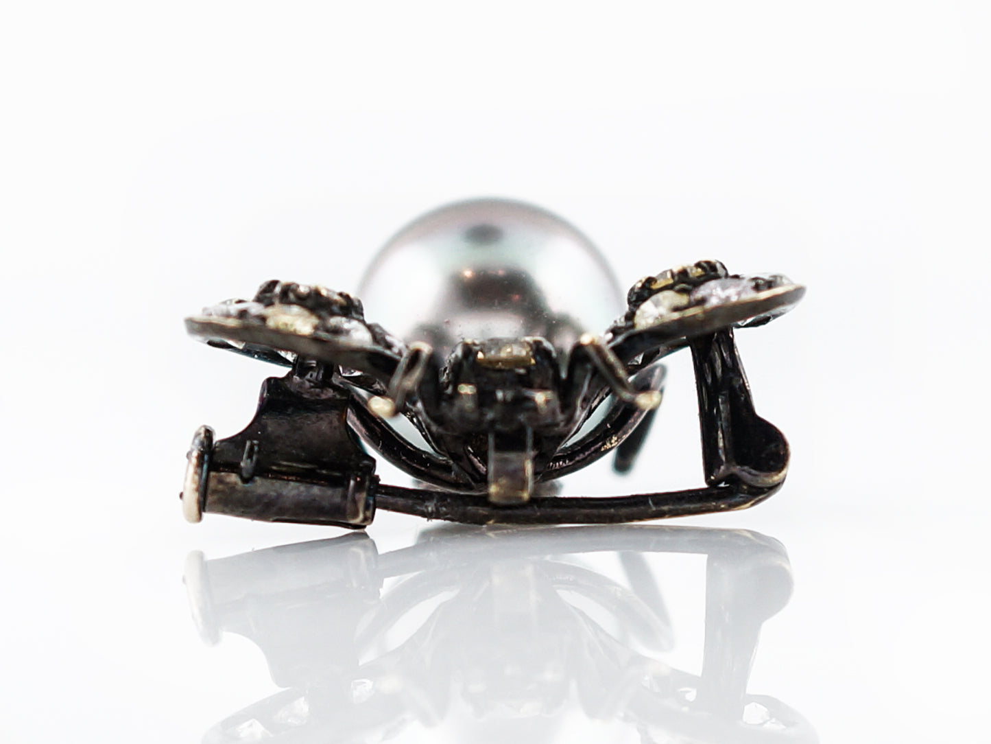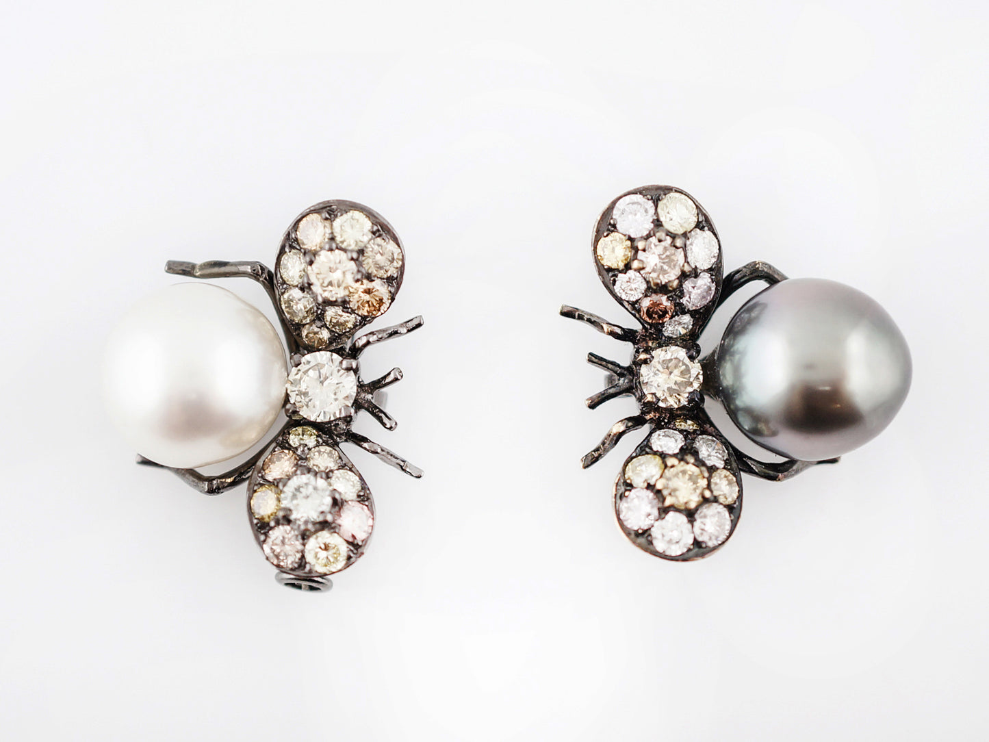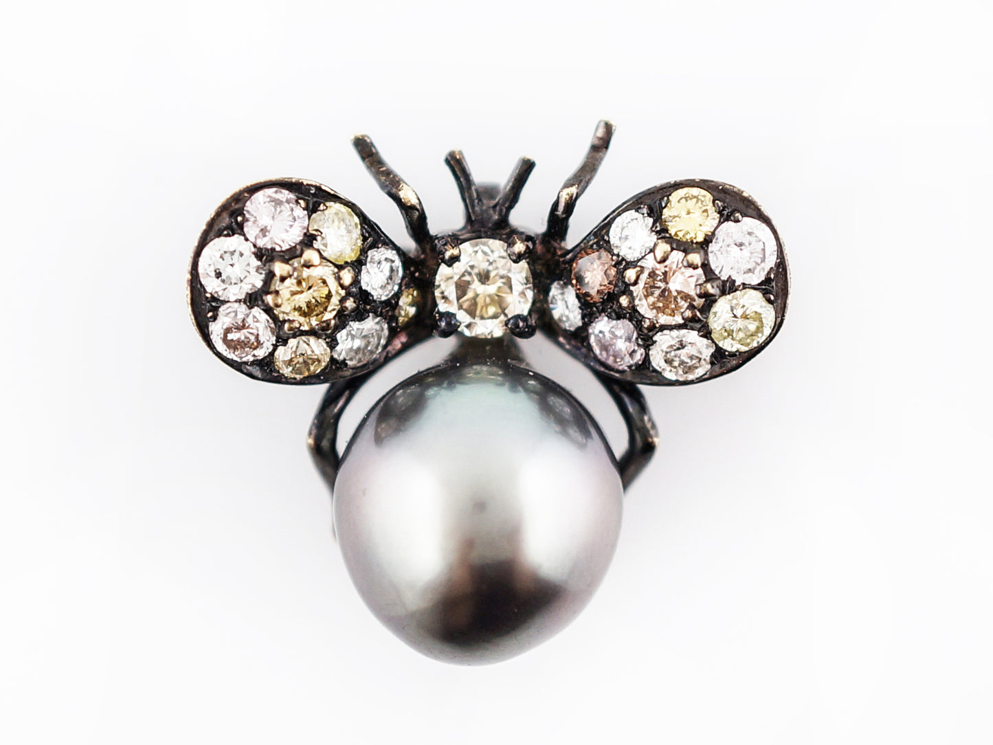 This whimsical bug pin is a Modern piece. The body is a pearl and the wings are a mosaic of round brilliant cut diamonds. The diamonds are all different colors adding to the natural, organic feel of the pin. The total diamond weight is 1.20 carat. The metal is 18k gold that is plated with black rhodium so the gemstones really pop.