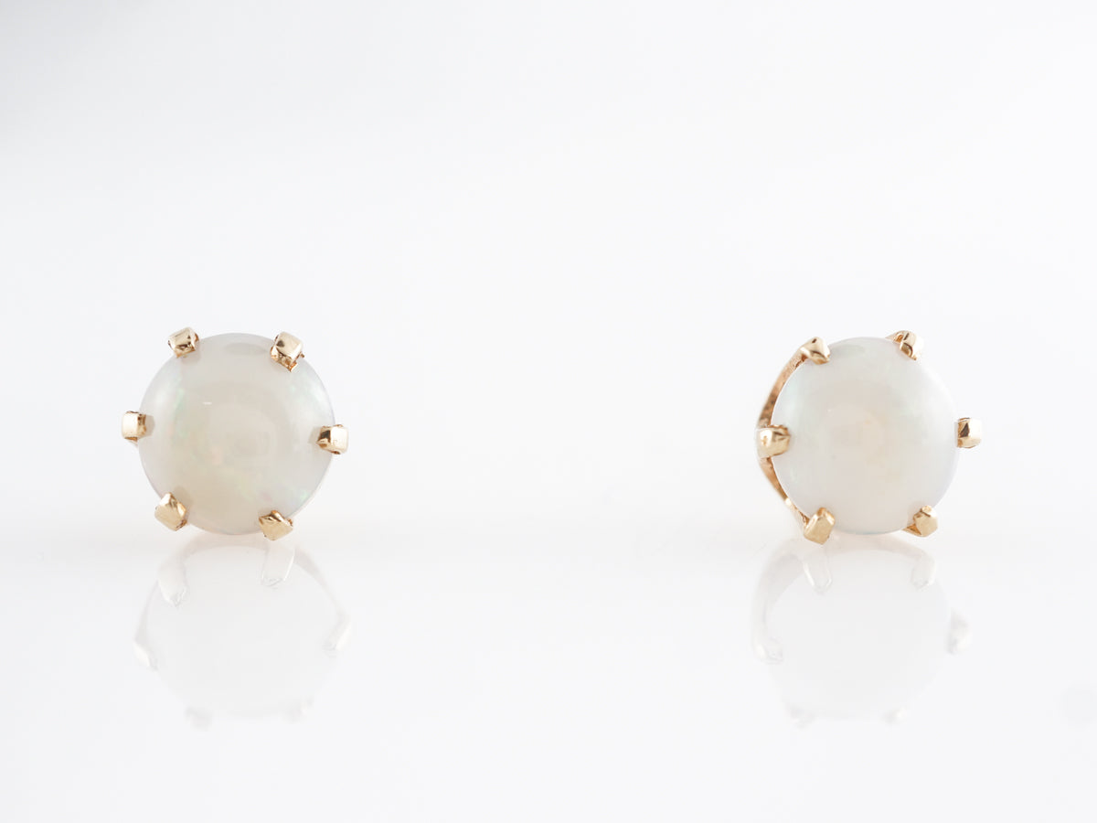 Cabochon Cut Opal Stud Earrings in 14k Yellow Gold. These delightful stud earrings feature two (2) .80 carat cabochon cut opals which are set in 14 karat yellow gold. The opals are held securely with six (6) prongs that also add a nice warm yellow contrast to the creamy opals. These would be perfect for everyday wear and would make a fabulous gift to yourself or a loved one.