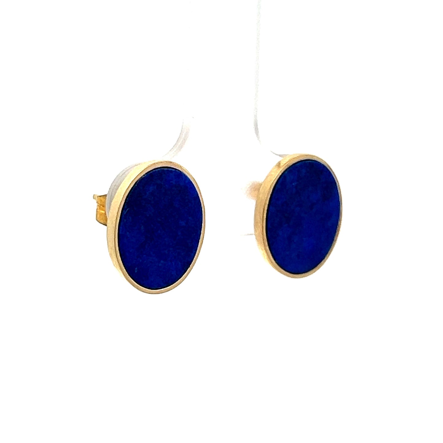 Oval Lapis Lazuli Stud Earrings in 14 Karat Yellow Gold! These stunning earrings feature a bold cabochon Lapis Lazuli stone, with an oval shape that adds a touch of elegance to any outfit. The stone is bezel set in 14 karat yellow gold, creating a sleek and contemporary look. These stud earrings are perfect for anyone looking to add a pop of color to their jewelry collection, while maintaining a modern and sophisticated style.