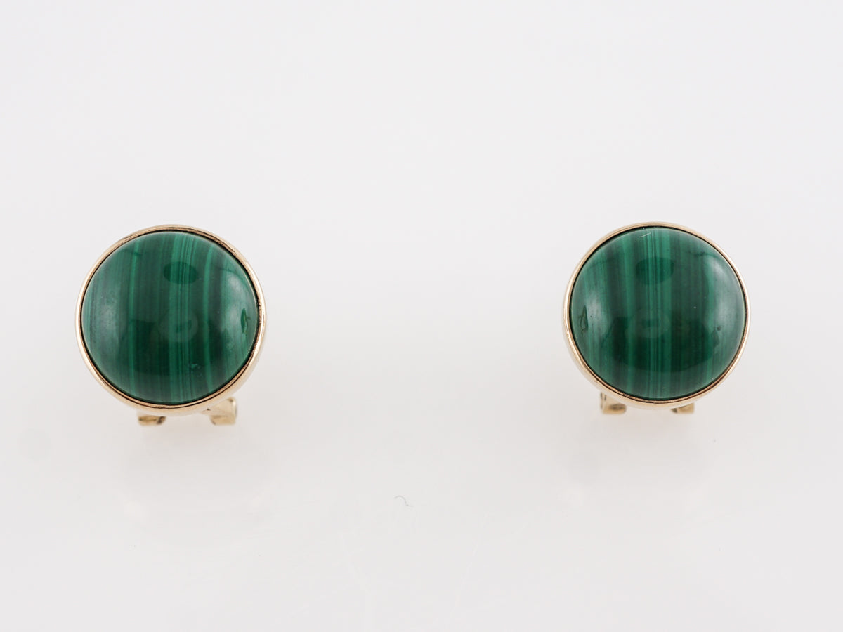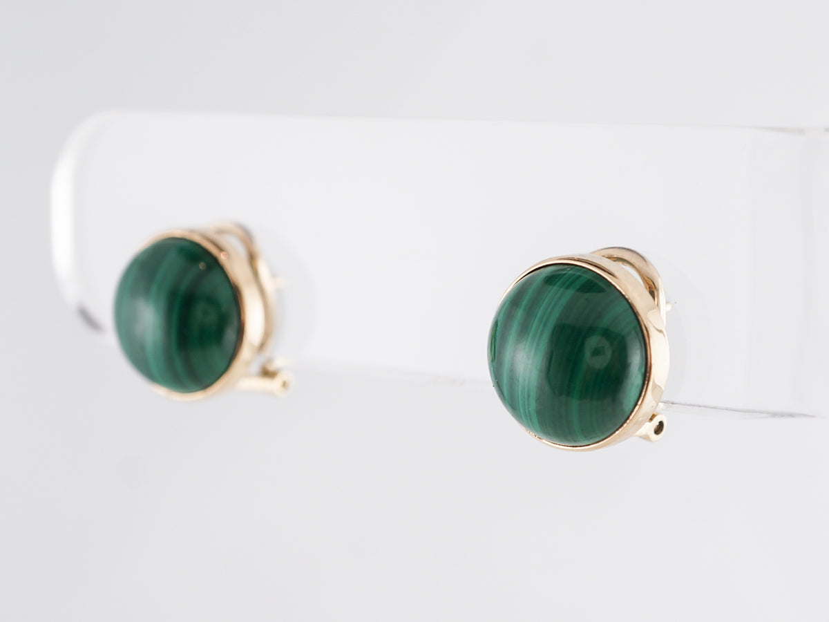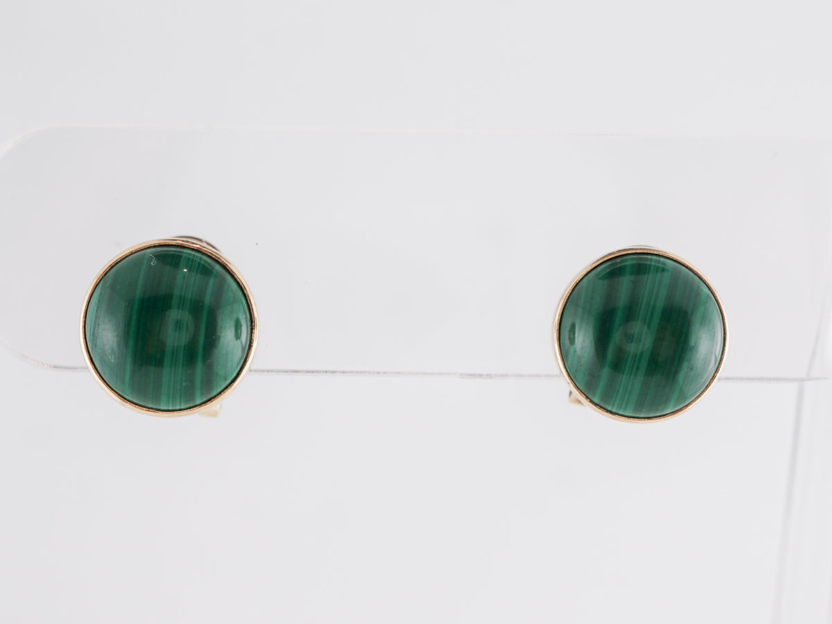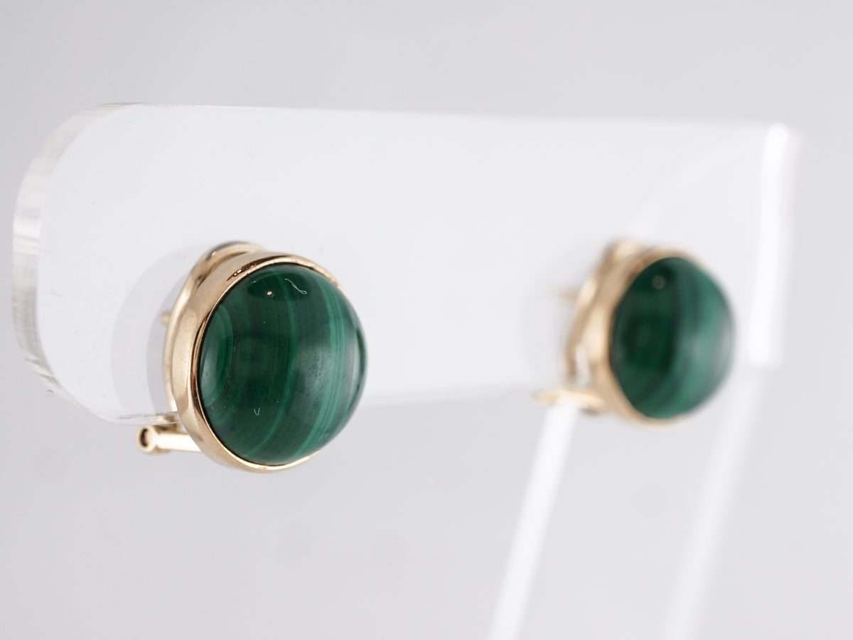 Cabochon Malachite Earring Studs in 14k Yellow Gold. These wonderful green cabochon malachite studs are set in 14 karat yellow gold. The gemstone has great lines of differing shades of green, adding to the subtle style of these beauties. The earrings are secured with an omega back and would be the perfect finishing touch on an outfit in need of a little green.