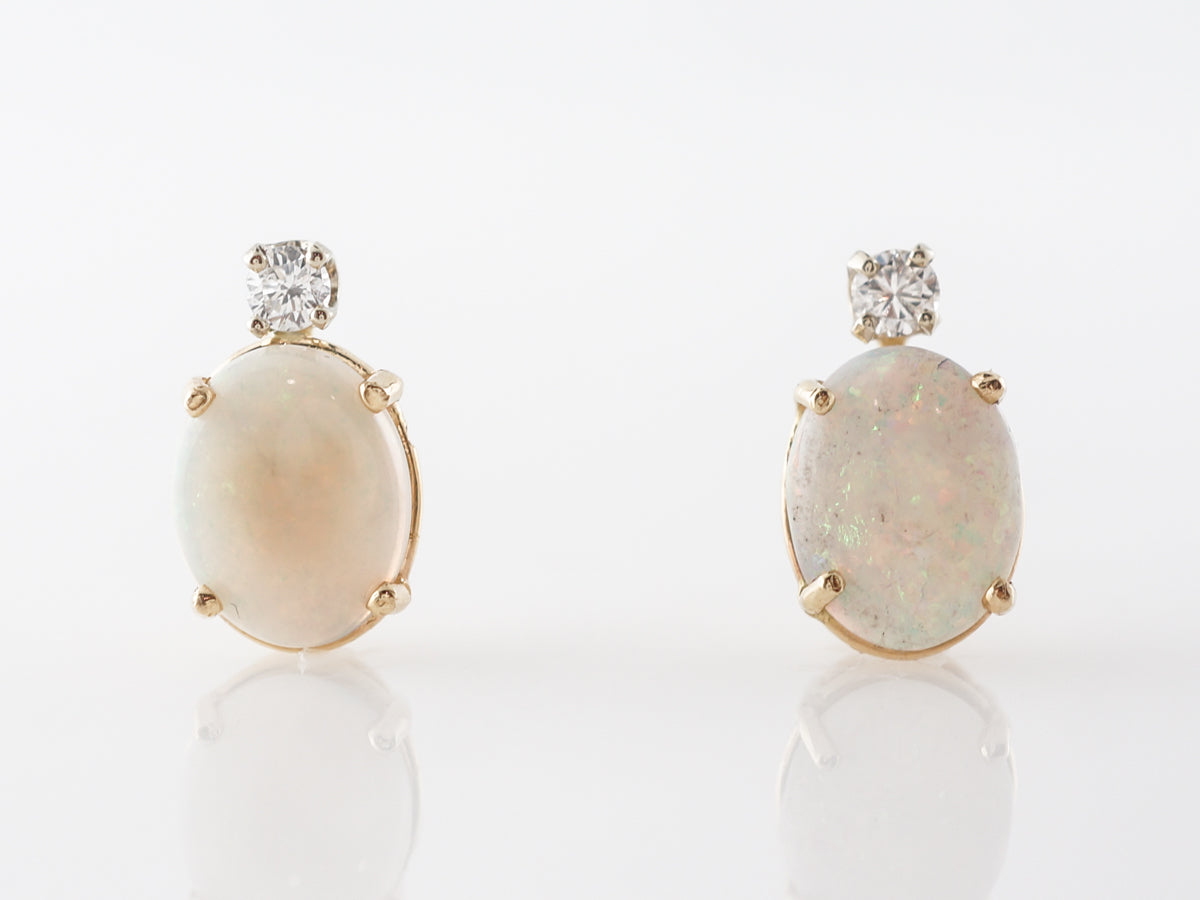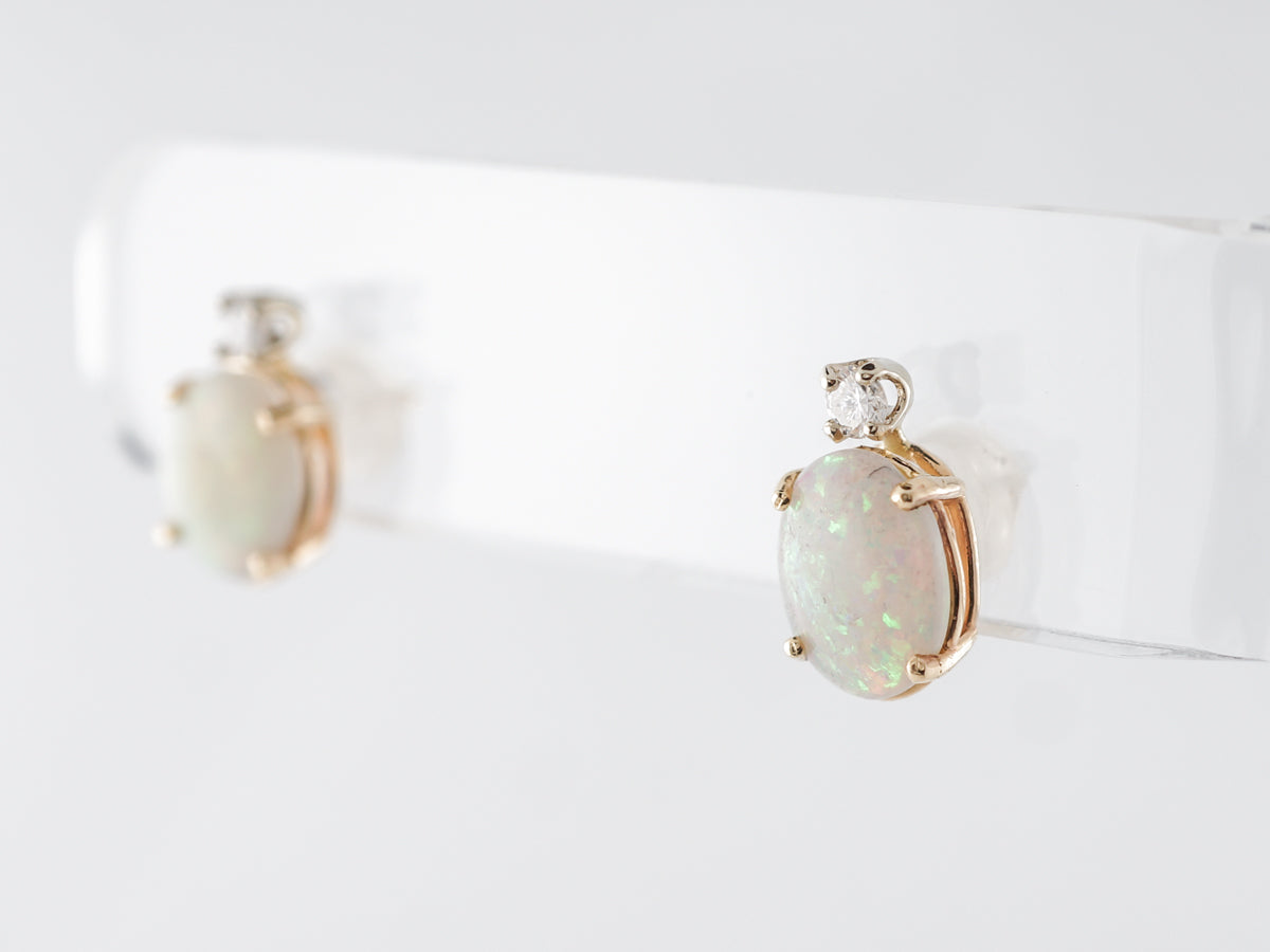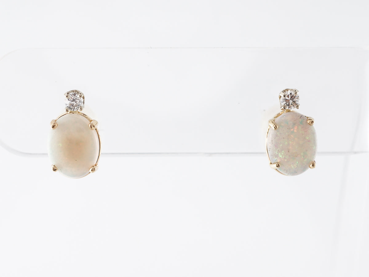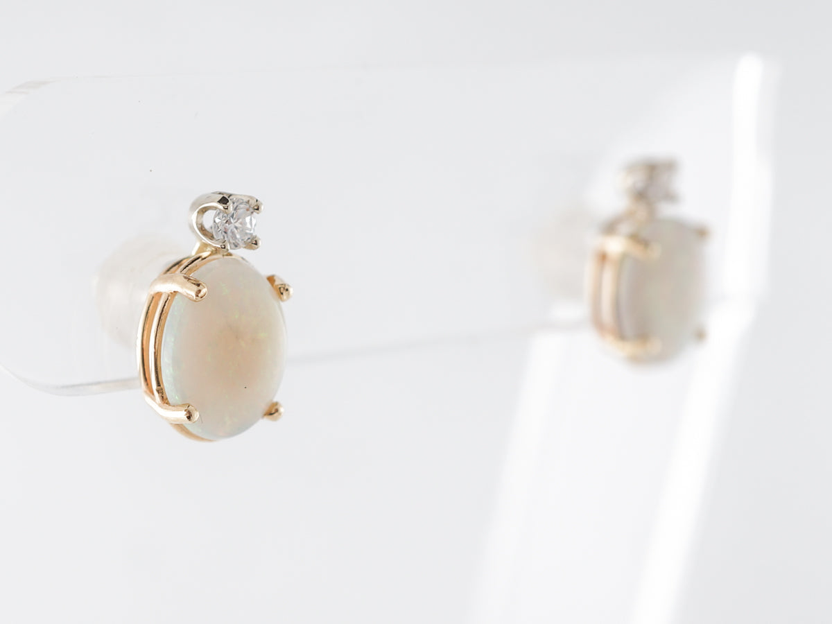 Cabochon Opal Diamond Earring Studs in Yellow Gold. These modern stud earrings feature 1.76 carats of cabochon cut opals and .12 carats of round brilliant diamonds set in 14 karat yellow gold. The simple design makes great use of the brilliant diamonds sparkling above the creamy opals with their lovely flashes of color. These could be fabulous for daily wear and would look very at home at a fancy gala event.