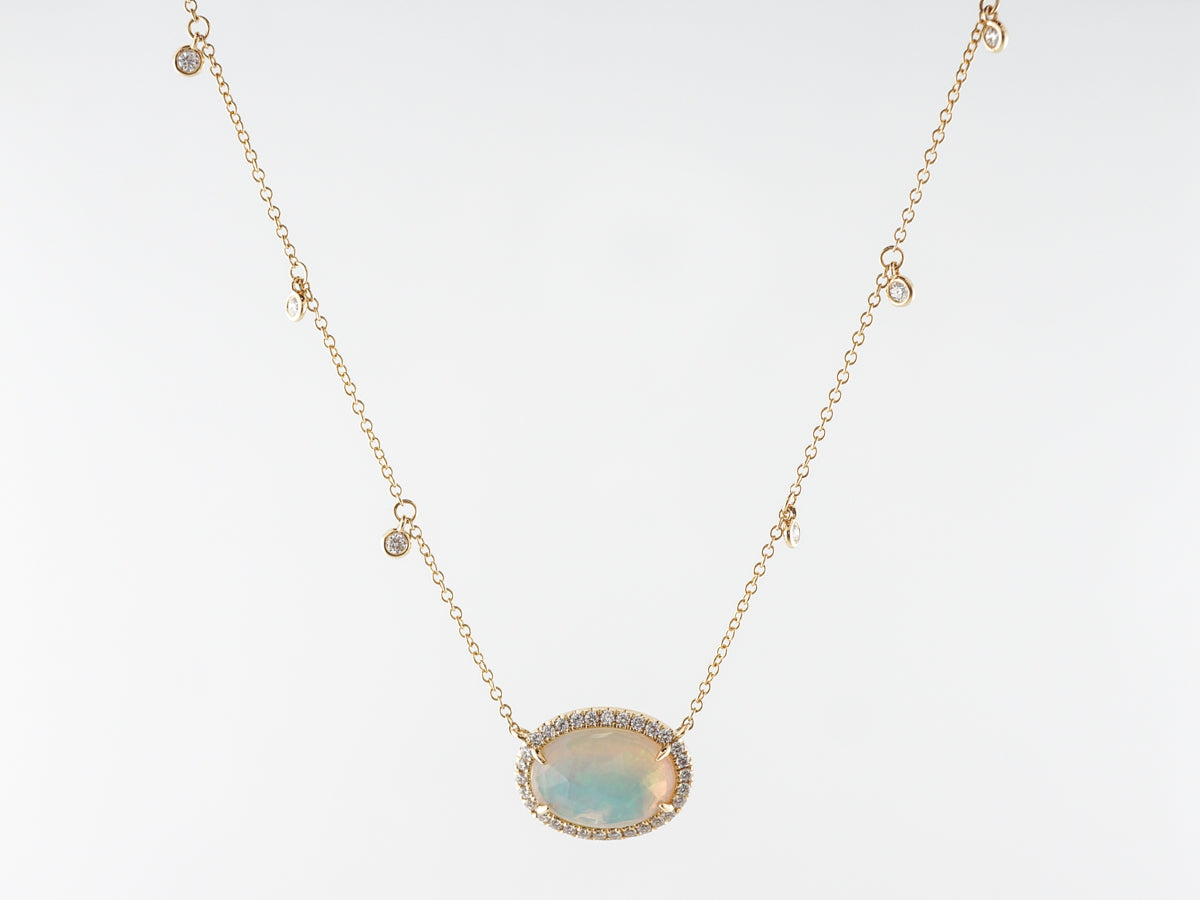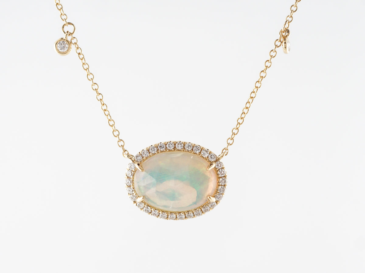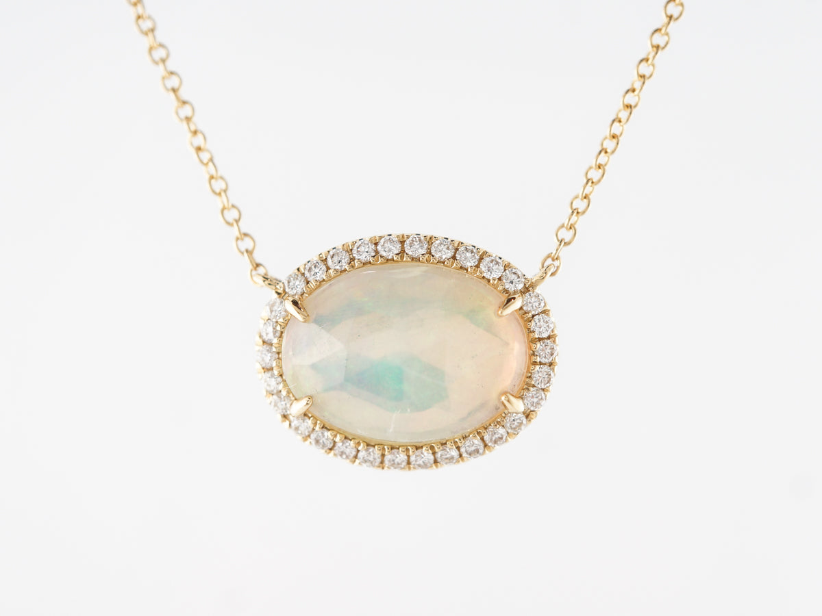 Cabochon Opal Diamond Pendant in 18k Yellow Gold. This fantastic opal and diamond pendant features a 1.17 carat cabochon cut opal that is prong set in 18 karat yellow gold and wrapped in a halo of round brilliant diamonds. The thin 18 inch gold chain features dainty little diamonds spaced evenly and providing a bit of movement and sparkle. This would be an amazing necklace for everyday wear and would look fabulous with a group of other chains.