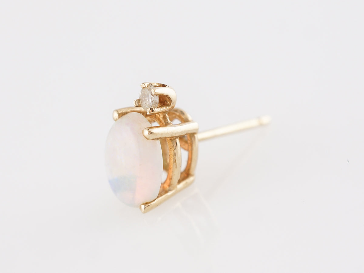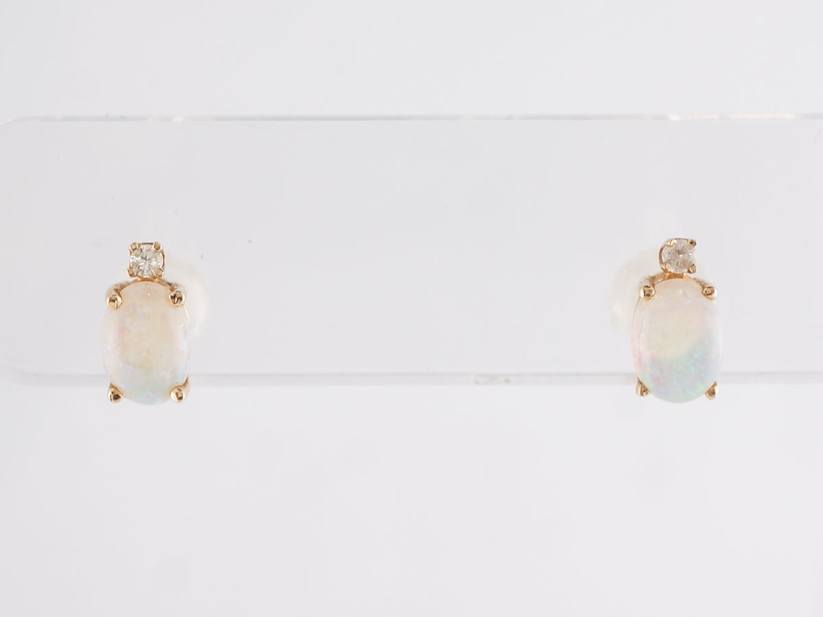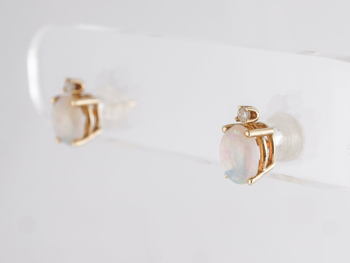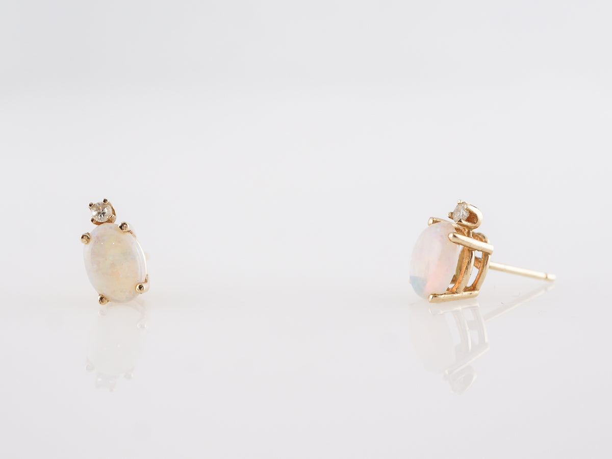 Cabochon Opal Stud Earrings in 14k Yellow Gold. These lovely opal and diamond earrings are a perfect splash of color and shine in a dainty stud earring package. Made in 14 karat yellow gold, these studs hold the oval shaped opals with small round brilliant cut diamonds sitting atop one end. The opals have a nice flashes of color and bring a prismatic quality that works with any outfit.