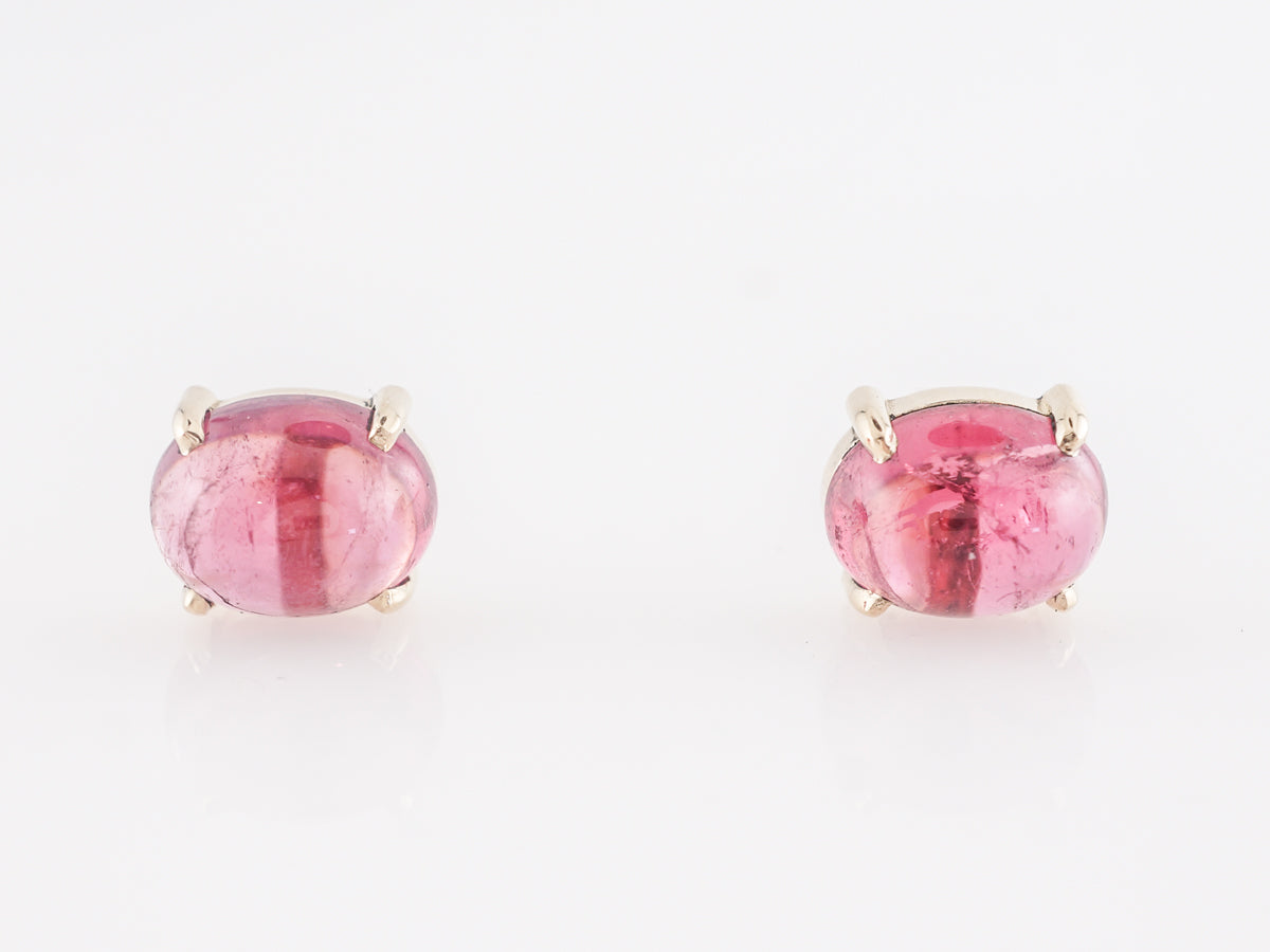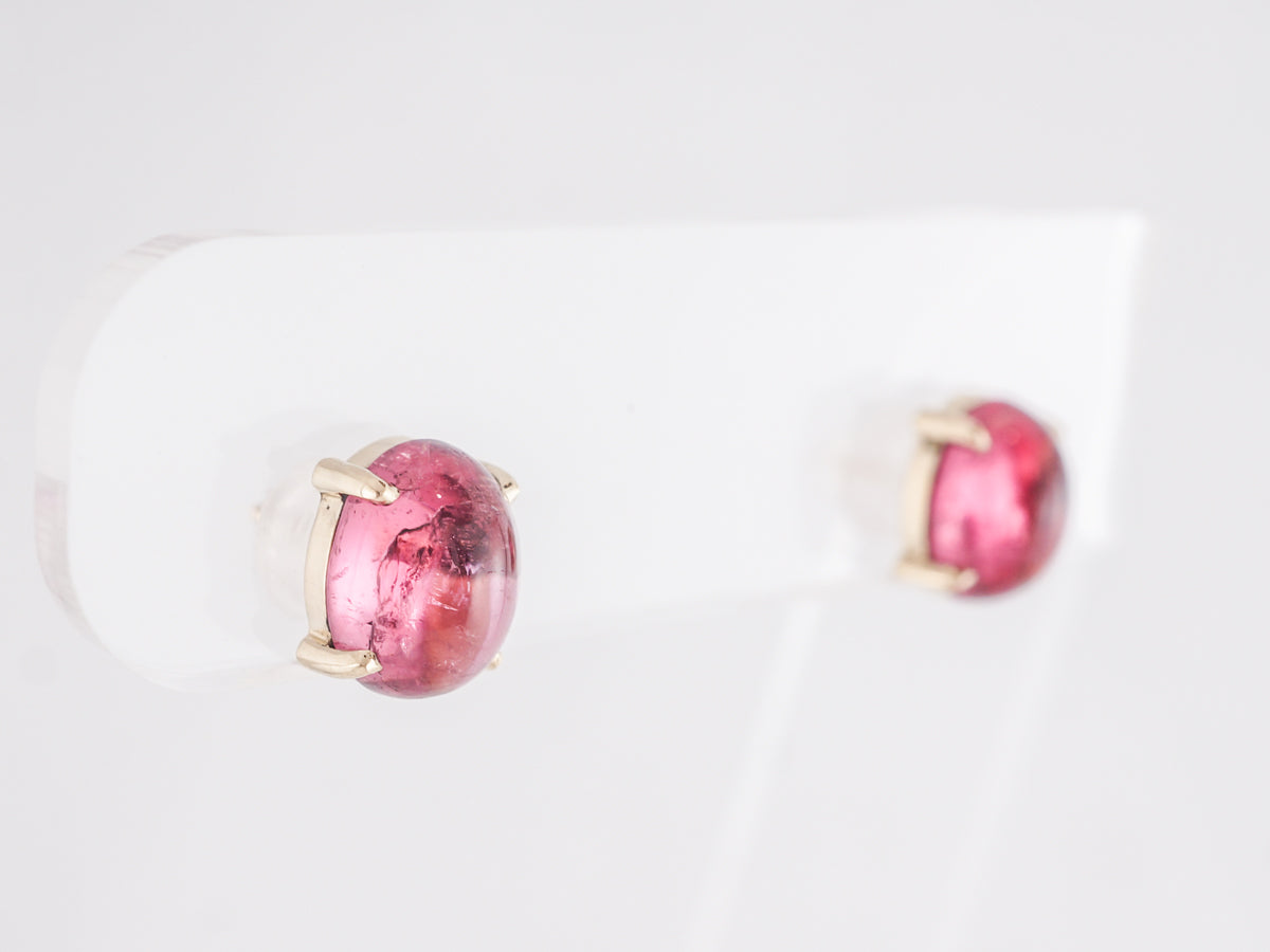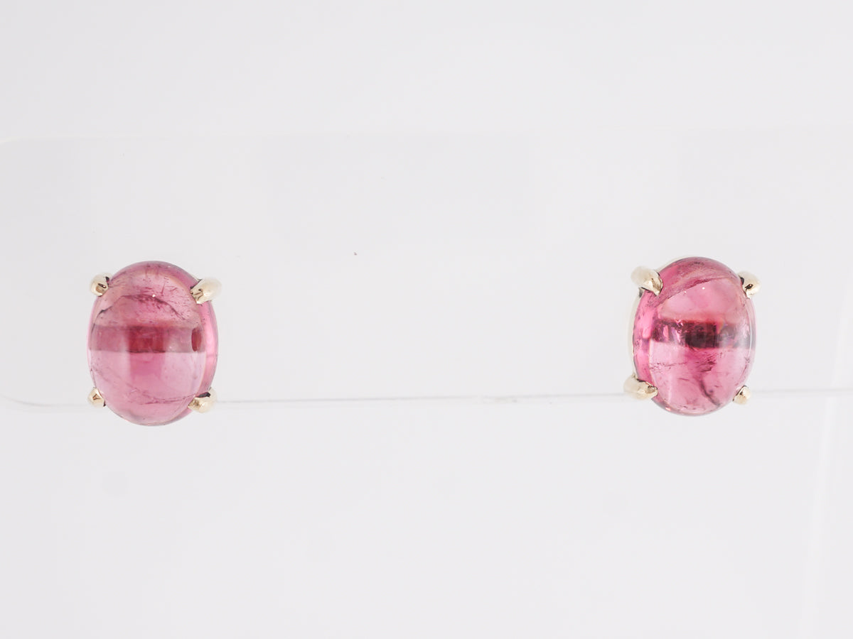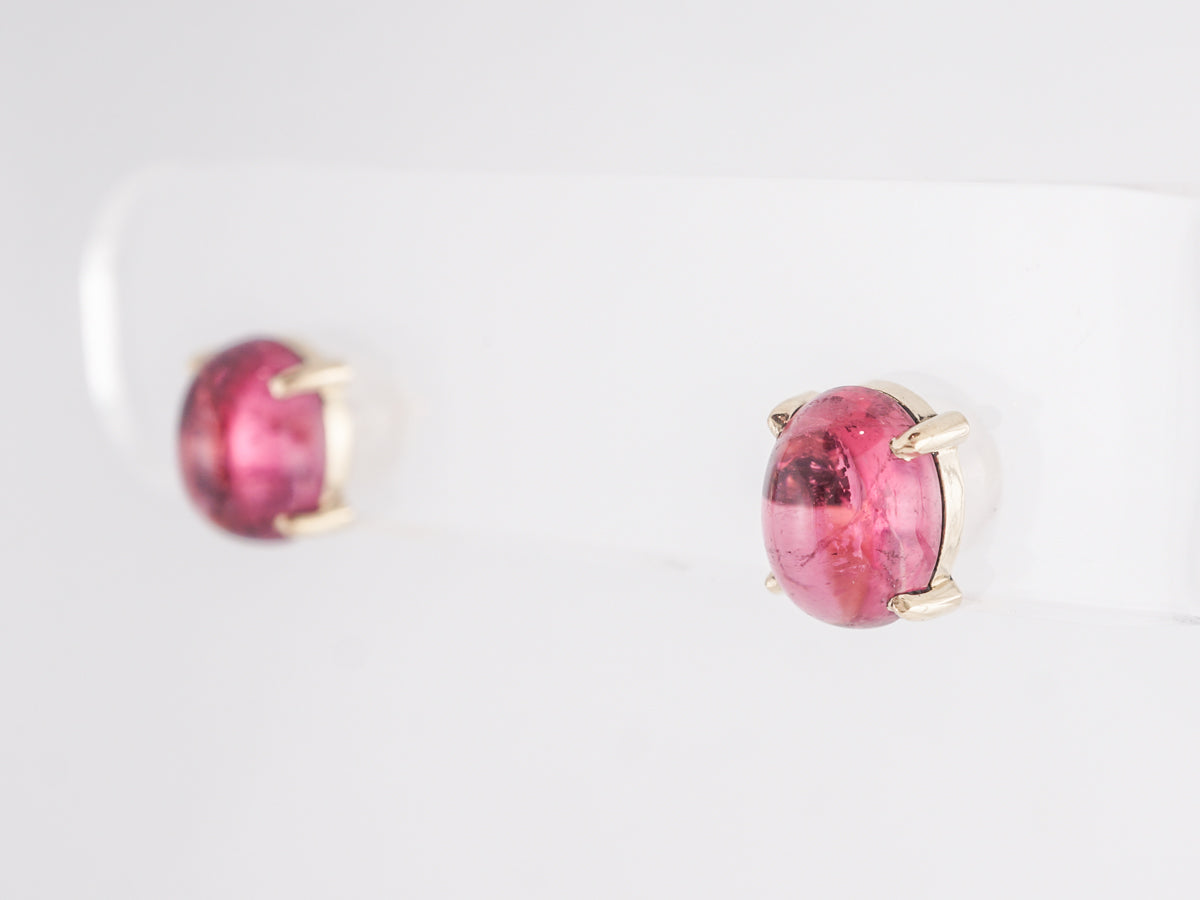 Cabochon Pink Tourmaline Earrings in 14k Yellow Gold. These bright and beautiful stud earrings feature 4.71 carats of cabochon cut pink tourmaline set in 14 karat yellow gold. The color of the pink tourmaline is the star of the show here, which combines well with the yellow gold color. These are amazing stud earrings for a bold and chunky look!