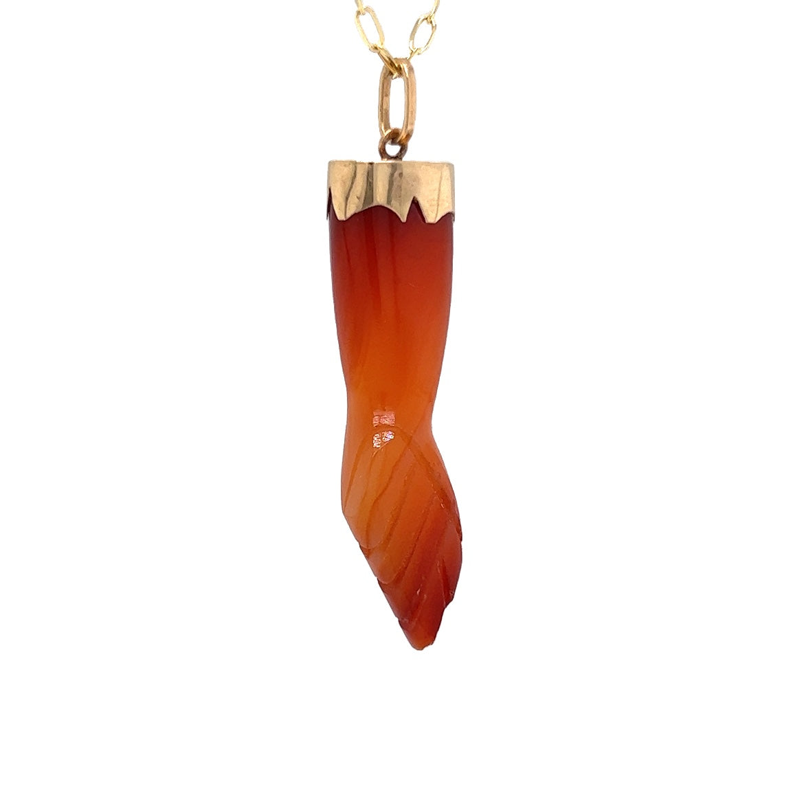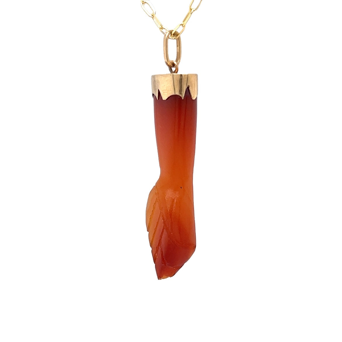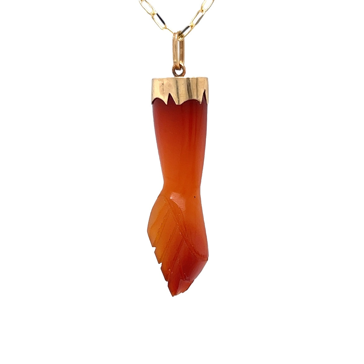A good luck charm inspired by the pendants from ancient Etruscan Italy! This stunning red carnelian gemstone pendant features a figa design in radiant 10 karat yellow gold. The hand locks into a “fig” gesture carved into the red-orange carnelian stone. Carnelians are used for their healing metaphysical powers in many spiritual ceremonies, such as reiki and meditation. Rich in culture, meaning, and design. This lovely pendant would make an unforgettable gift for any loved one! Strong expertly designed.
