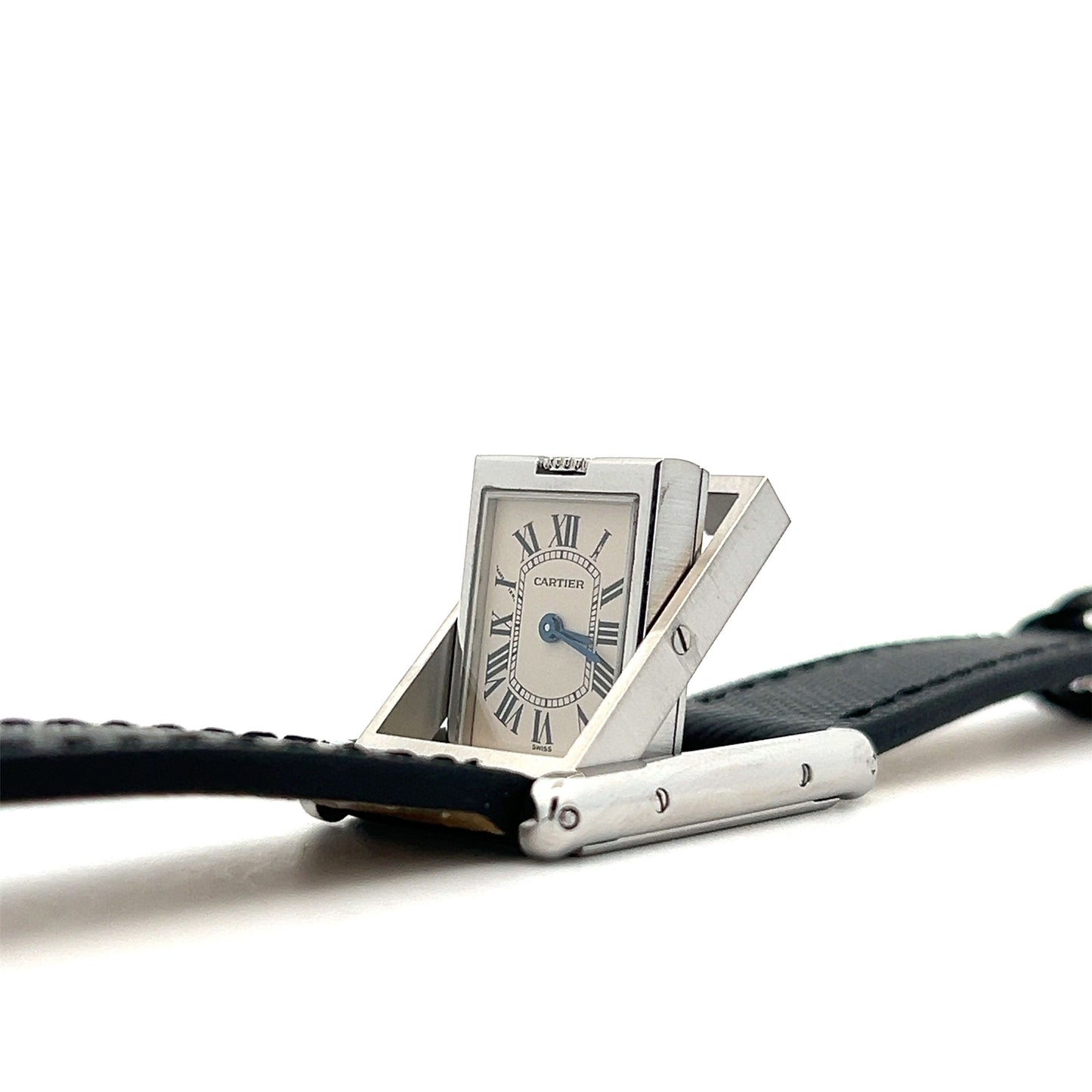 Recently serviced, the Basculante has a pivoting mechanism that allows the watch to double as a desk clock. Its compact size and sleek design make it ideal for everyday wear while maintaining Cartier’s hallmark elegance.