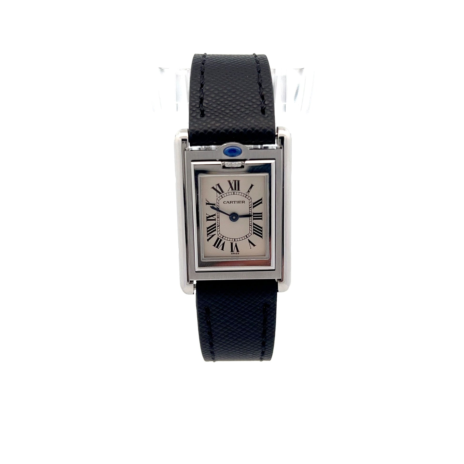 The Cartier Ladies Basculante Reverso 2386 is a unique timepiece known for its reversible case, originally designed to protect the watch face during physical activity. This model features a 22mm x 32mm stainless steel case with a quartz movement. The watch’s white dial is elegantly adorned with black Roman numerals and Cartier's signature blued-steel sword-shaped hands. Complementing this is a brand new midnight blue alligator strap, adding a fresh, modern touch to the classic design