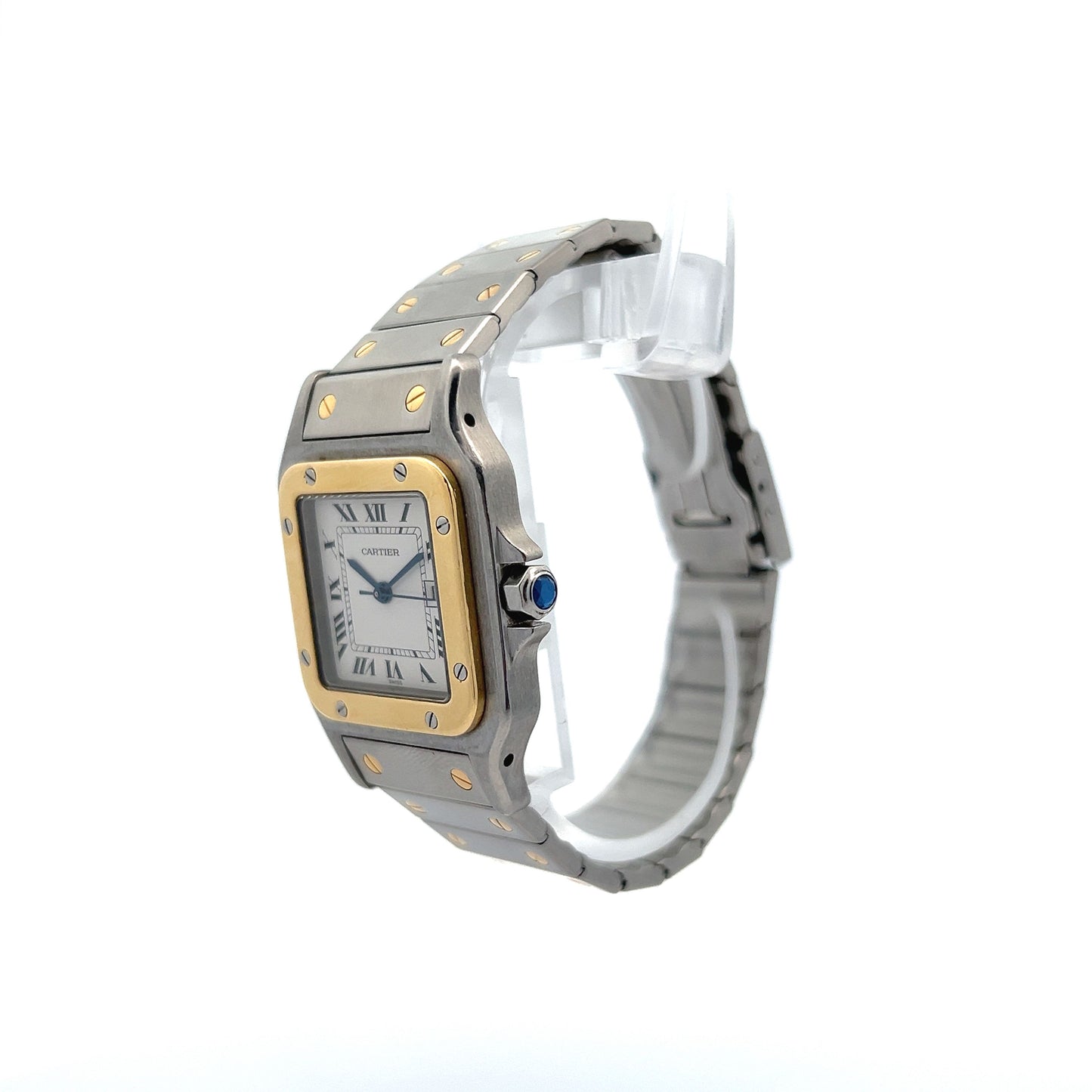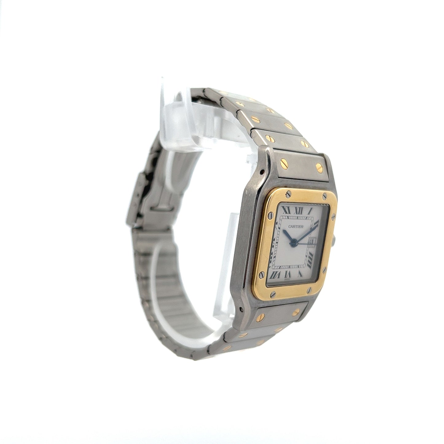 The Cartier Santos Galbee 29mm REF 2961 is a classic watch. This two-tone stainless steel timepiece exudes elegance with its white dial, blued steel hands, and 18k gold accents. Slightly larger than its predecessors at 29mm across, it remains slim and ideal for slender wrists or those preferring subtle gold highlights. The mechanical automatic watch, powered by the Cartier calibre 077, boasts a 38-hour power reserve. Its black Roman numerals and date window at three o’clock enhance readability, while the matching bracelet adds to its striking appearance.