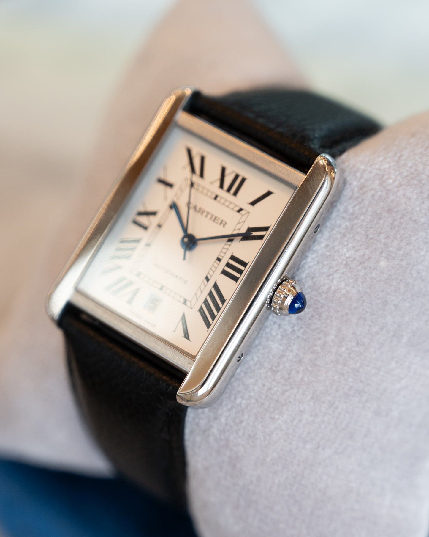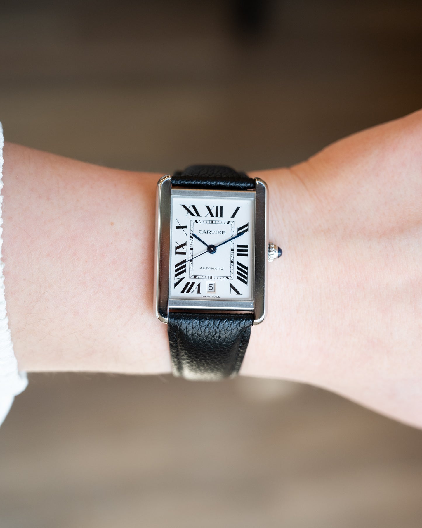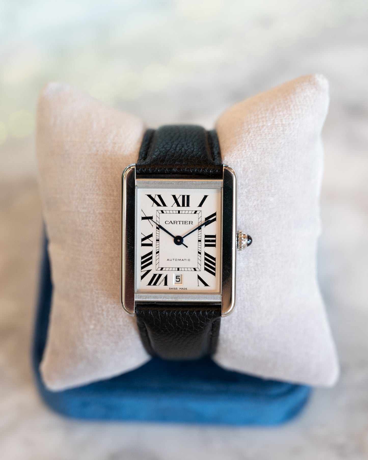The watch runs on an automatic movement that keeps time without needing battery changes. Recently serviced in January 2025, this watch is ready for reliable daily use. The Tank design is a signature Cartier style that works well for both business settings and more casual occasions, making it a versatile addition to a watch collection.