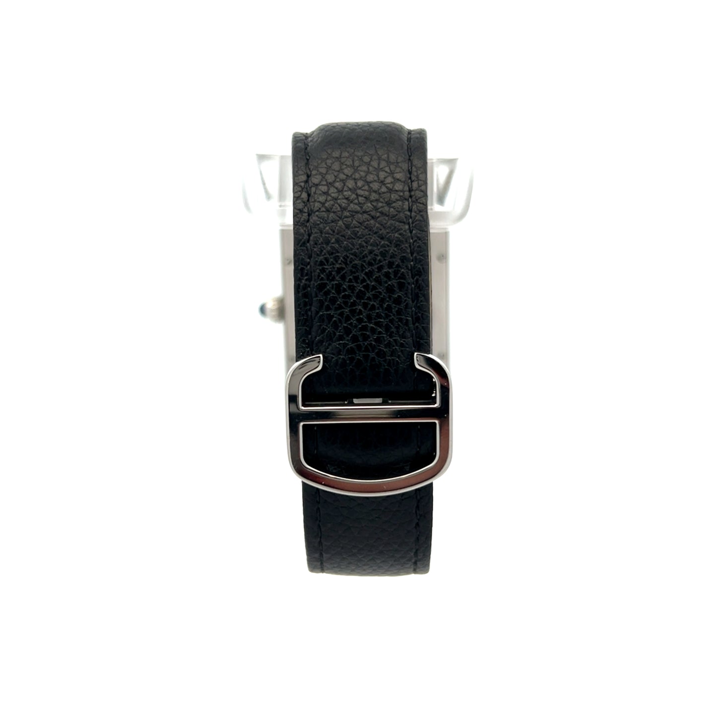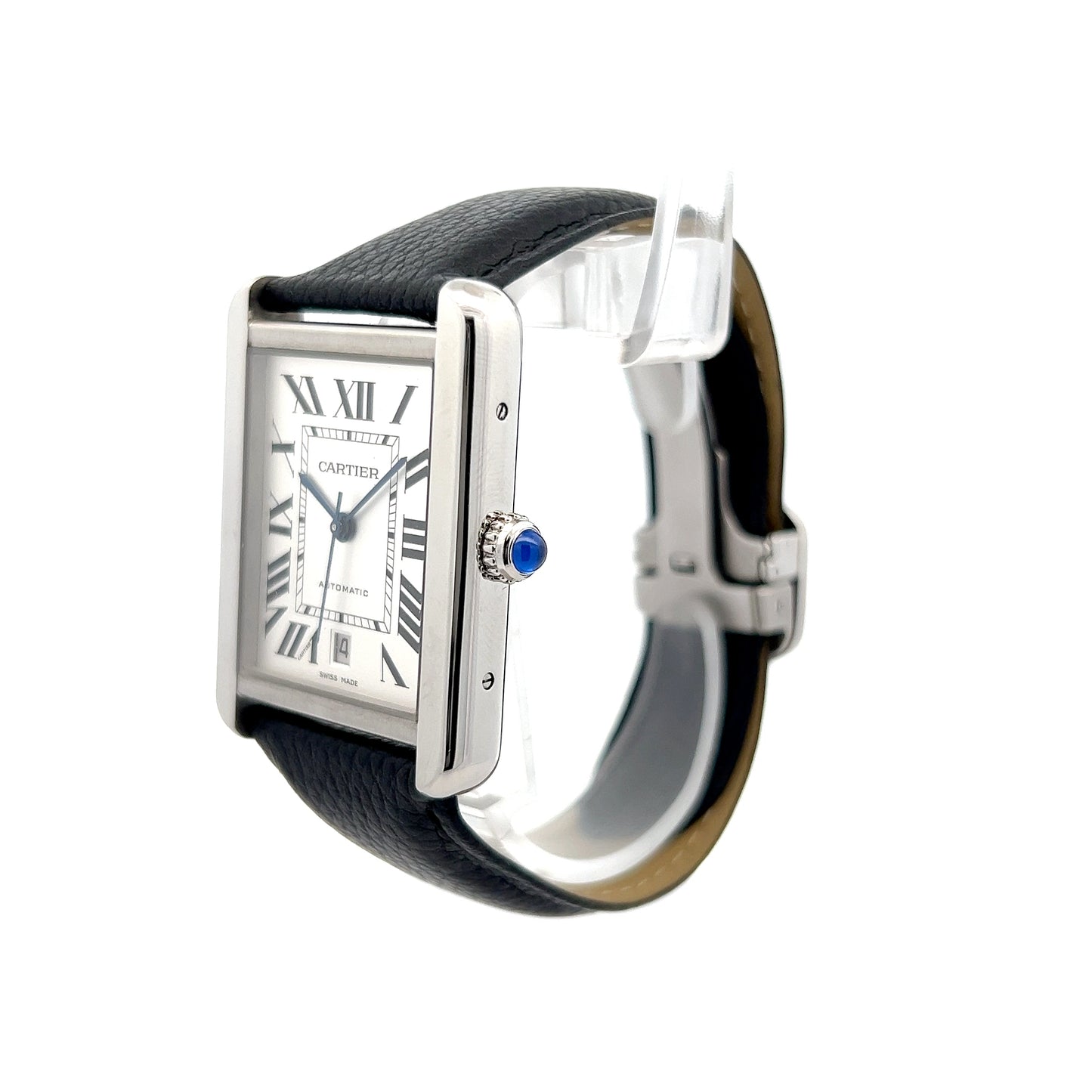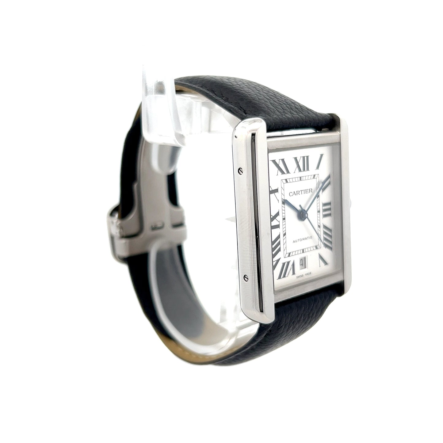 The Cartier Tank XL Must men's watch is made of stainless steel with a substantial 41 mm x 31 mm case that stands out on the wrist. Its white dial includes a date function and creates a clean contrast against the black leather strap that comes with a deployment clasp for secure wearing.