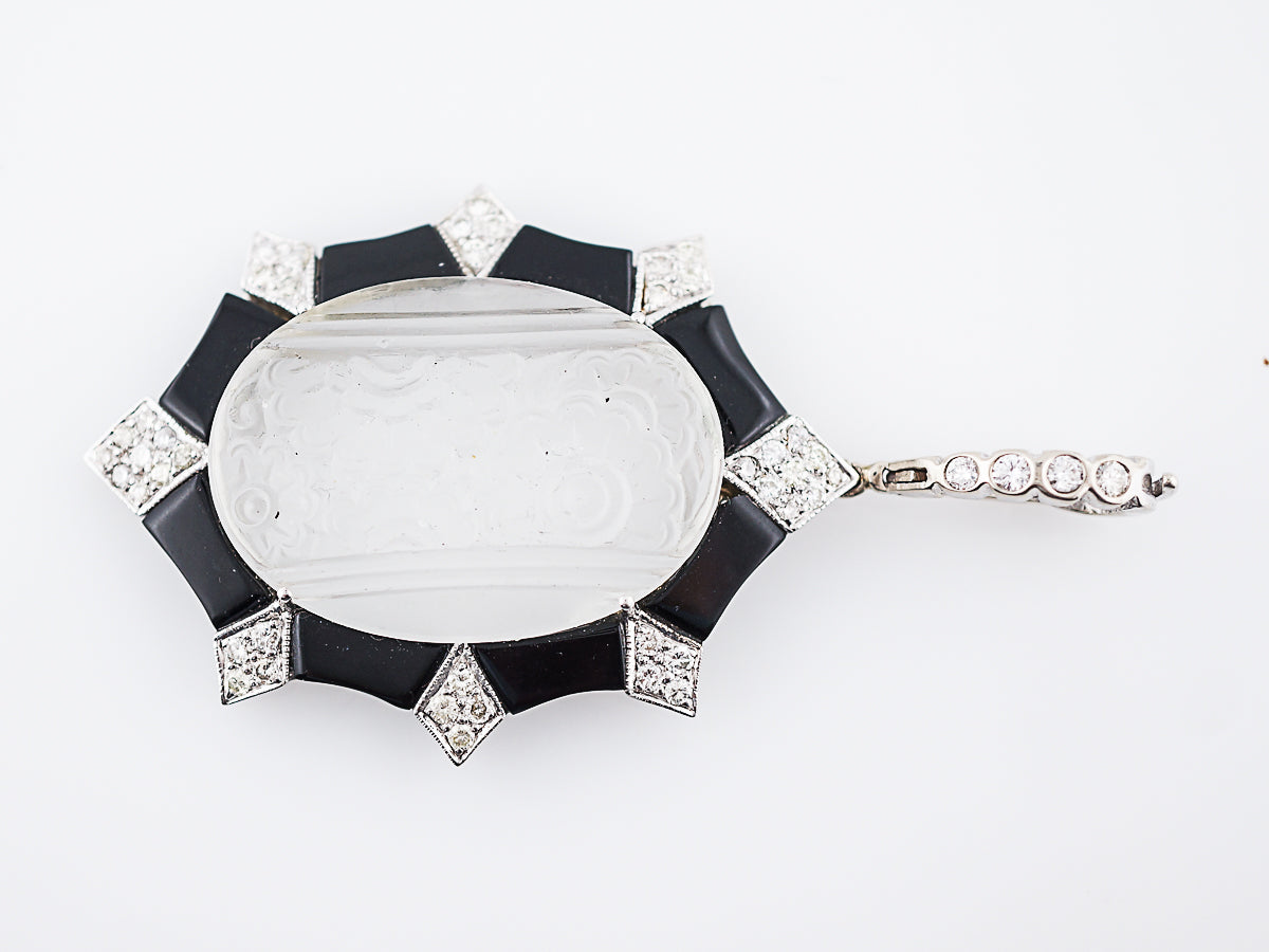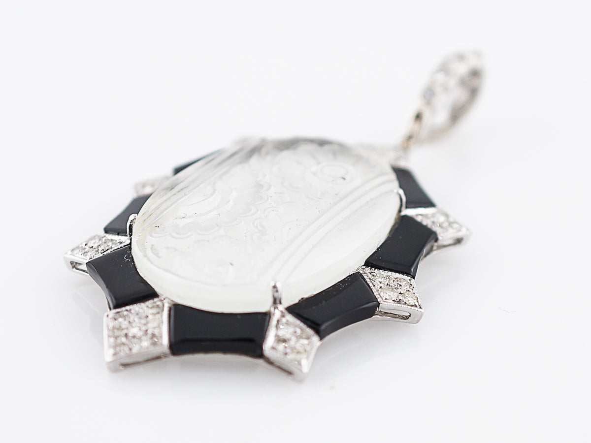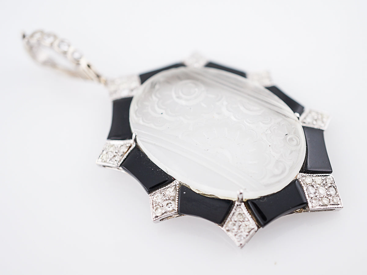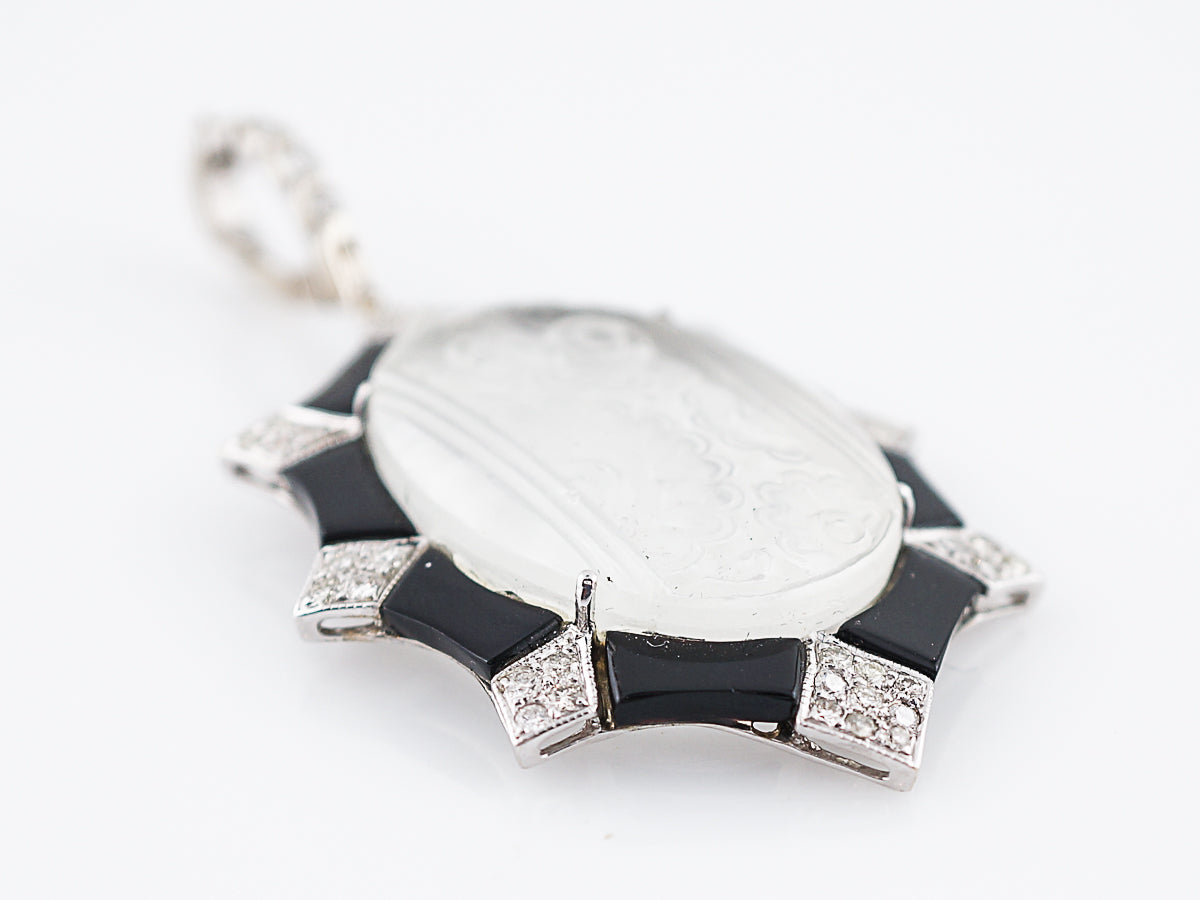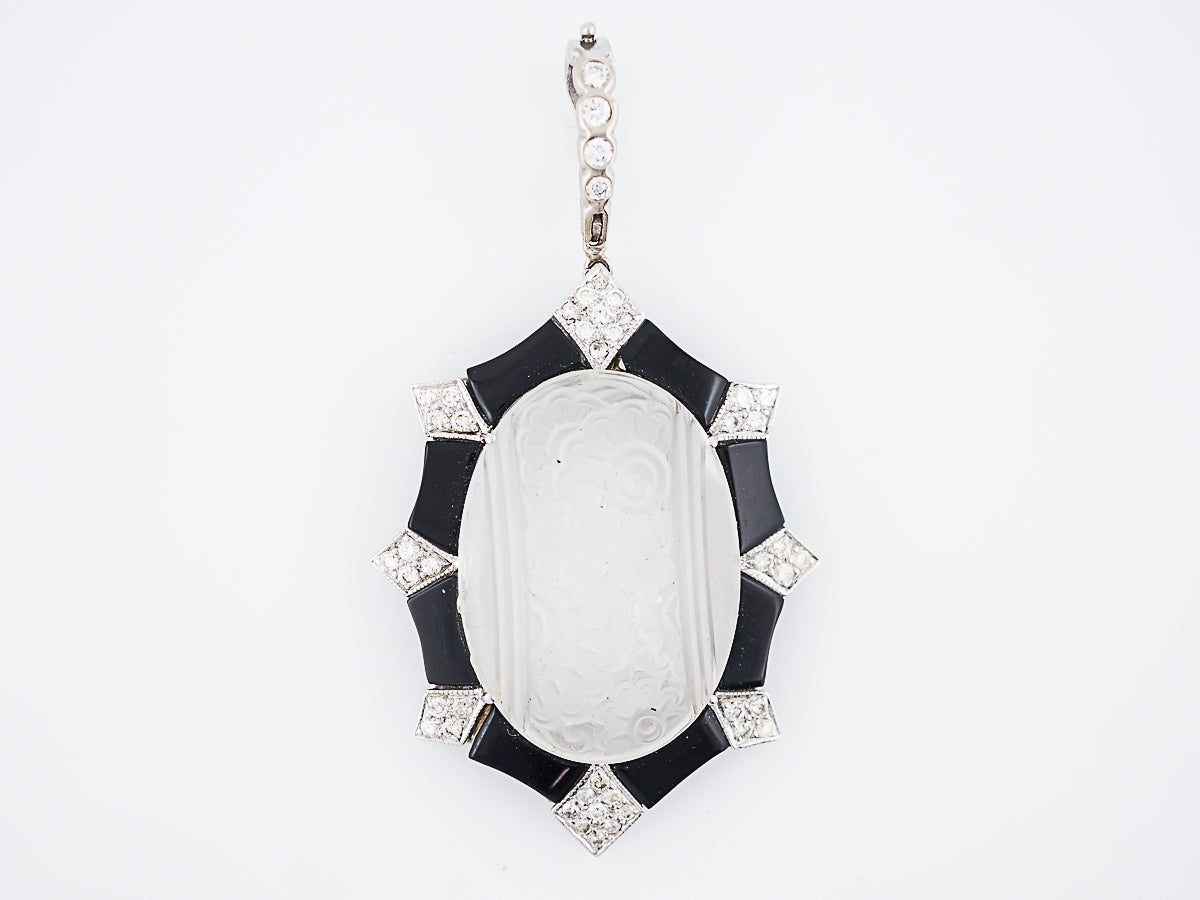 This modern quartz crystal, diamond and onyx pendant is a tribute to Art Deco design. The center carved quartz crystal features a floral motif with a frosted finish. The quartz center is surrounded by forty-two (42) bead set round brilliant diamonds in kite shaped decorative bezels. The diamonds are accented by high polish onyx sections creating contrast. The pendant completed in 18 karat white gold and features a large diamond bail set with four (4) bezel set diamonds. The pendant measures two (2) inches long and a inch and a half (1.5) wide.