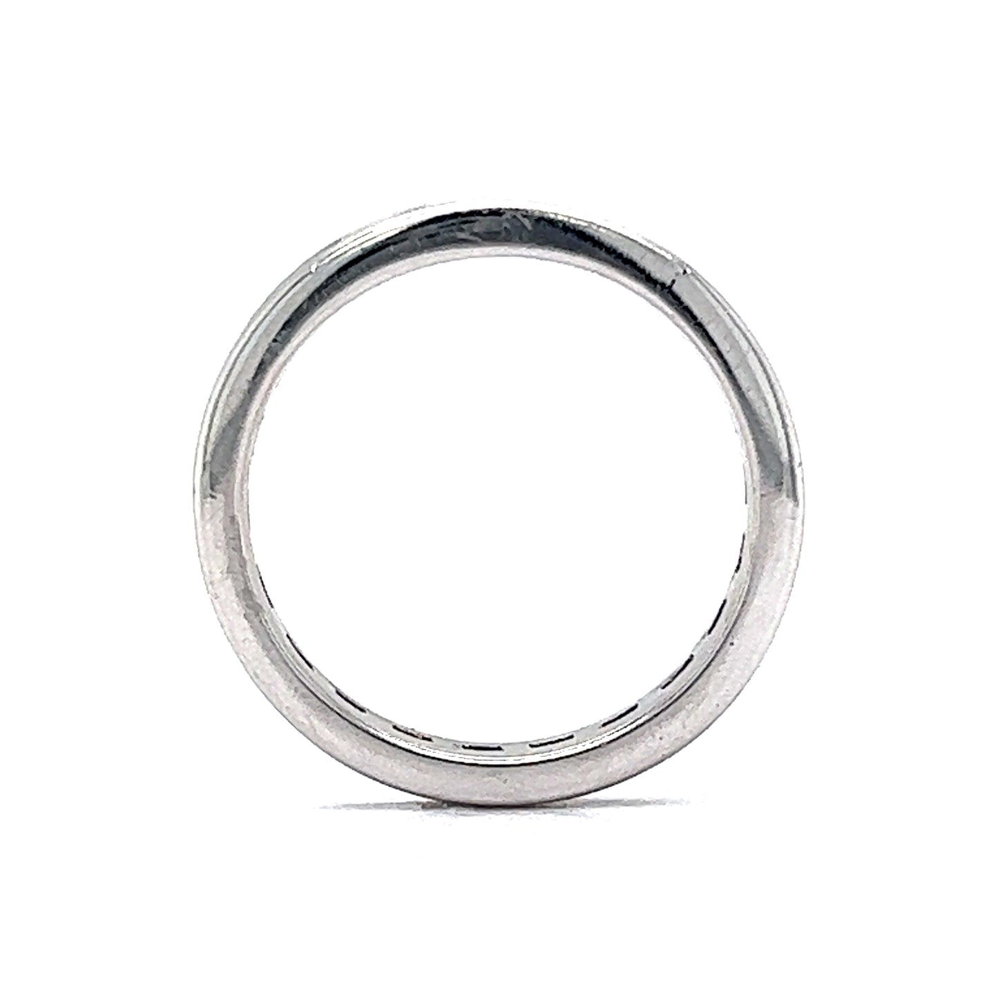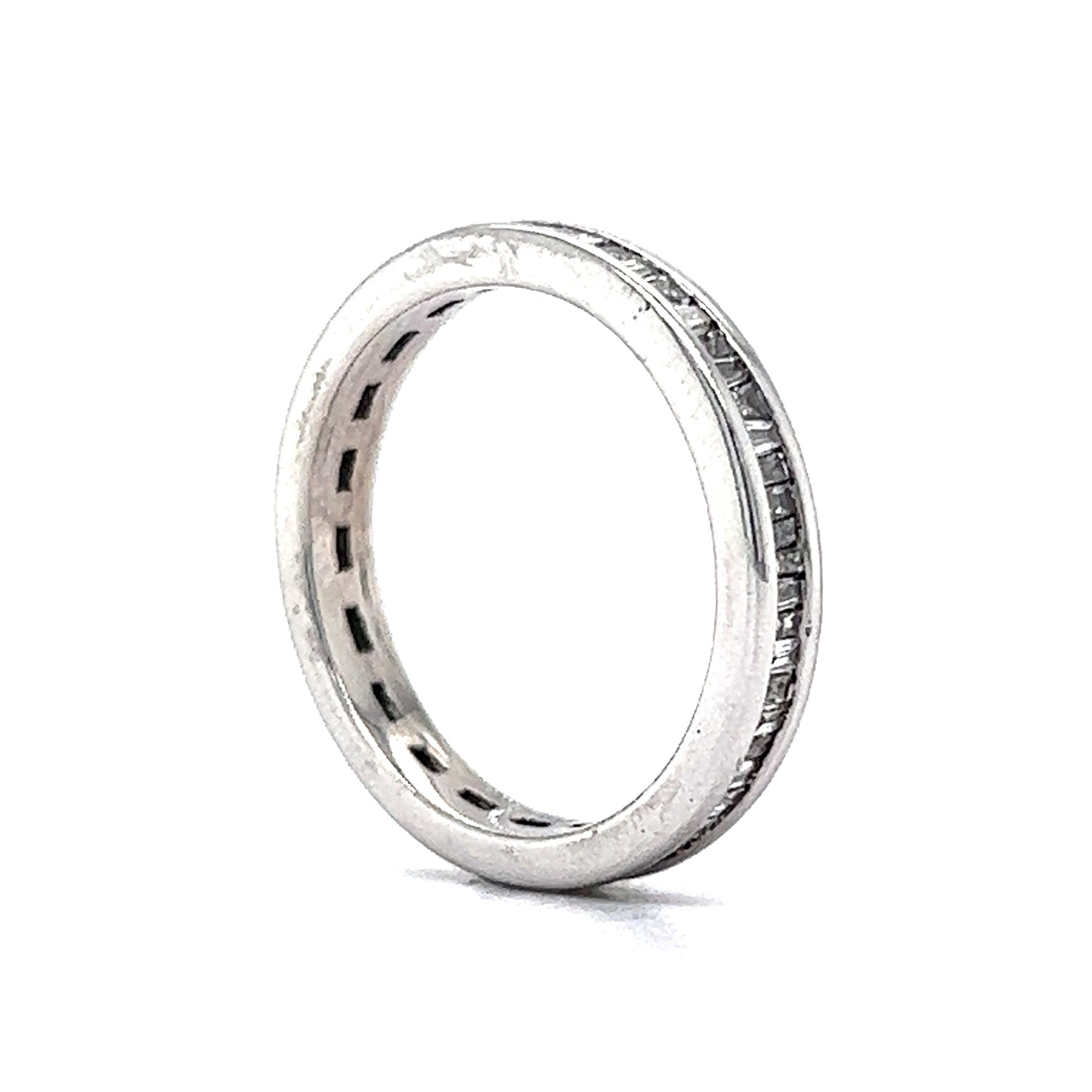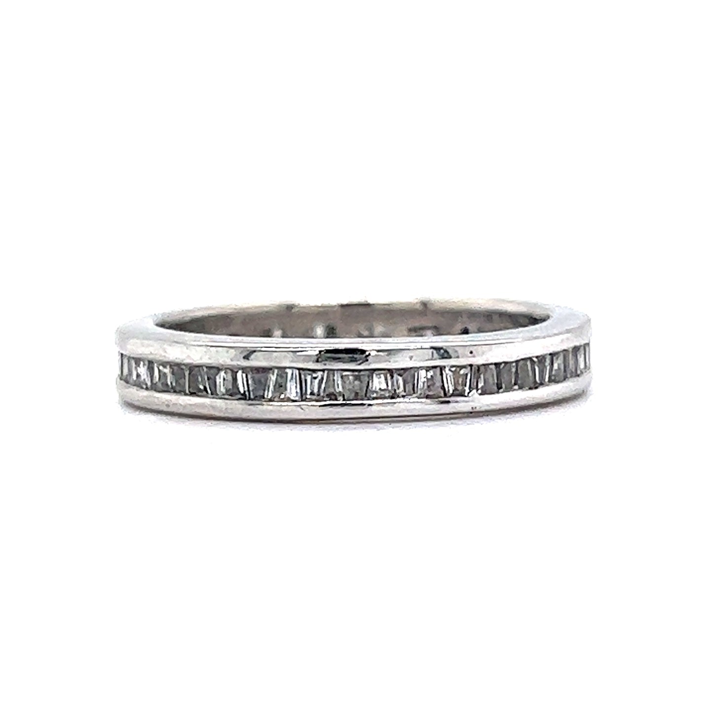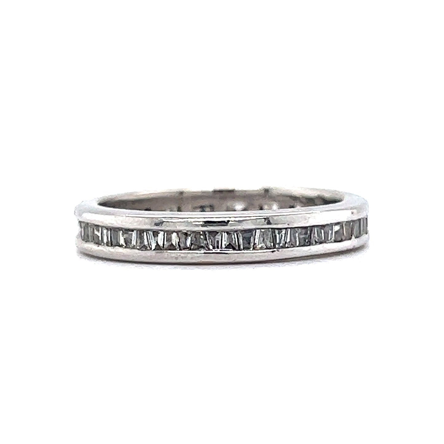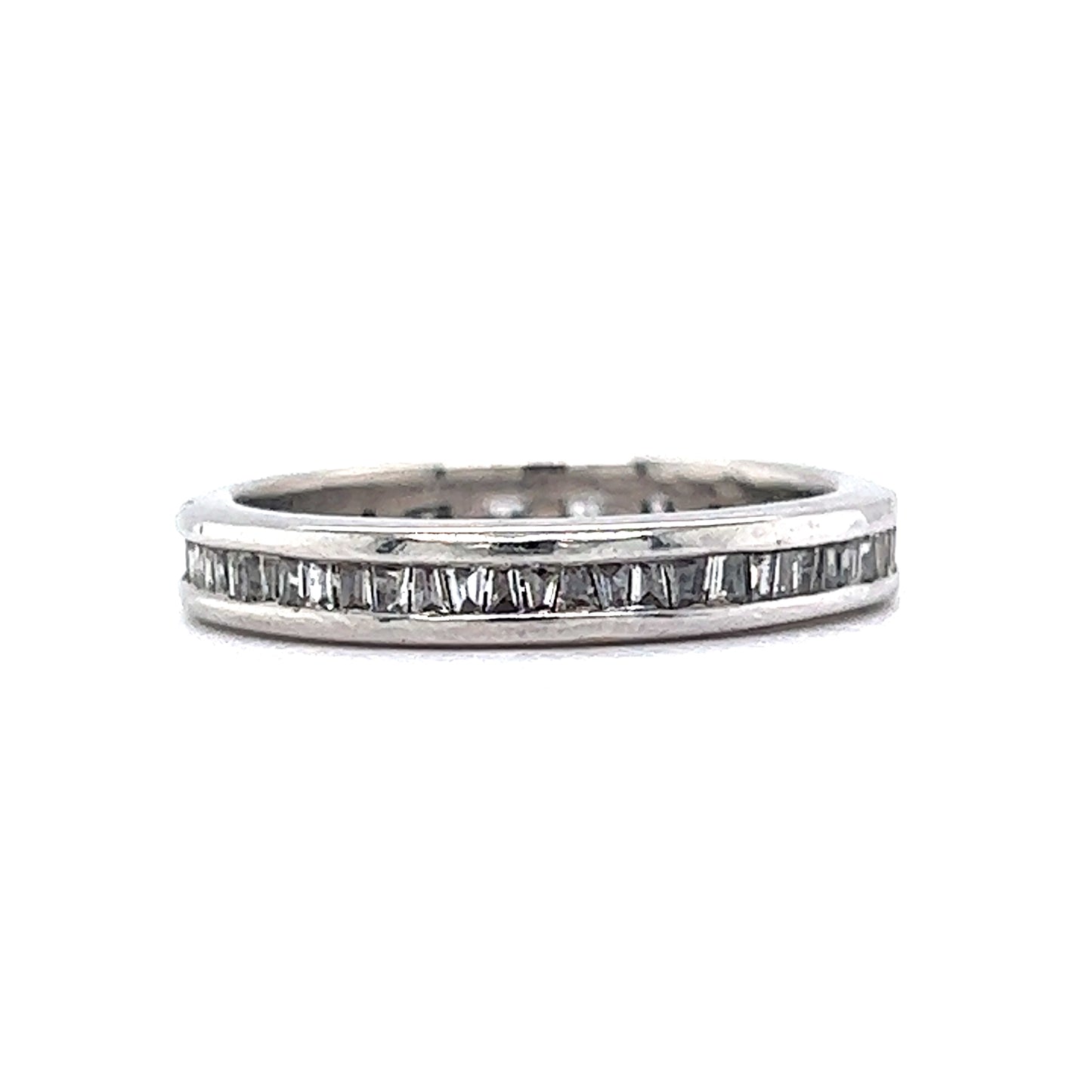 Channel Set Baguette Diamond Wedding Band in 14k White Gold. This modern diamond eternity wedding band features sixty-five (65) straight and tapered baguette cut diamonds in polished 14K white gold. The baguettes are channel set, bringing a elongated look and sparkle to the entirety of the band. At 3.10mm wide, this streamlined wedding band has a strong presence and easy to wear design. Pair this wedding band with a diamond engagement ring or and wear as a textural stacking ring on the right hand!