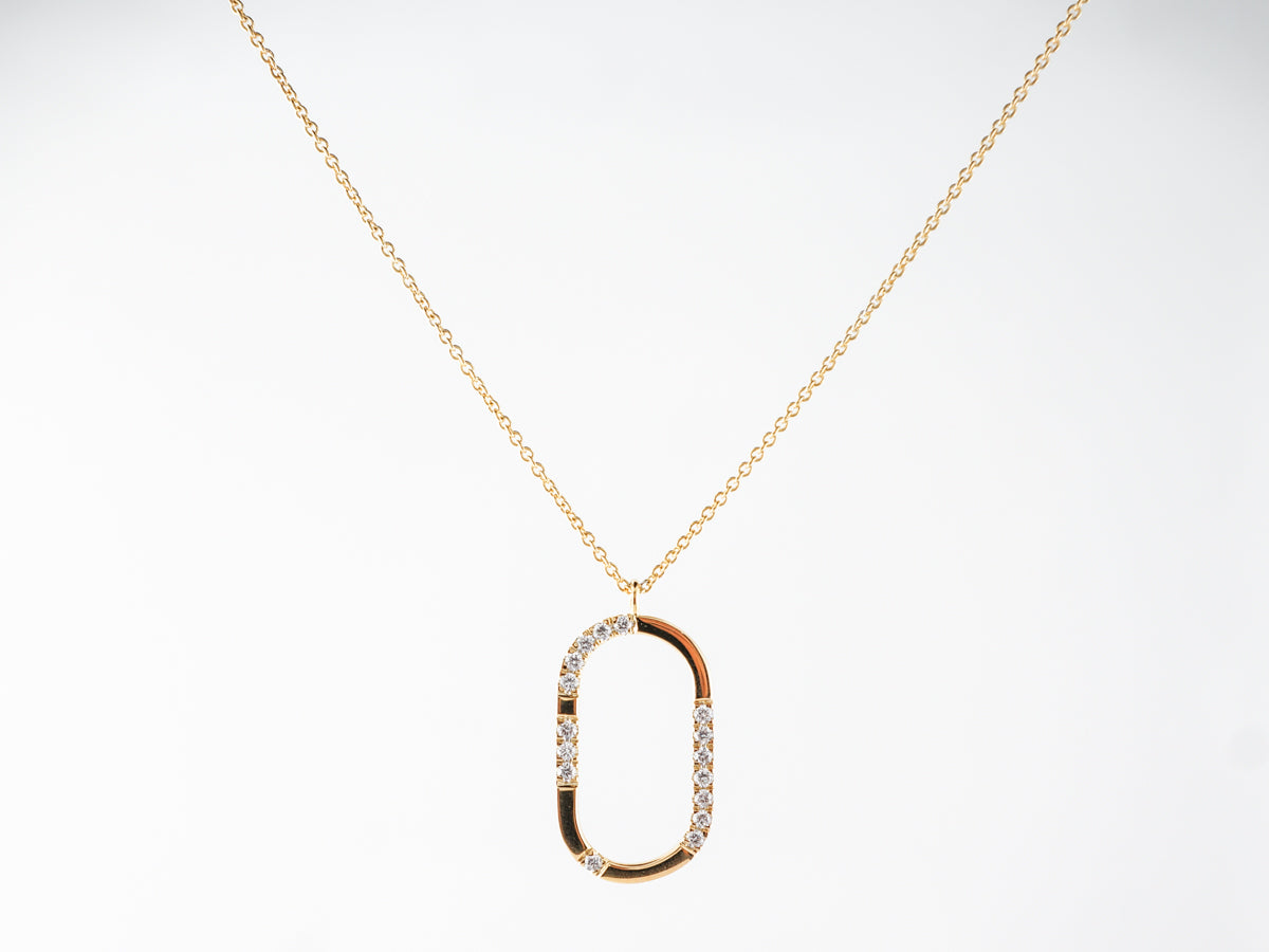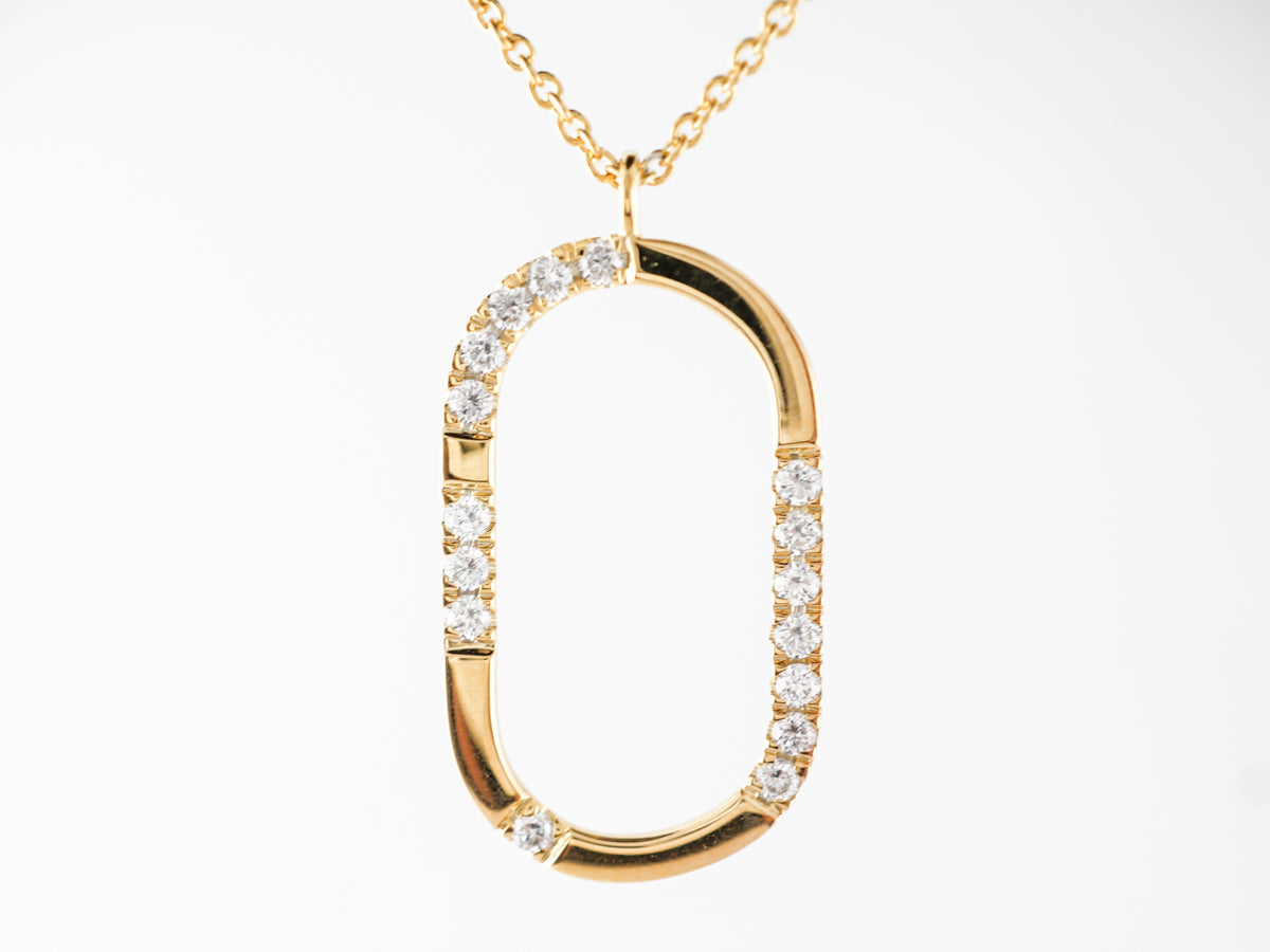 Circular Diamond Pendant in 18k Yellow Gold. This beautiful necklace features .14 carats of round brilliant cut diamonds which are finished in 18 karat yellow gold. The diamonds are seated on a gold oval pendant with flat sides lengthwise and are spaced out asymmetrically. The pendant hangs from a simple chain and presents a clean look that could be dressed up or dressed down for everyday wear.