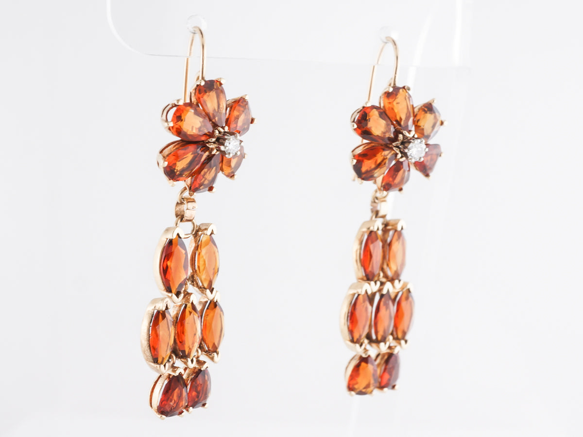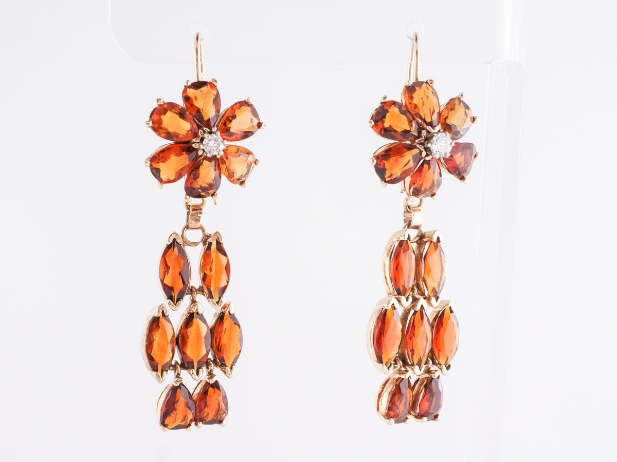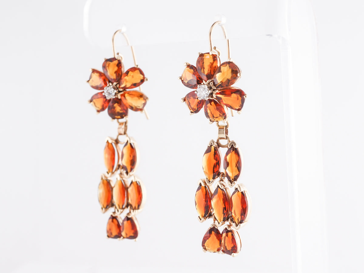 Citrine Dangle Earrings in 14k Yellow Gold. These impressive 14 karat yellow gold Modern citrine dangle earrings feature an estimated 10.00 carats of Madeira color citrine. The earrings are constructed with pear shaped Citrine set with a round brilliant diamond in the center creating a floral motif. The dangle portion of the earring is set with five (5) marquise citrines and two (2) pear shape citrines creating a fiery orange lattice with great movement.
