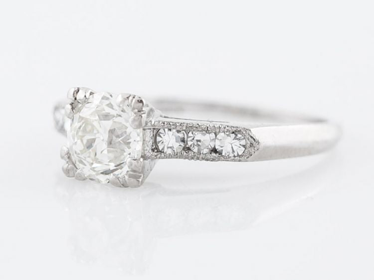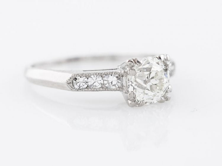 Classic 1 carat diamond engagement ring from the Art Deco period. The ring features a .96 carat old European cut diamond that is set with fishtail prongs at its center. To each side are three bead set single cut diamonds with milgrain edge accents. It is wonderful example of the fineness and geometric qualities that the Art Deco period is known for.