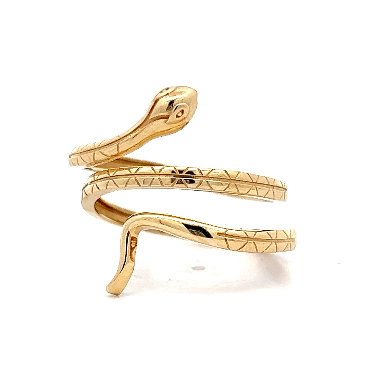 This sleek and stylish ring features a coiled snake design, crafted with intricate detailing and a textured finish for a bold and edgy look. The polished yellow gold adds a touch of elegance and shine to this modern piece. The snake's body features lightly engraved scales adding a bit of texture. A timeless ring that will be cool forever!