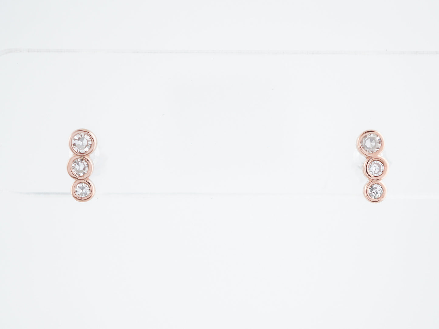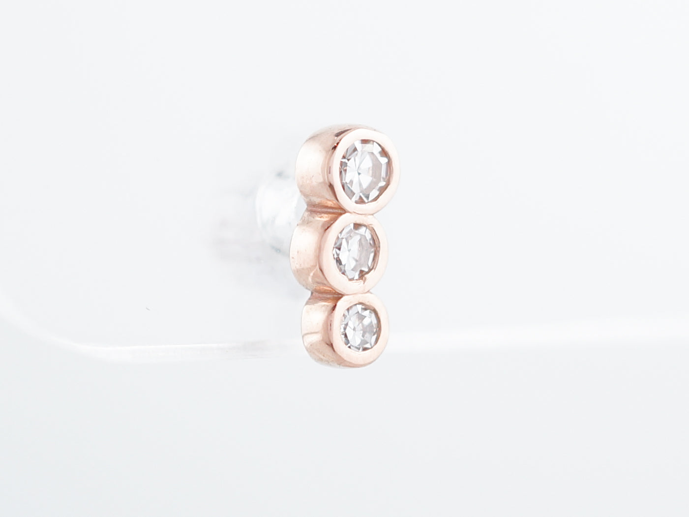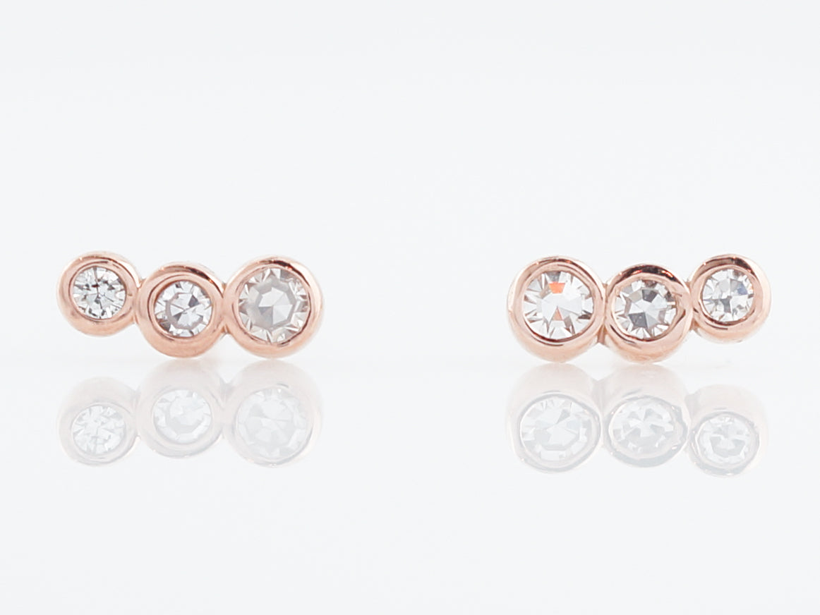 Turn the classic stud earring up a notch with this Modern Era ear climbers. Made in 14 karat rose gold, each earring holds three (3) single cut diamonds which are bezel set and graduate in size up the ear for .14 carats total weight. These studs are sure to be your go to earring for every day wear!