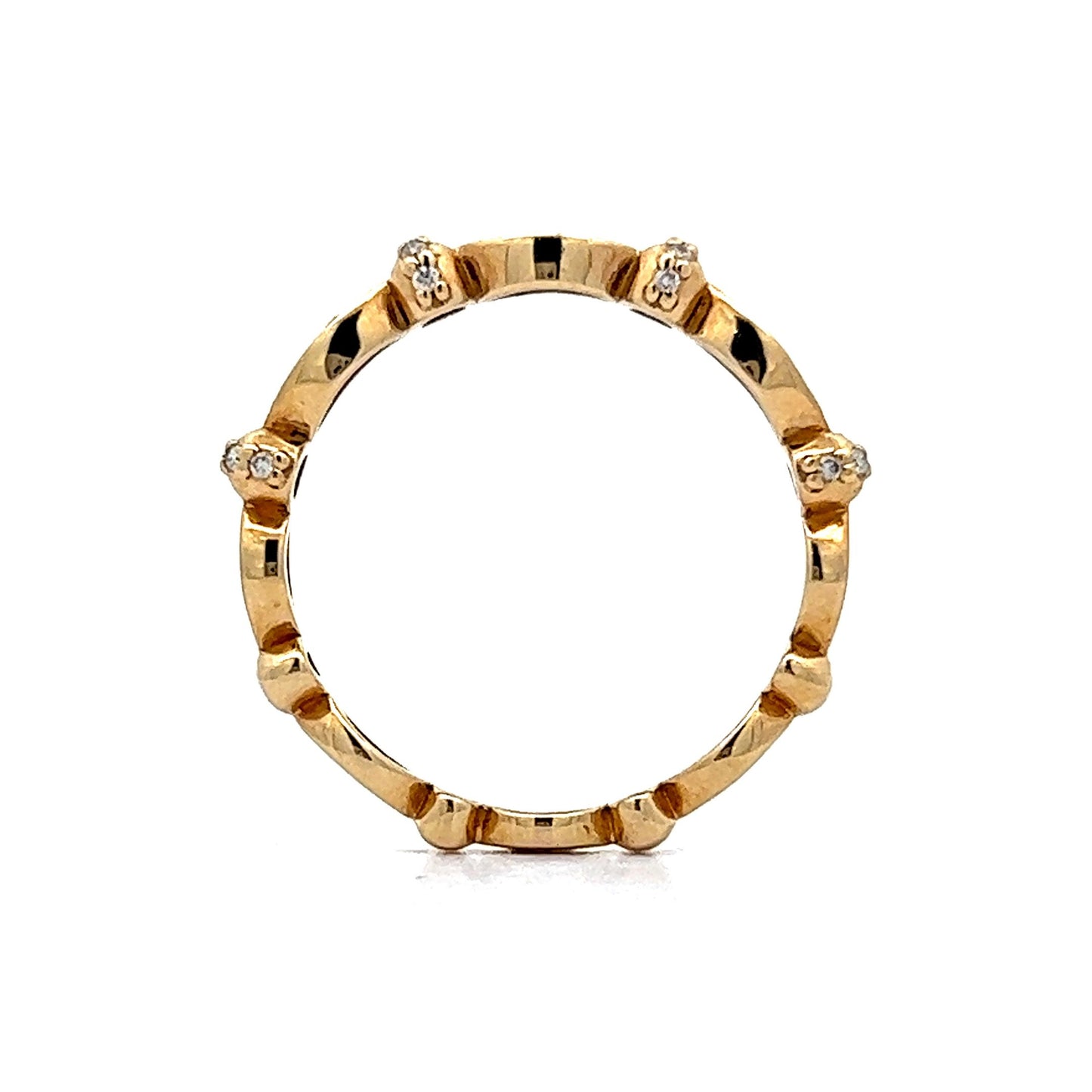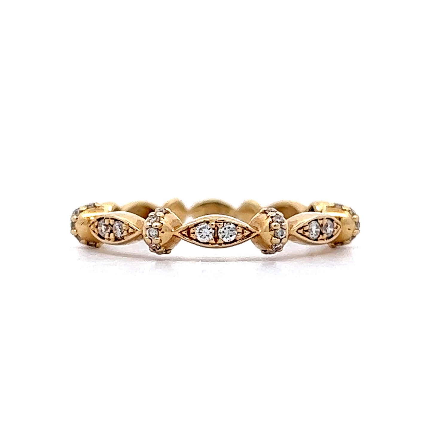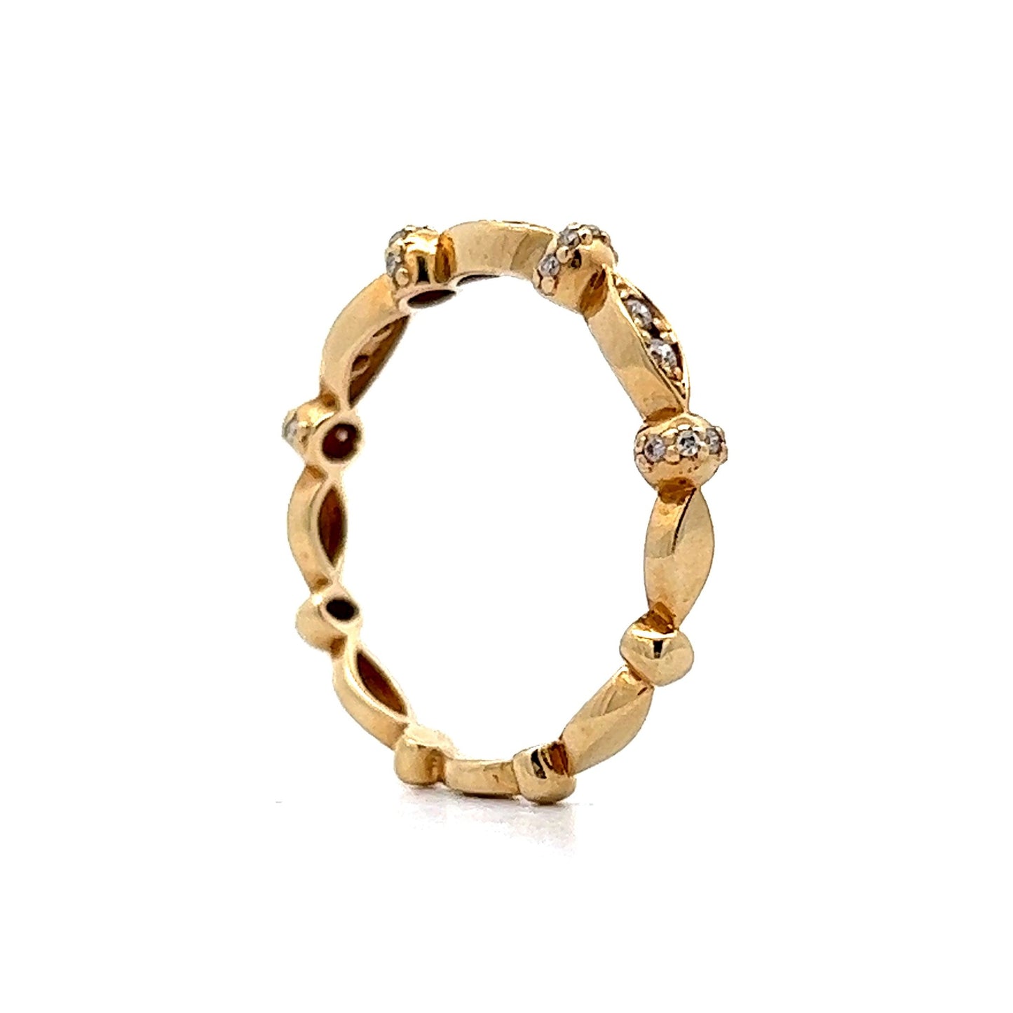 Cluster Diamond Wedding Ring in 14k Yellow Gold. This diamond wedding band features a repeating marquise and round shaped design in the 18 karat yellow gold. Across the entirety of the band are thirteen (26) .005 carat round brilliant cut diamonds in a clever repeating design. This band will add sparkle and dimension to any engagement ring.