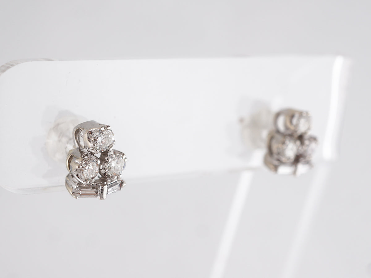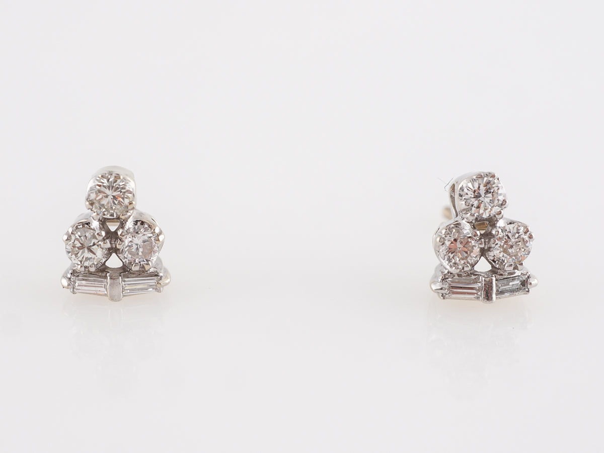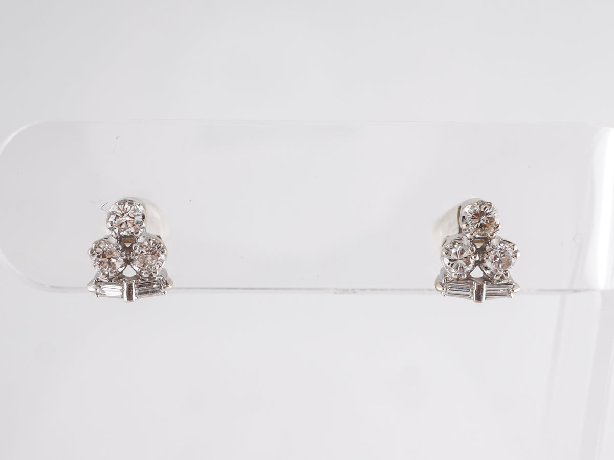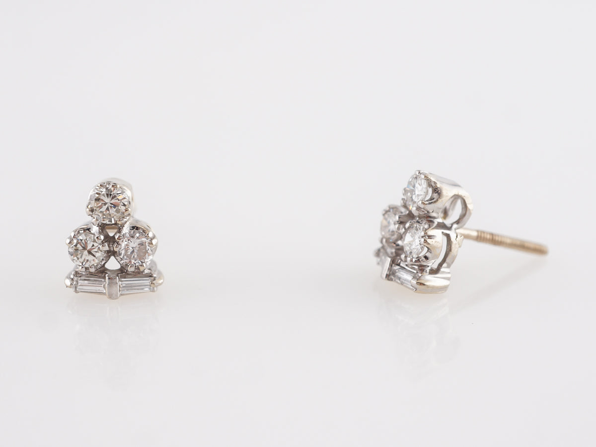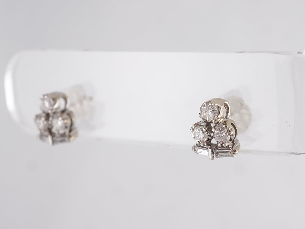 Cluster Earrings Studs w/ Round Brilliant Diamonds in 14k. These adorable cluster stud earrings feature .72 carats of diamonds set in 14 karat white gold. The cluster is made of three (3) round brilliant cut diamonds in a bit of a triangle, sitting just above two (2) baguette cut diamonds. The variety of diamond cuts gives this cluster a nice diversity in the type of refraction you get from these fancy stud earrings.