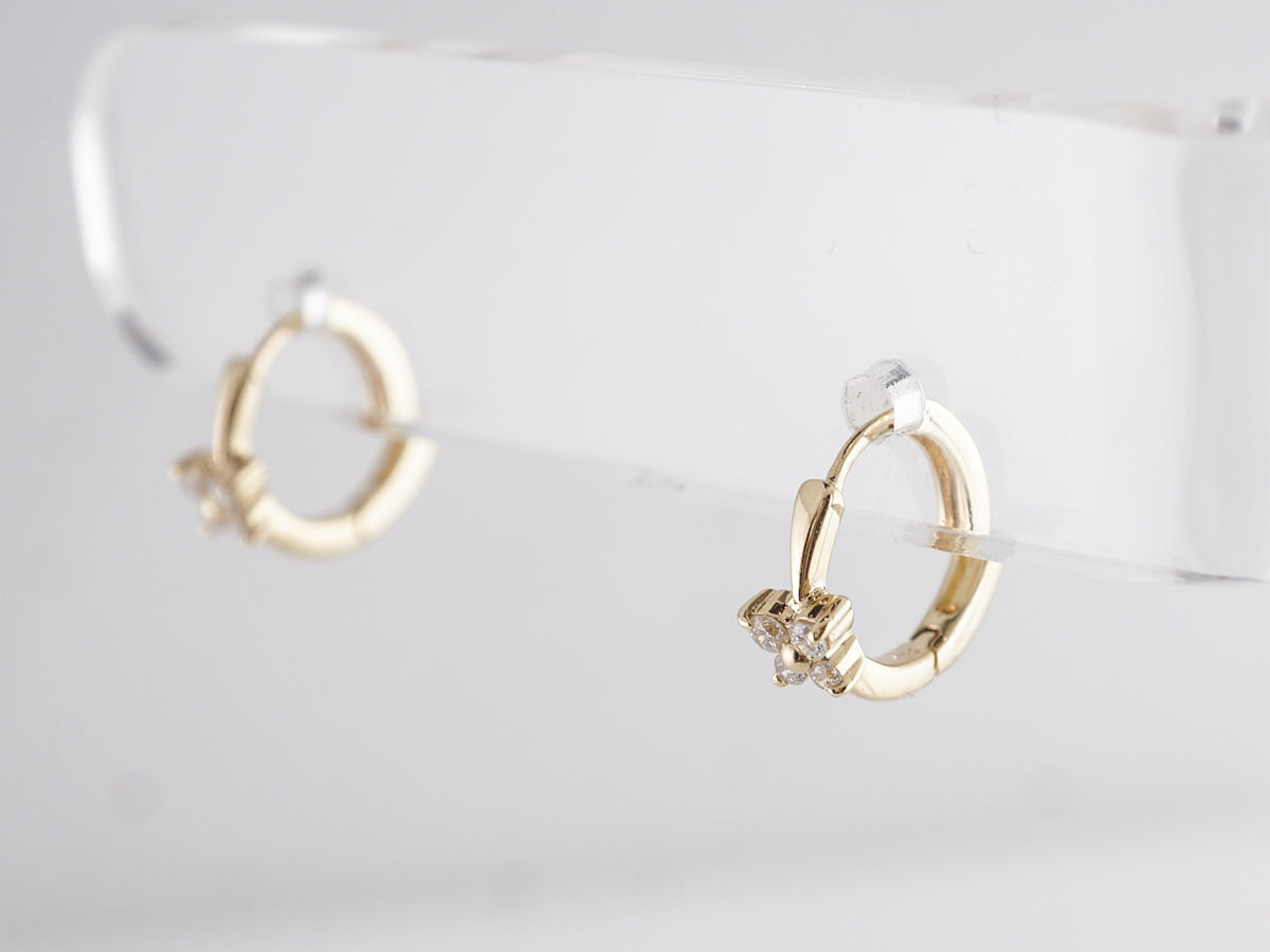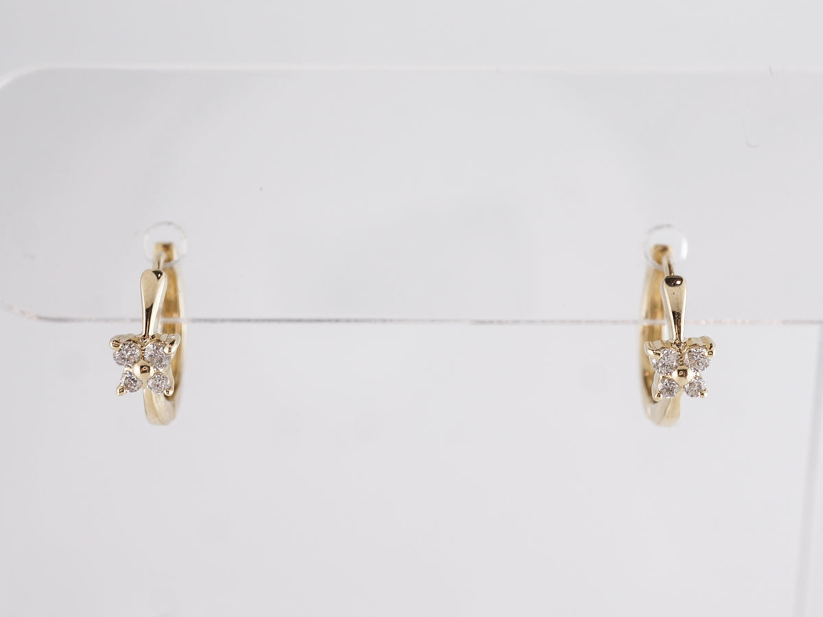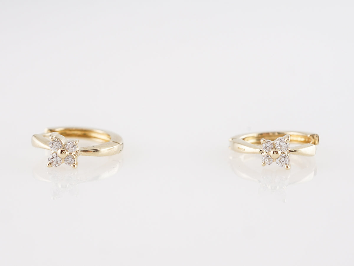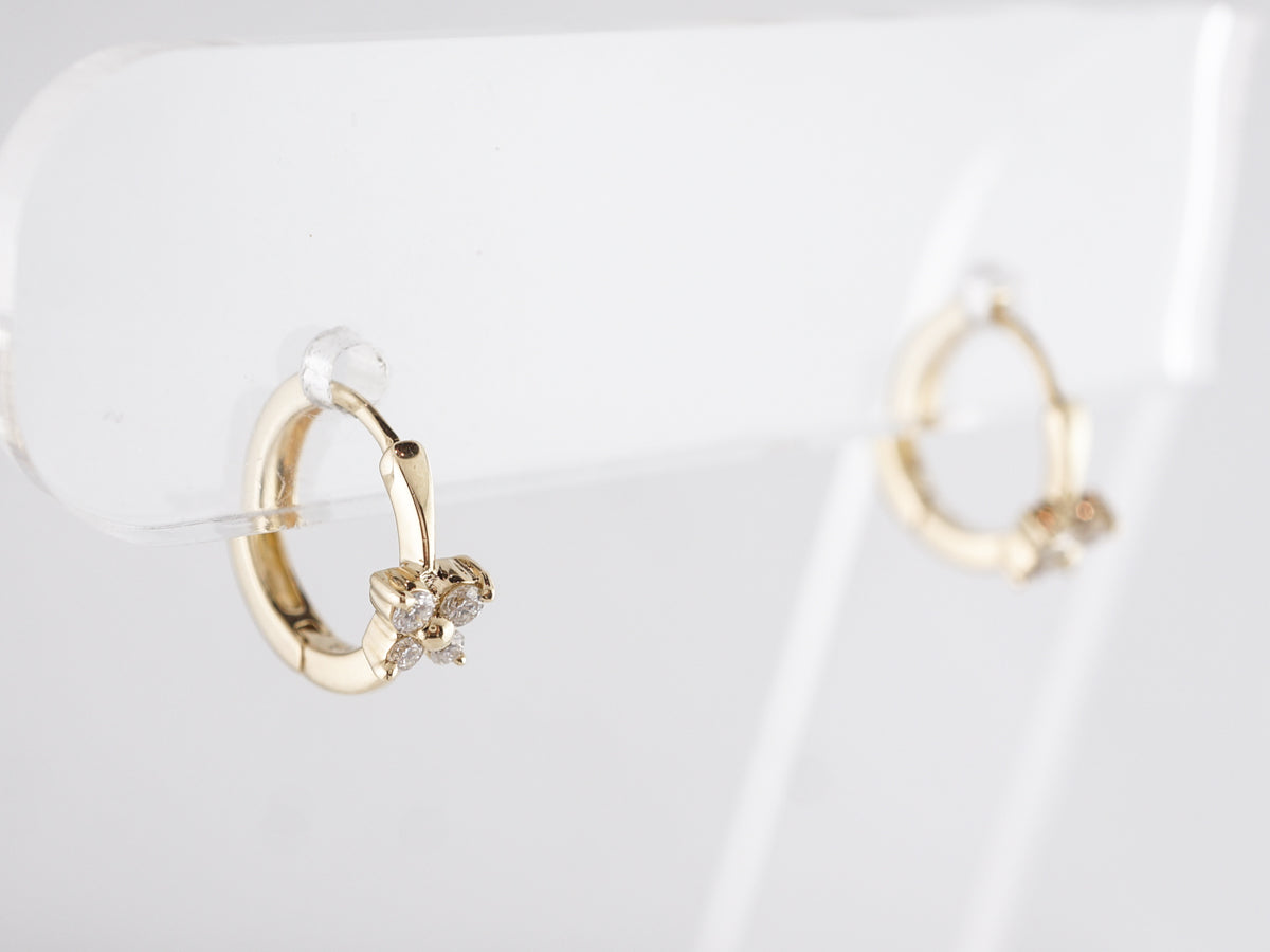 Cluster Earrings w/ Round Brilliant Diamonds in Yellow Gold. These cute cluster earrings feature .16 carats of round brilliant cut diamonds set in 14 karat yellow gold. The four (4) diamonds are set together with a single gold bead giving them a little space. These small cluster hoops are a perfect pair for everyday wear.