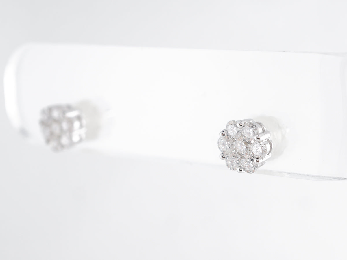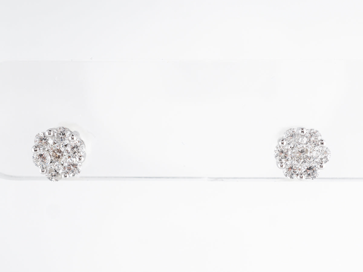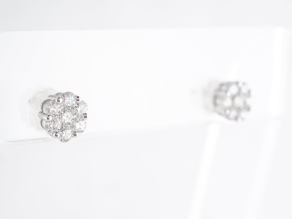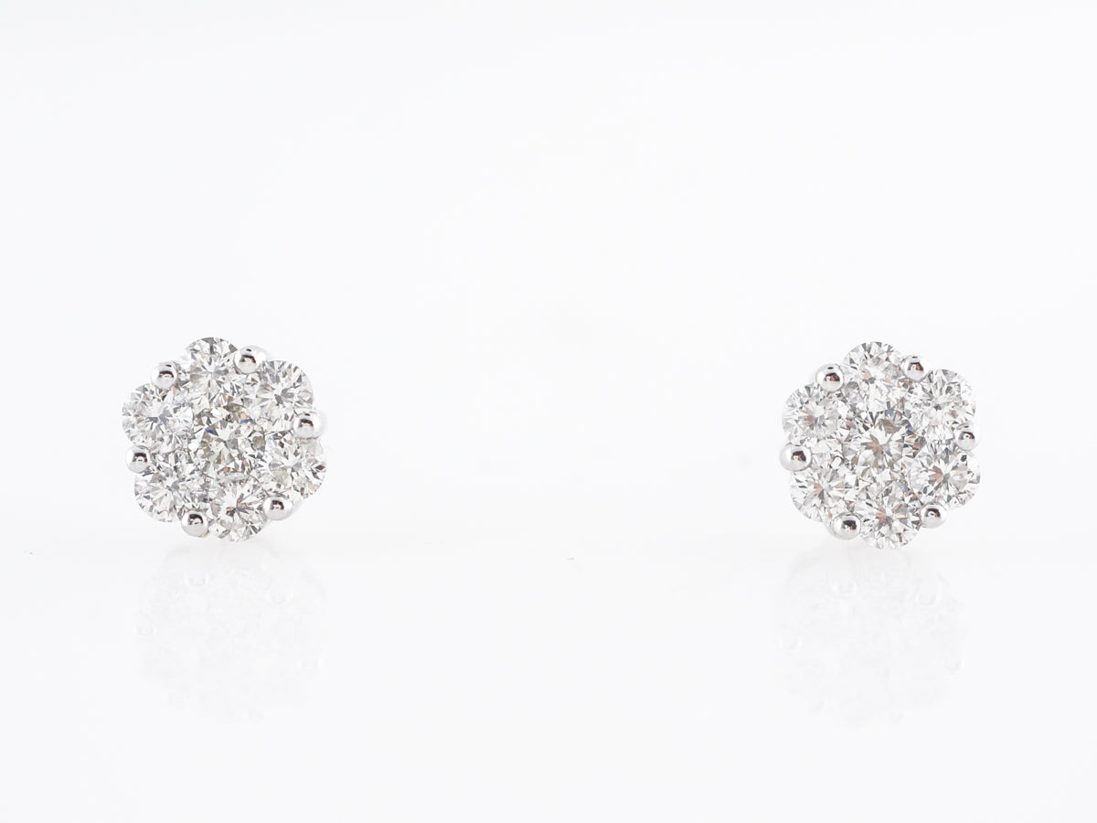 Cluster Pave Earring Studs w/ Round Brilliant Diamonds. These modern cluster stud earrings feature .76 carats of round brilliant cut diamonds set in 14 karat white gold. These would make fabulous everyday earrings and their design provides a much larger diamond look than their weight would indicate.