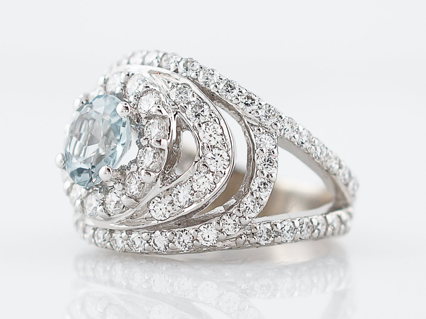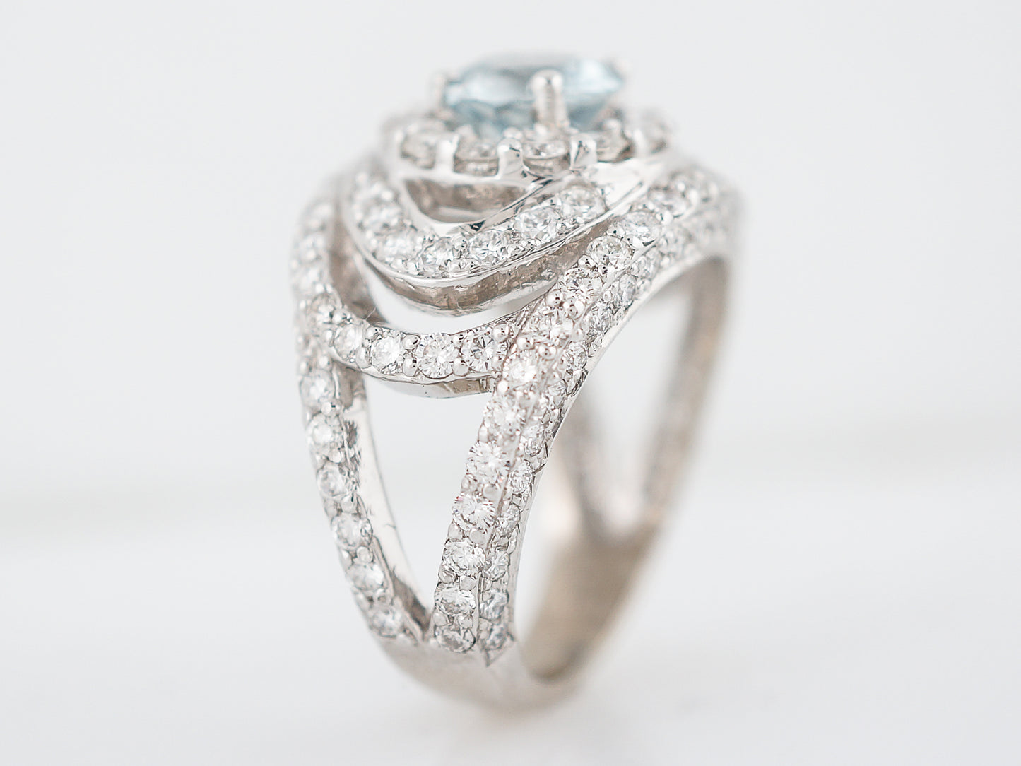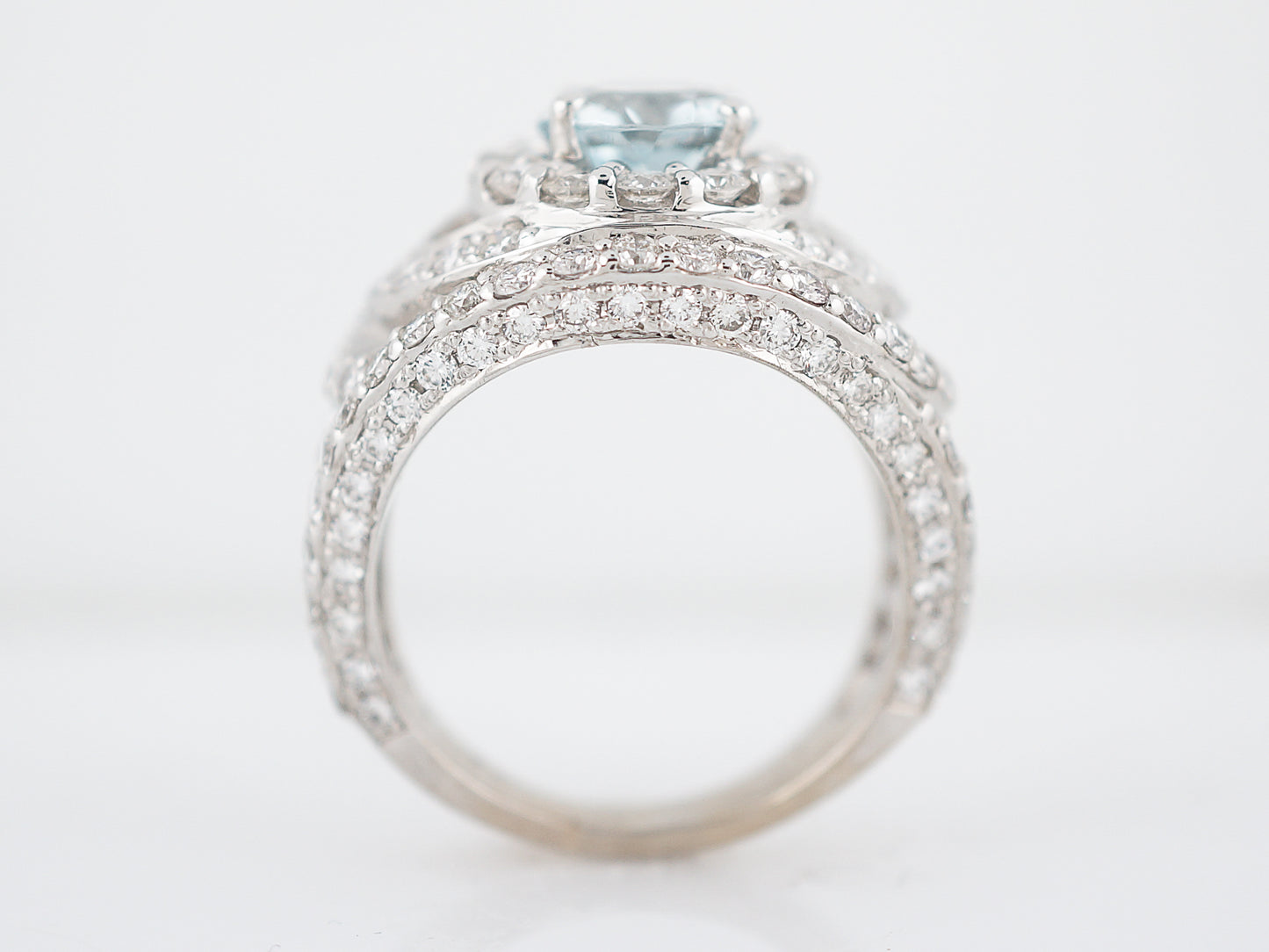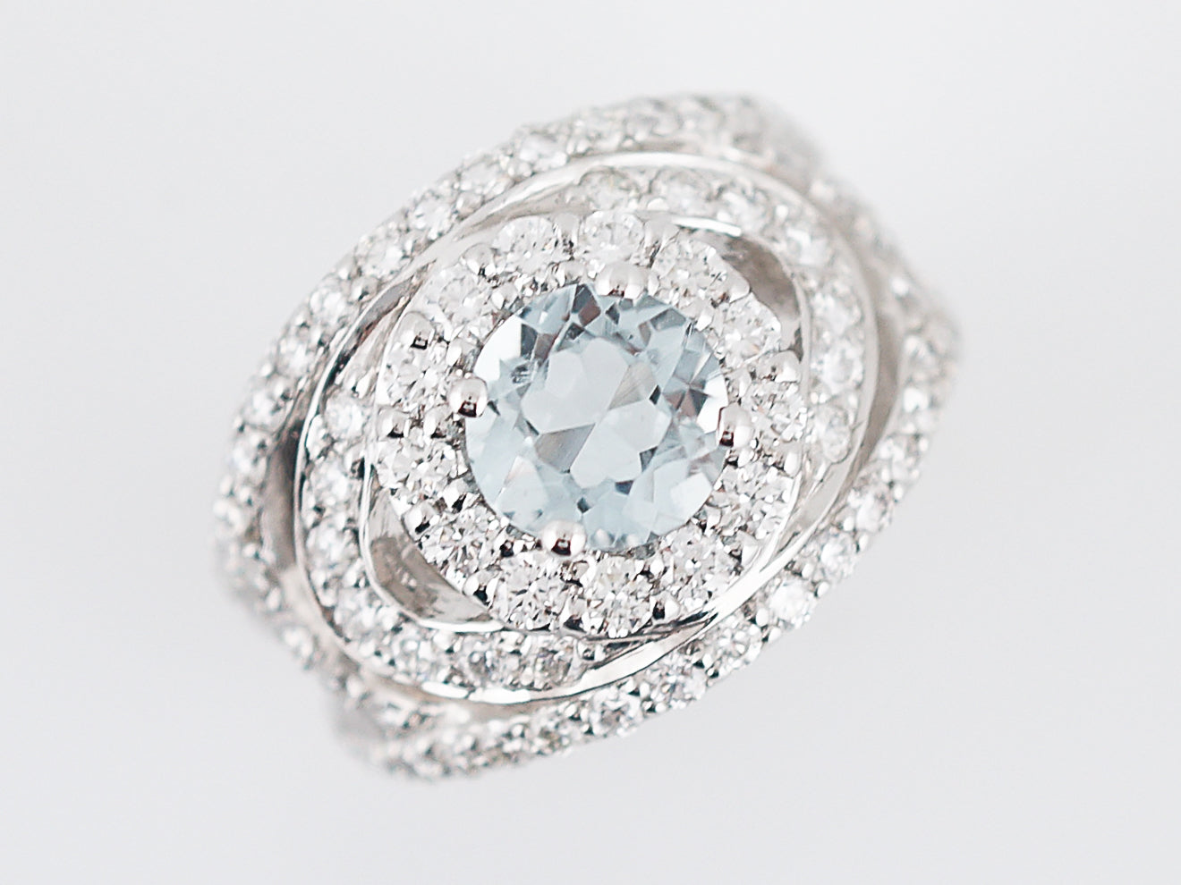 Decked out in diamonds, this Modern Era Aquamarine ring makes a bold, and sparkly, statement. Cast in 18 karat white gold, the focal point of this ring is the 1.20 carat icy blue Aquamarine which is surrounded by a halo of round brilliant cut diamonds. The setting is comprised of curvilinear lines of prong set diamonds, for a total carat weight of 2.00 carats of diamonds. Measuring just over 15 millimeters in width, this ring is sure to turn heads.