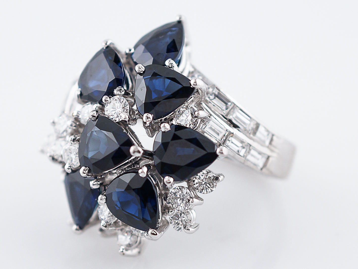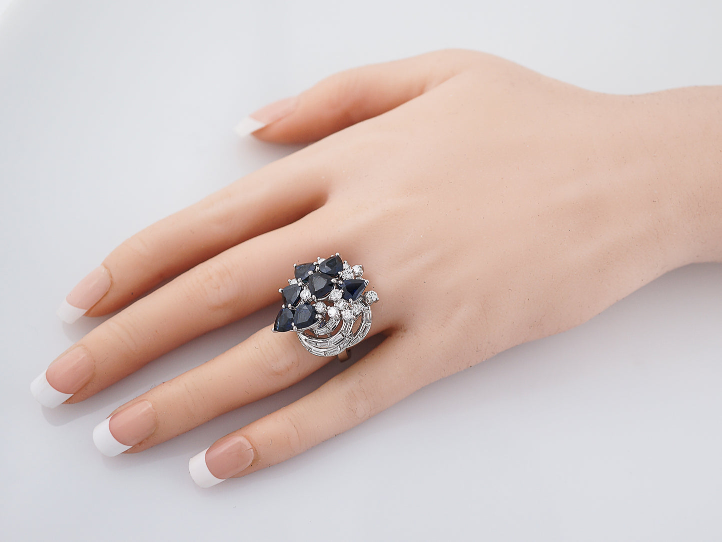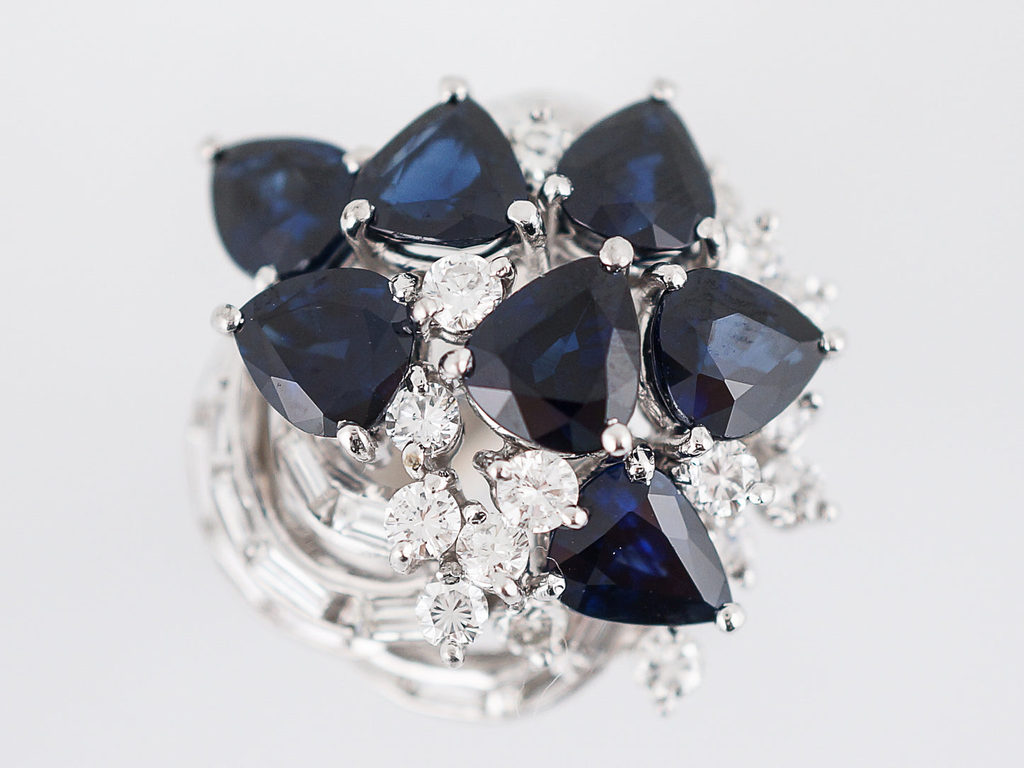 This Modern Era ring is a piece we could get lost in. Winding channels of baguette cut diamonds swirl around a spray of chubby, pear shaped sapphires which have a deep, dark blue hue. Prong set round diamonds are nestled between the the pears. All the shapes and colors in this piece give it dimension and sparkle from every angle.