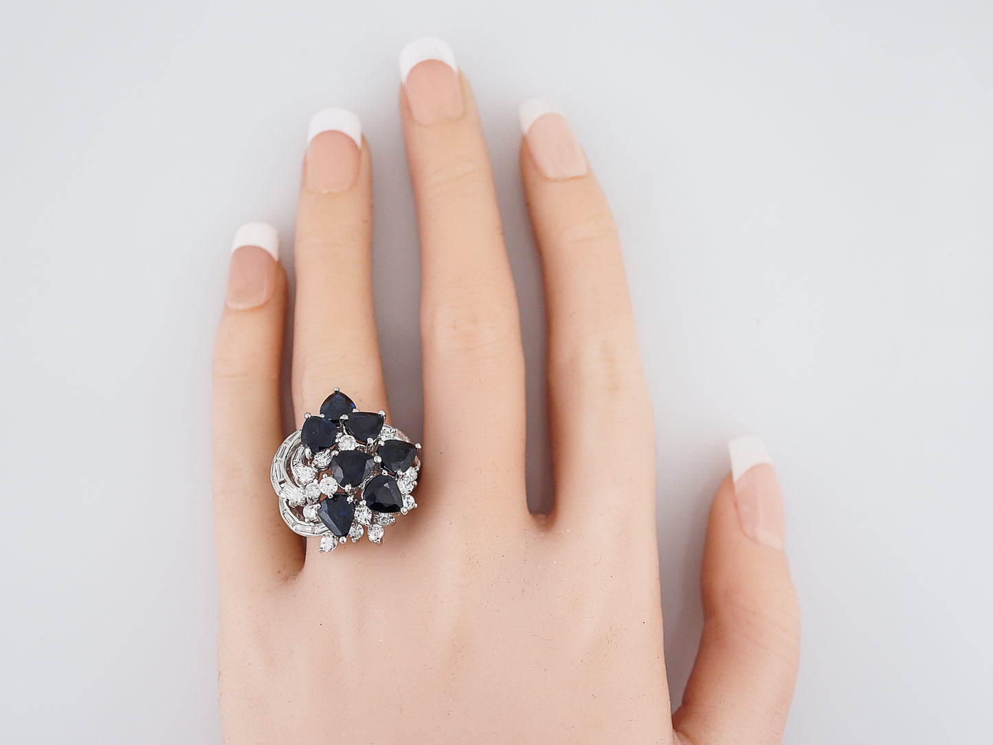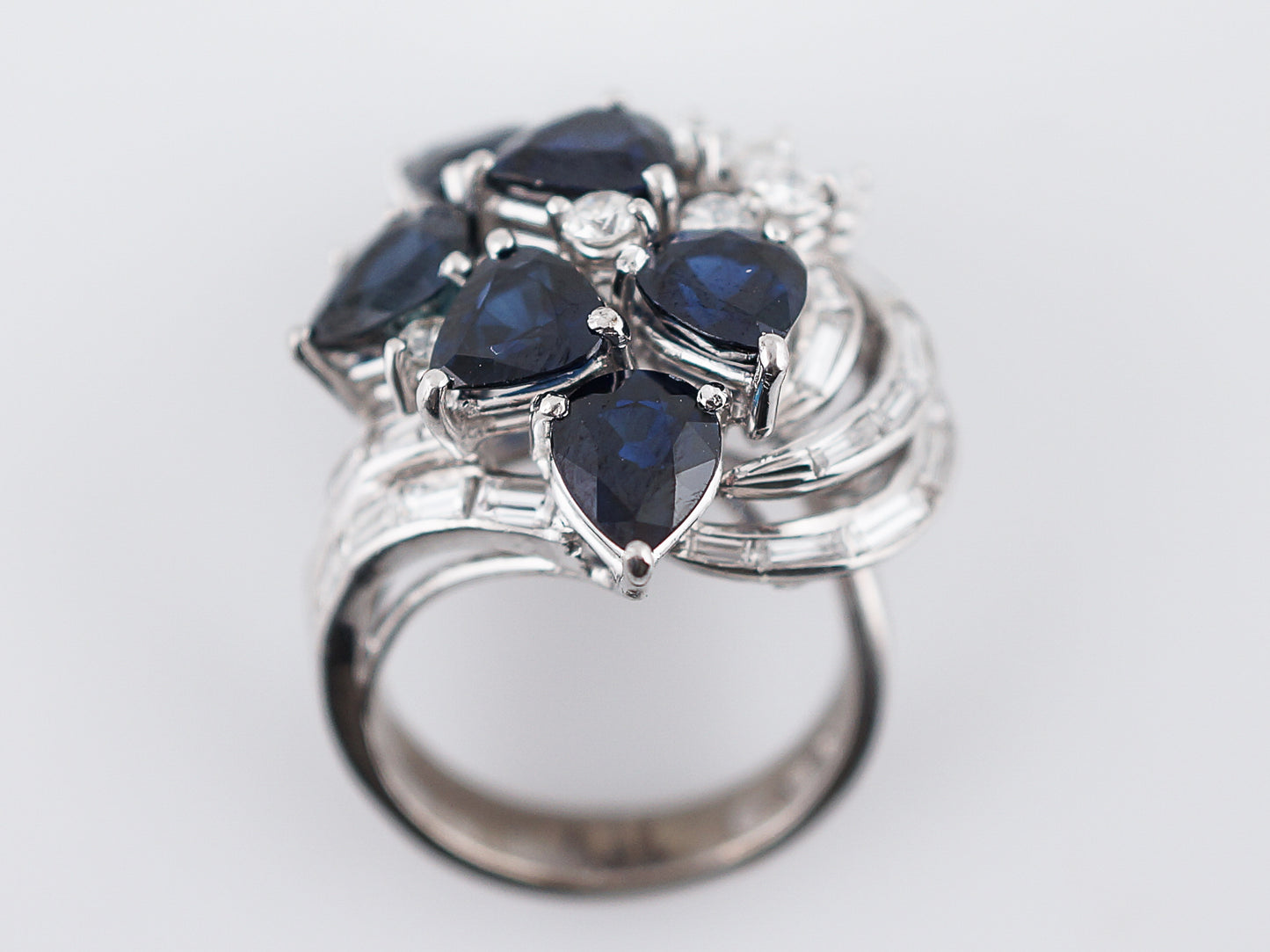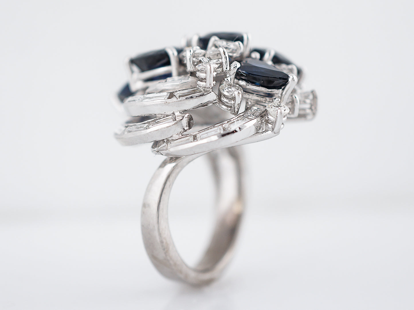 This Modern Era ring is a piece we could get lost in. Winding channels of baguette cut diamonds swirl around a spray of chubby, pear shaped sapphires which have a deep, dark blue hue. Prong set round diamonds are nestled between the the pears. All the shapes and colors in this piece give it dimension and sparkle from every angle.