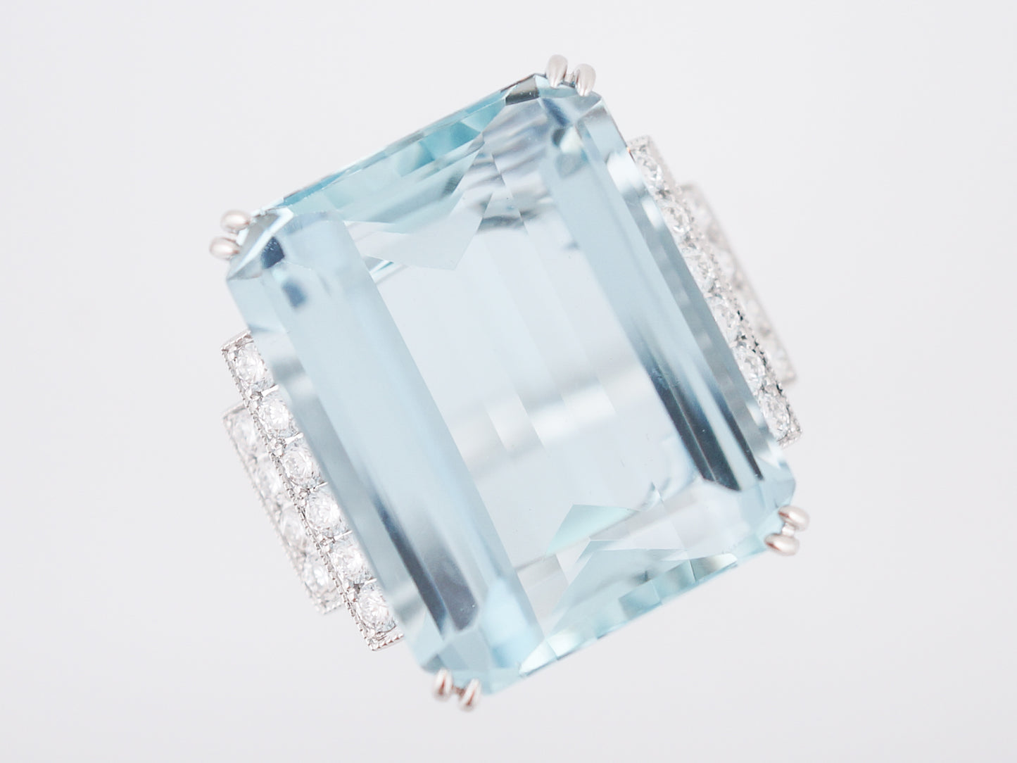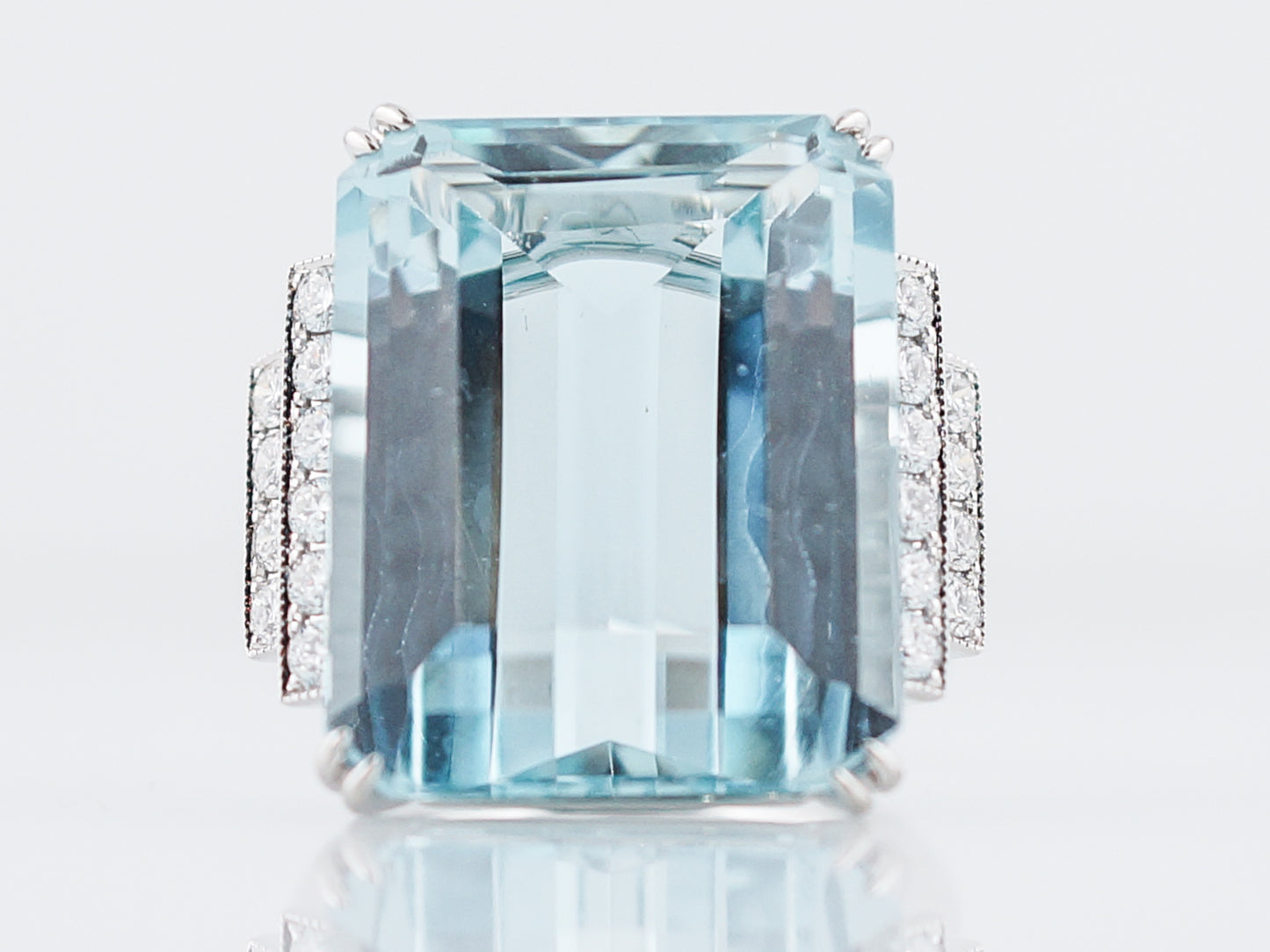 This Modern cocktail ring has a stunning sky blue aquamarine at its center that weighs 22.68 carats. The large emerald cut aquamarine is accented by round brilliant diamonds on each side that total .60 in carat weight. The diamonds are set into vertical strips of metal adding to the sleek, geometric feel of this piece.
