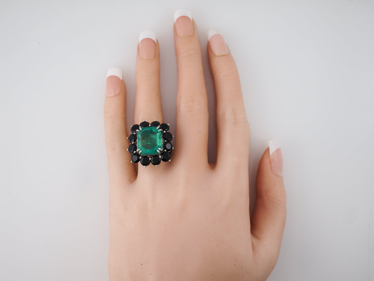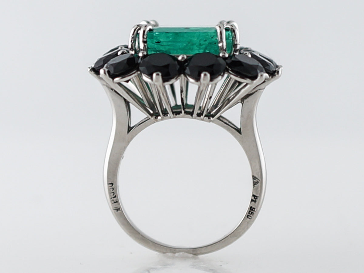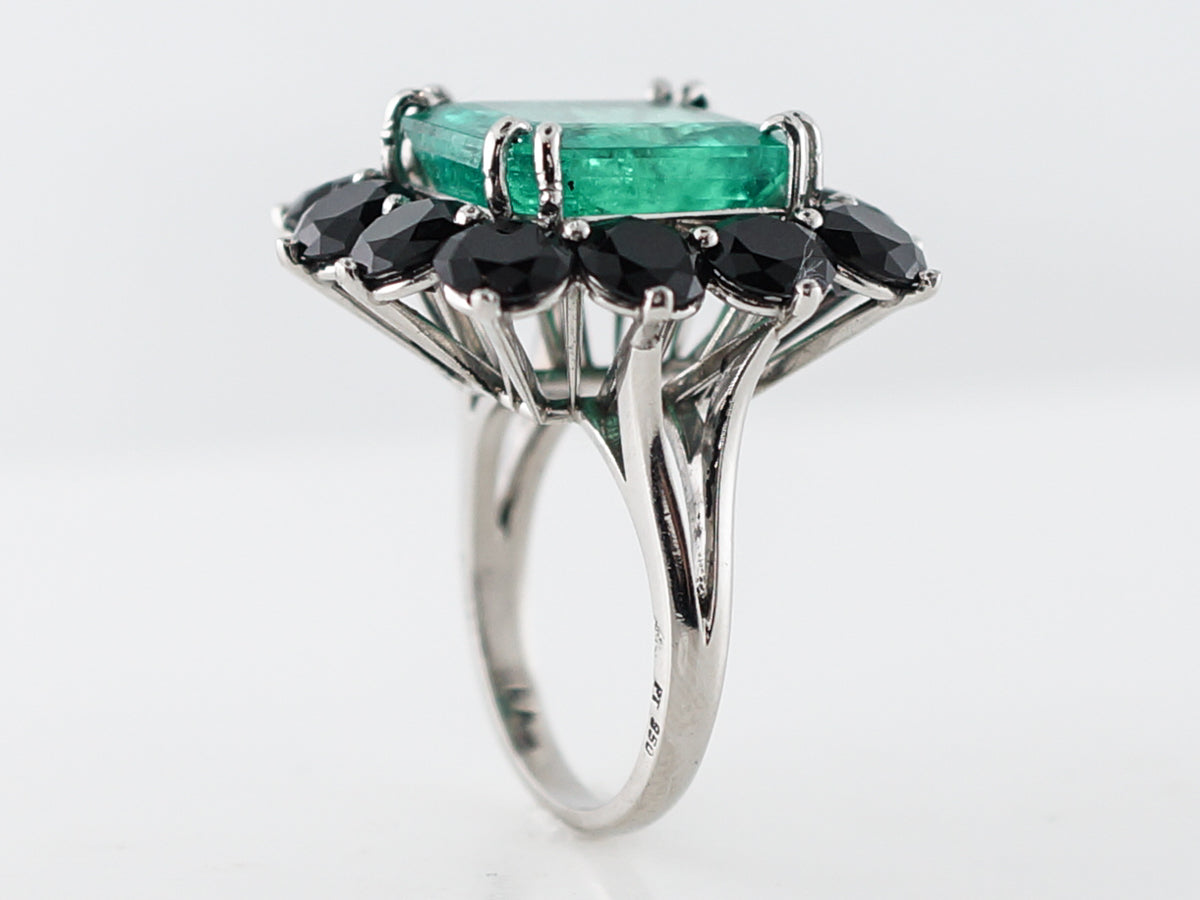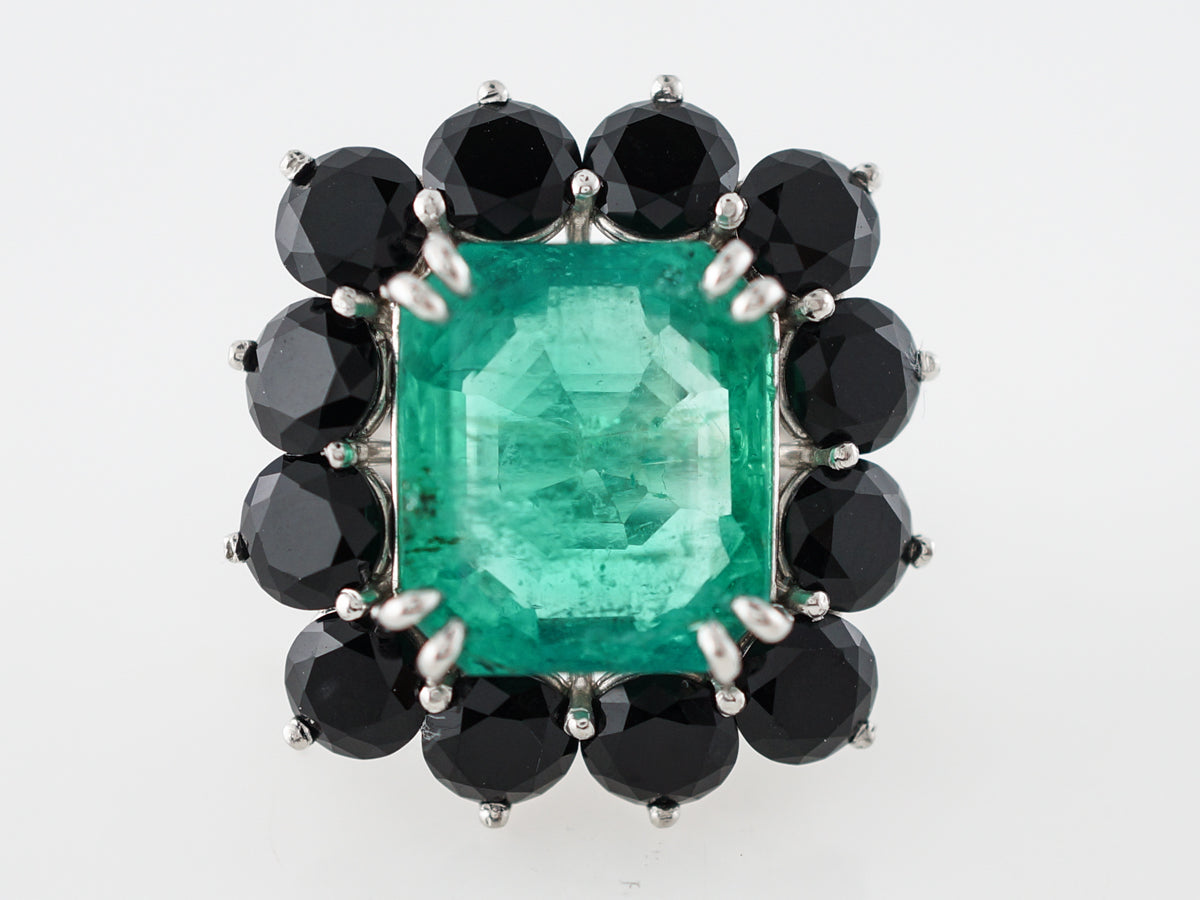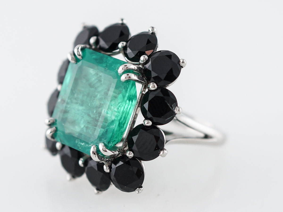 This modern cocktail ring makes an unforgettable statement! Playful enchanting. Fine Jewelry in an expert design. The center stone is a 7.89 carat, GIA certified, emerald cut emerald. Twelve (12) round cut black onyx gemstones halo the center stone providing the visual appeal of bold contrast. This beautiful display of gems is secured in a platinum mounting. A Cocktail Ring ready for the disco!