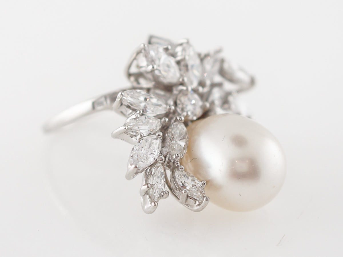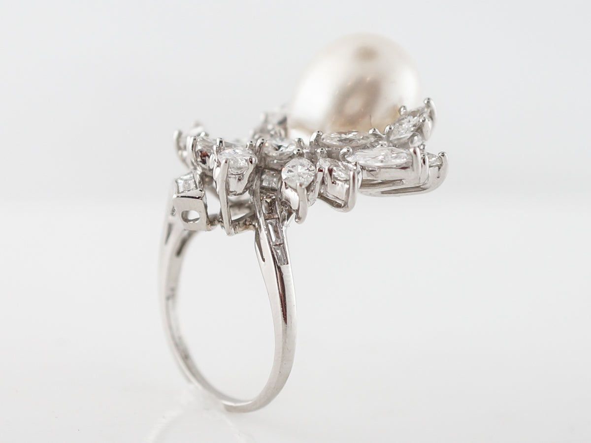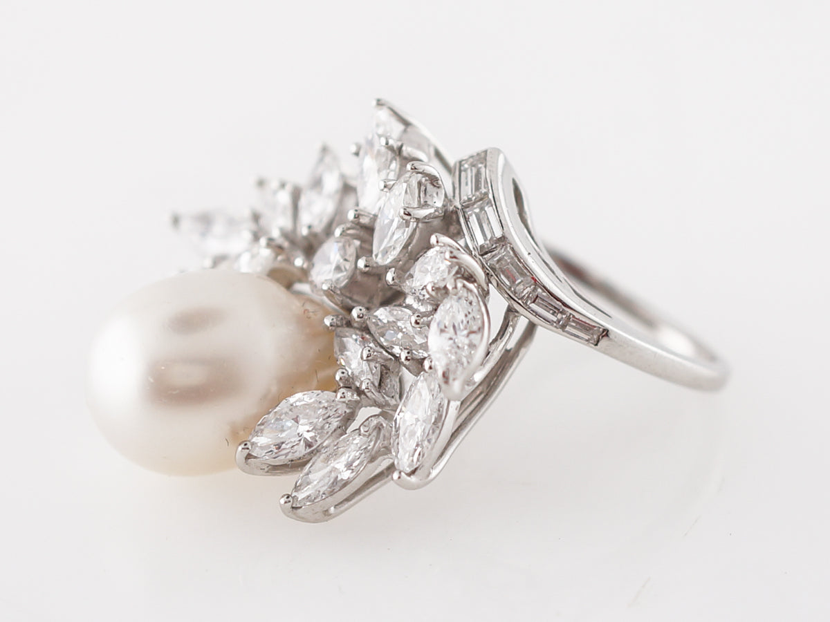 Cocktail Ring Modern Pearl & 4.50 Marquise & Baguette Cut Diamonds in Platinum