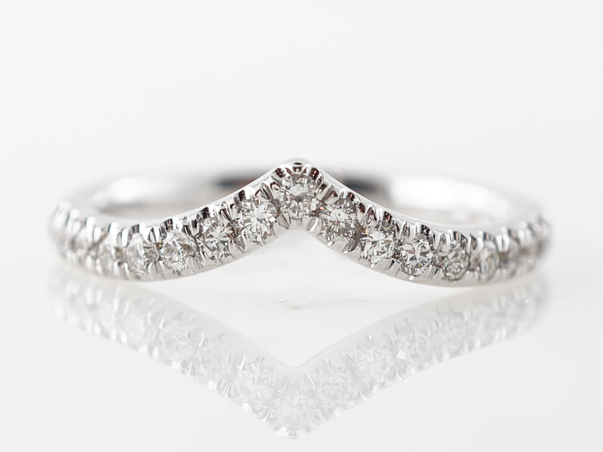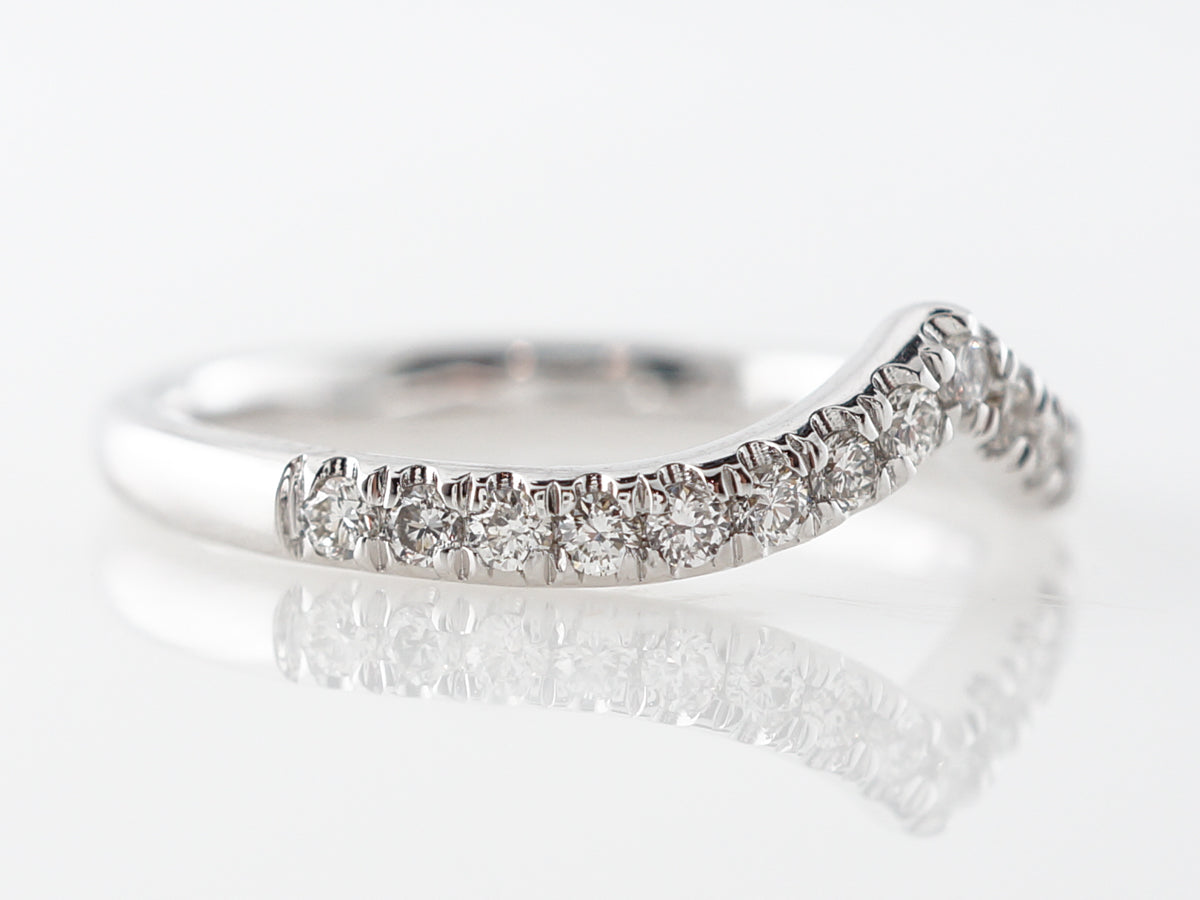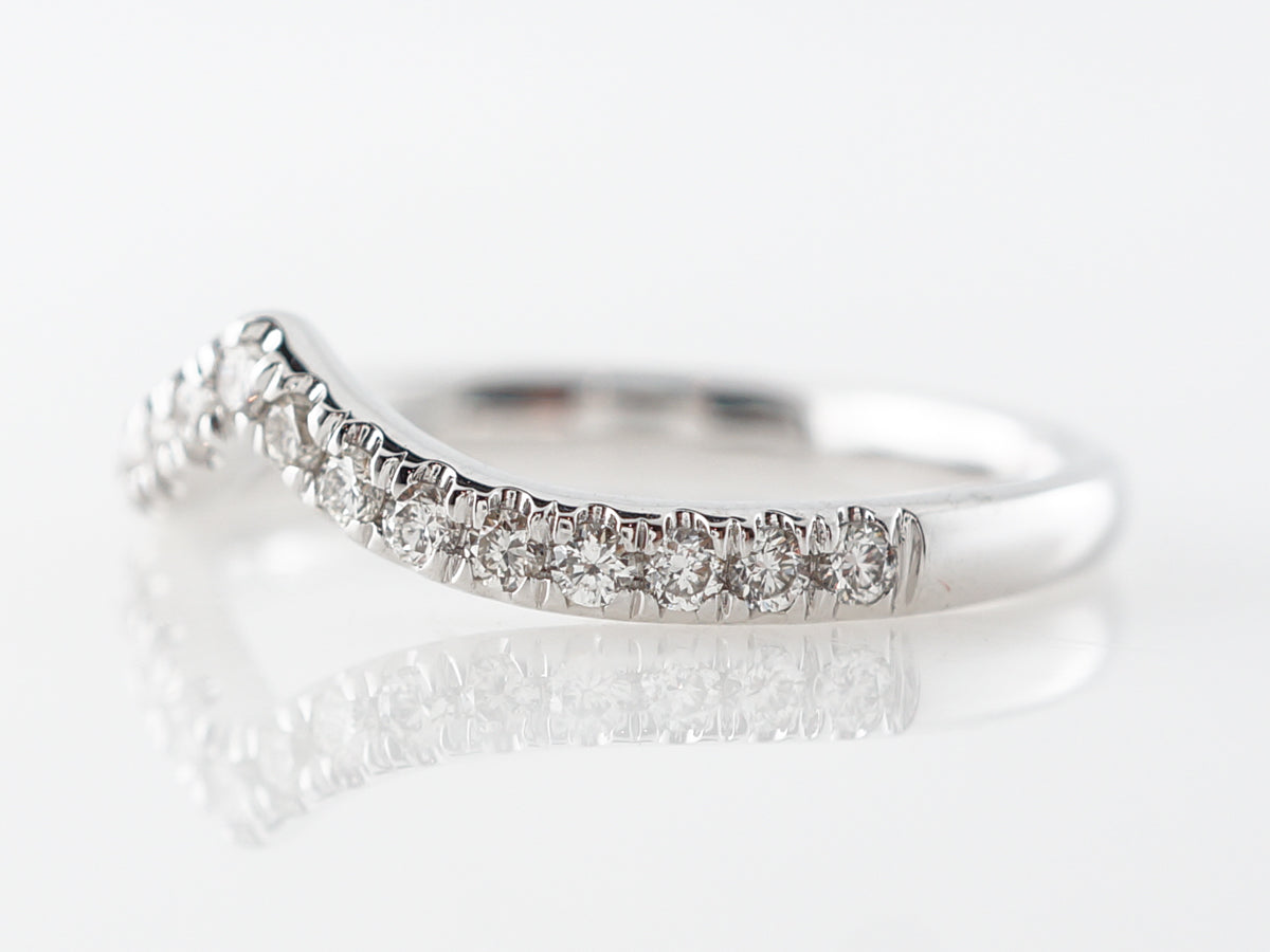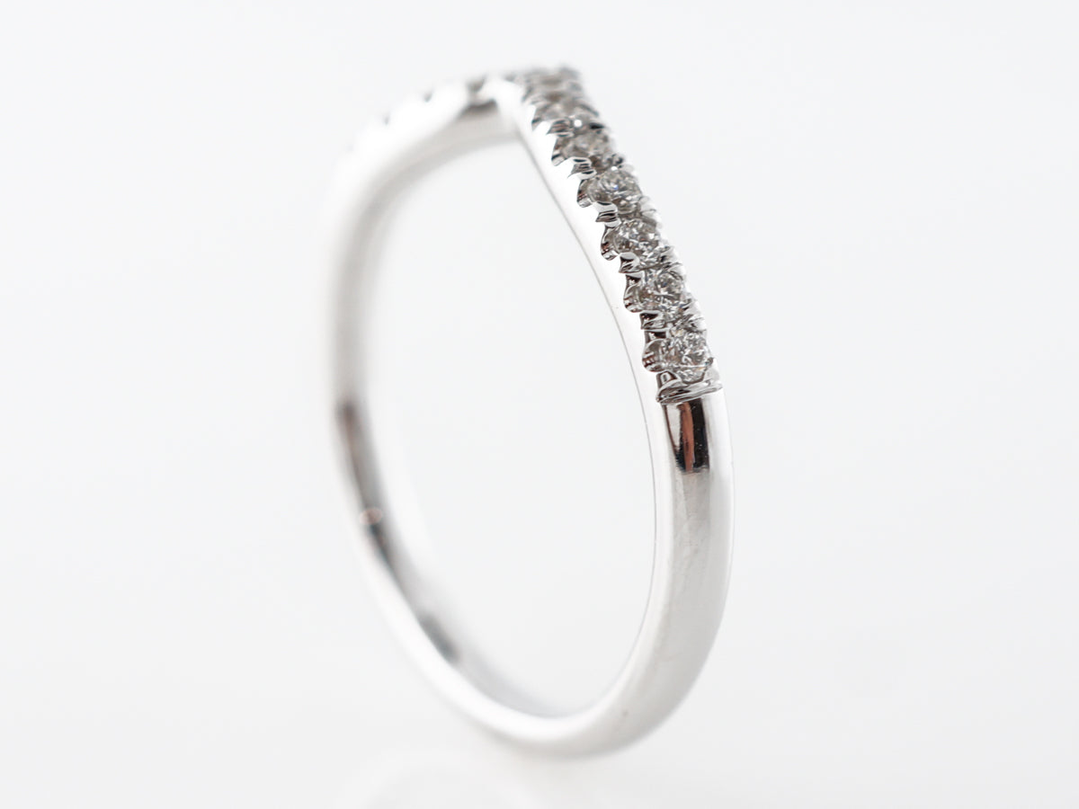 Contour Accent Diamond Band in 14k White Gold. This curved diamond wedding band is finished in 14 karat white gold. The curve in the band allows a wider engagement ring to fit snuggly against the band. The band features seventeen (17) round brilliant diamonds bead set in a single line for a total weight of .29 carats.