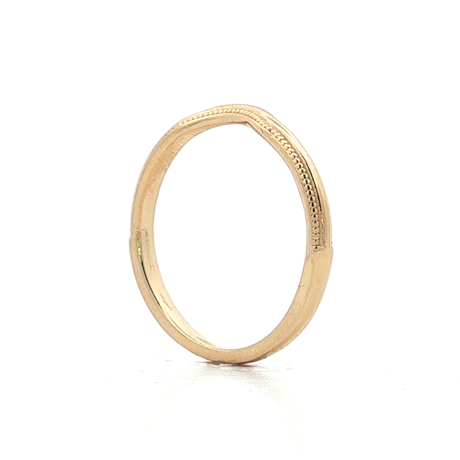 This 14k yellow gold wedding band features a contoured design with milgrain edging along the sides. The contoured shape means the band curves inward to fit around an engagement ring, allowing the two rings to sit flush against each other when stacked.