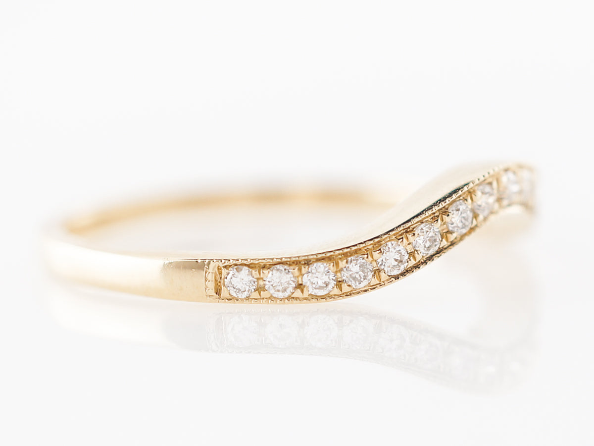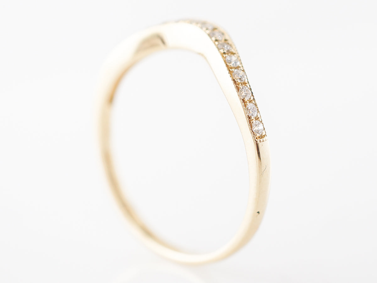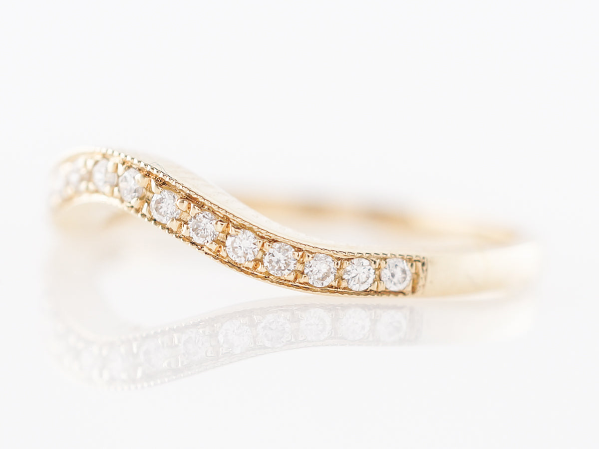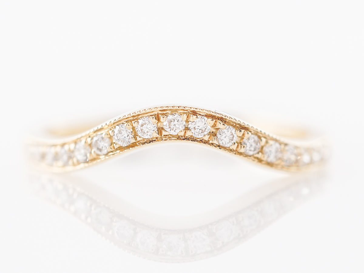 Contoured Diamond Wedding Band in 14k Yellow Gold. This curved diamond wedding band is finished in 14 karat yellow gold. The curve in the band allows a wider engagement ring to fit snuggly against the band. The band features seventeen (17) round brilliant diamonds bead set with milgrain detailing in a single line for a total weight of .13 carats.