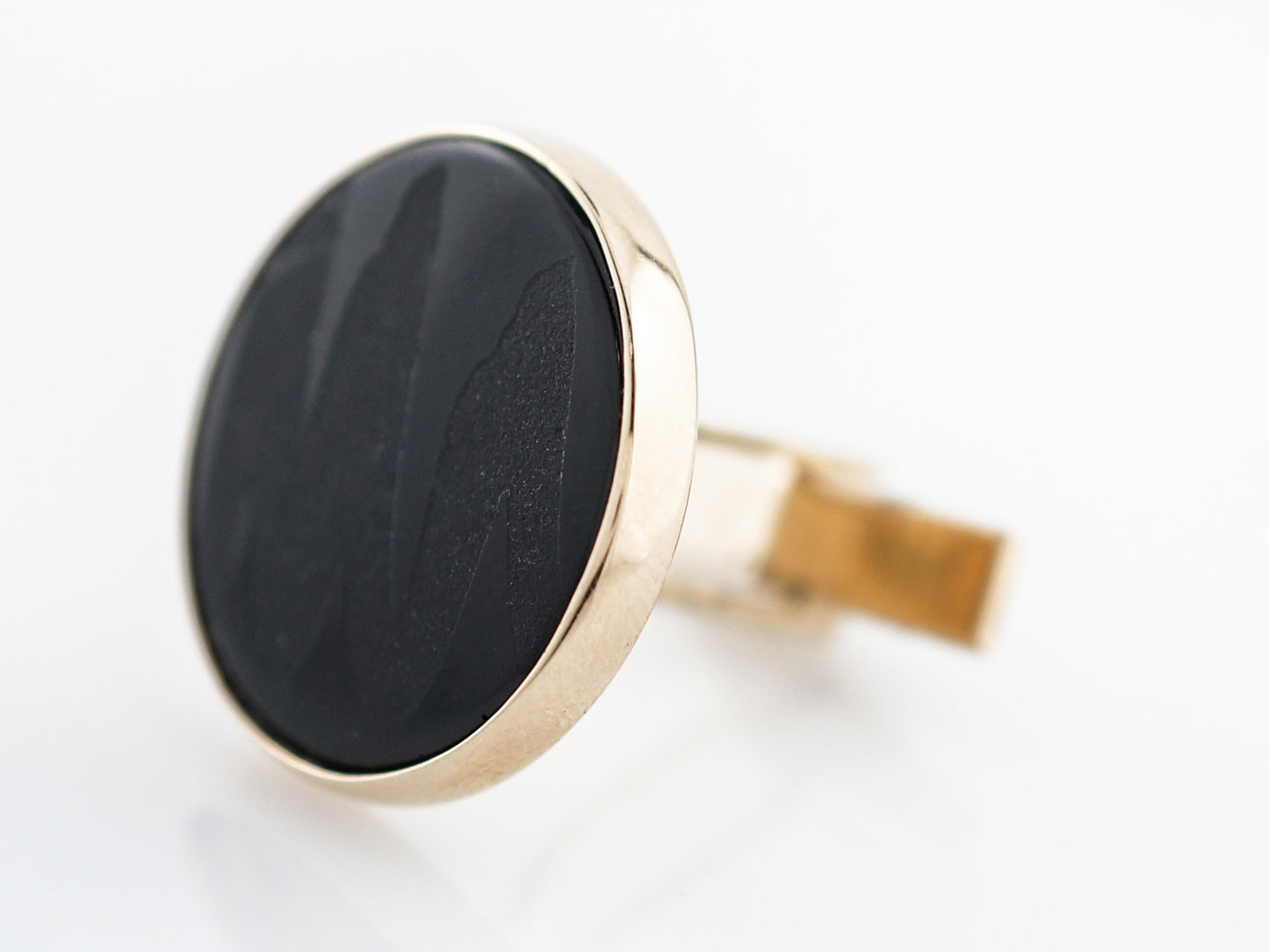 These Modern Era cufflinks feature a funky, retro feel. The onyx gemstones set in 14 karat yellow gold. Dimensional stylish. We love decorative cufflinks because they make lovely future family heirlooms. These accessories elevate your evening attire with class.