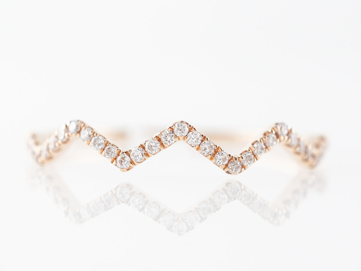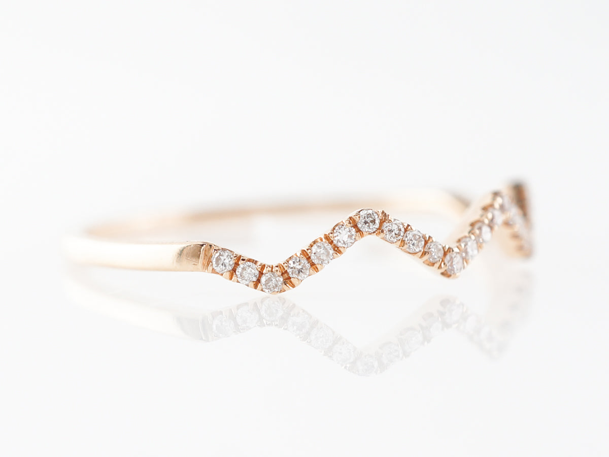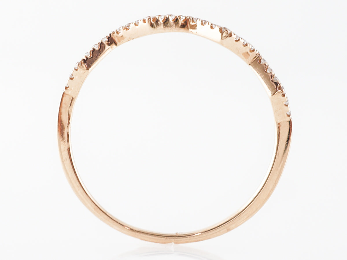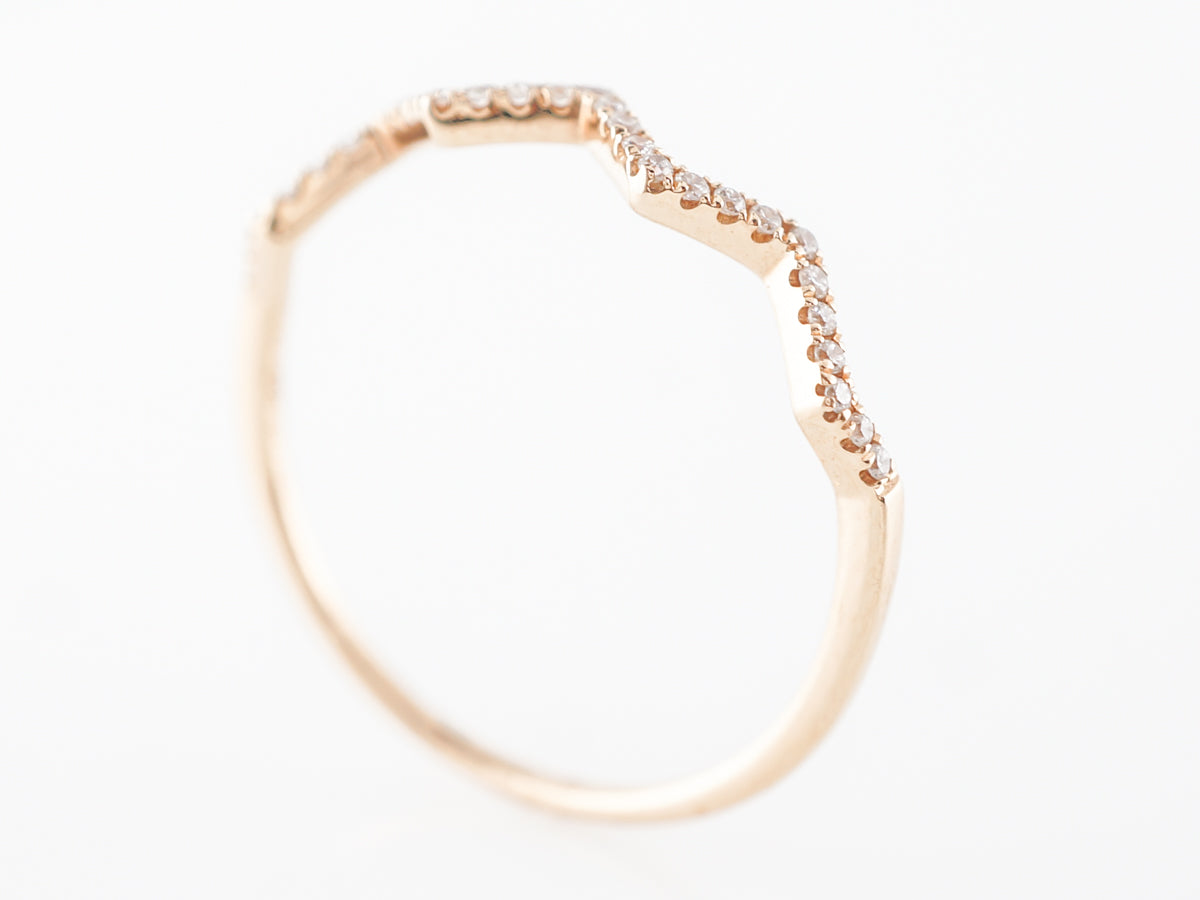 Curved Rose Gold Diamond Wedding Band in 18k. This modern wedding band is made of 18k rose gold and includes 29 round brilliant cut diamonds set with shared prongs for a total diamond weight of .33 carats. The setting angles sharply across the top of the band which could allow for a snug fit with an engagement ring. A curved band can also be a great addition to a stack of bands.